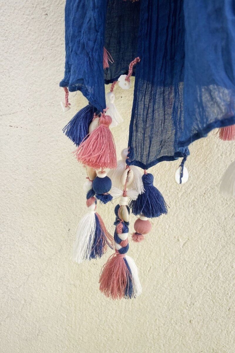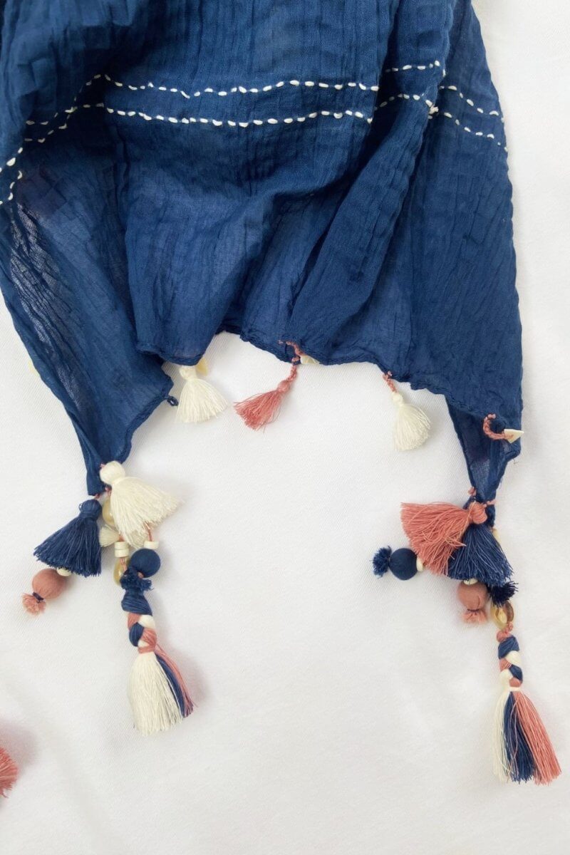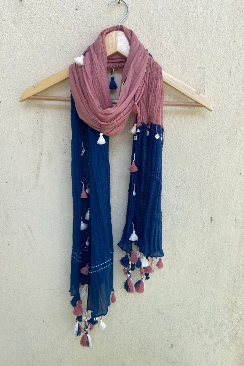 A dual-toned cotton scarf in rose pink and navy, featuring crinkle pleats and handcrafted tassels. Elegant yet playful, it’s a versatile piece for both everyday and festive looks.