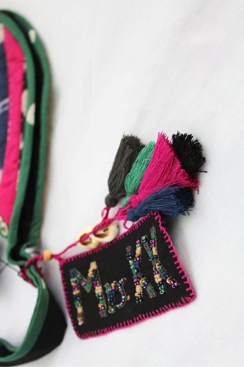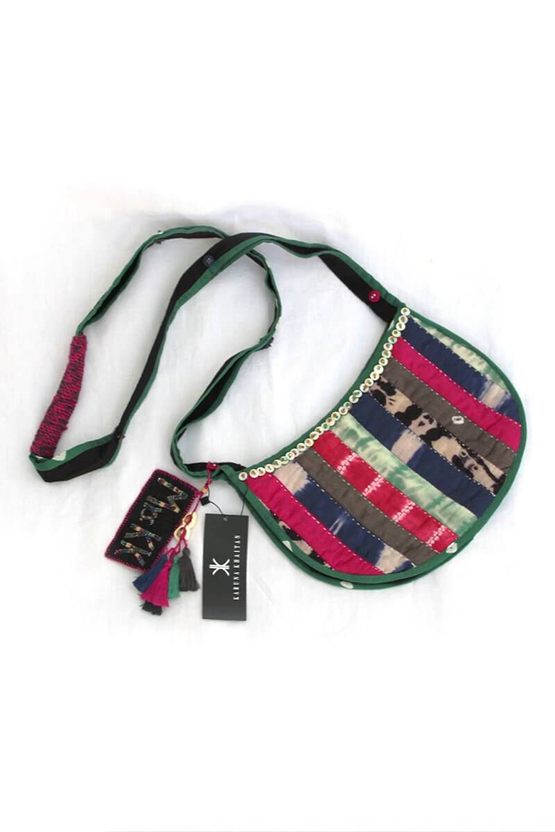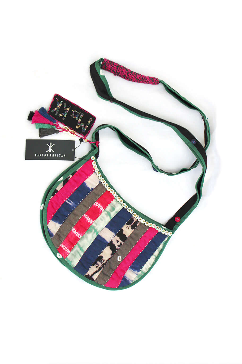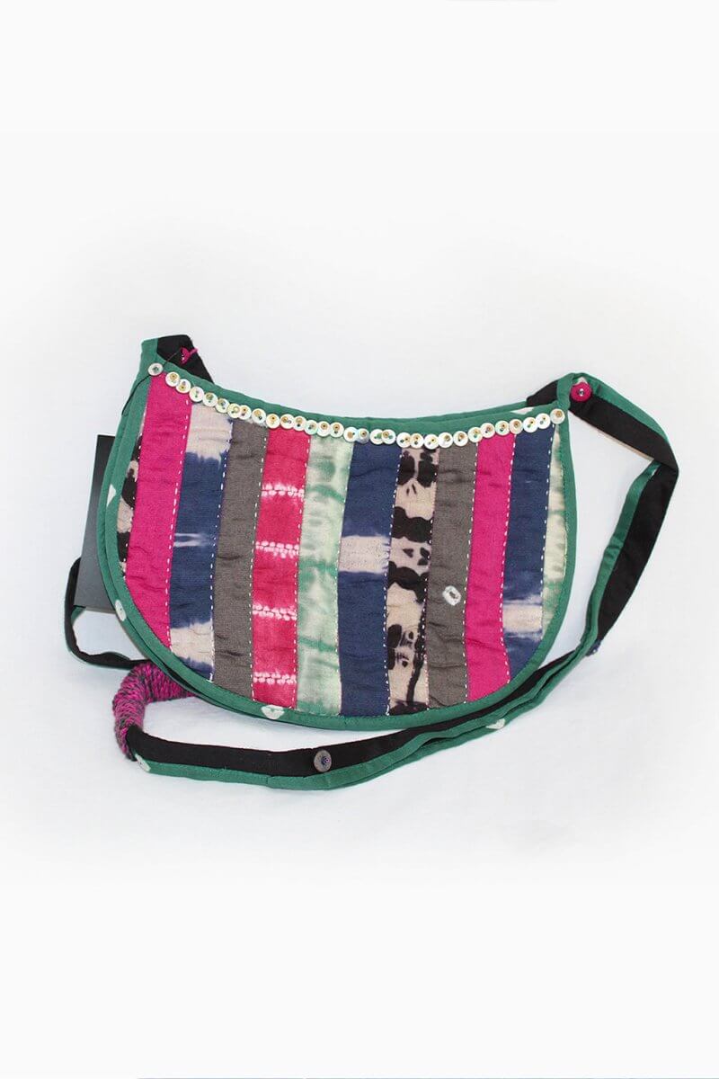 A stylish bag with a crescent shape with decorative white buttons along the edge, showcasing a unique combination of pink, blue, green and grey. It has a long strap embellished with a tassel detail, giving it a bohemian flair and adding perfection.