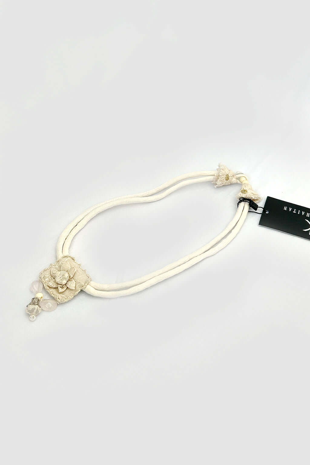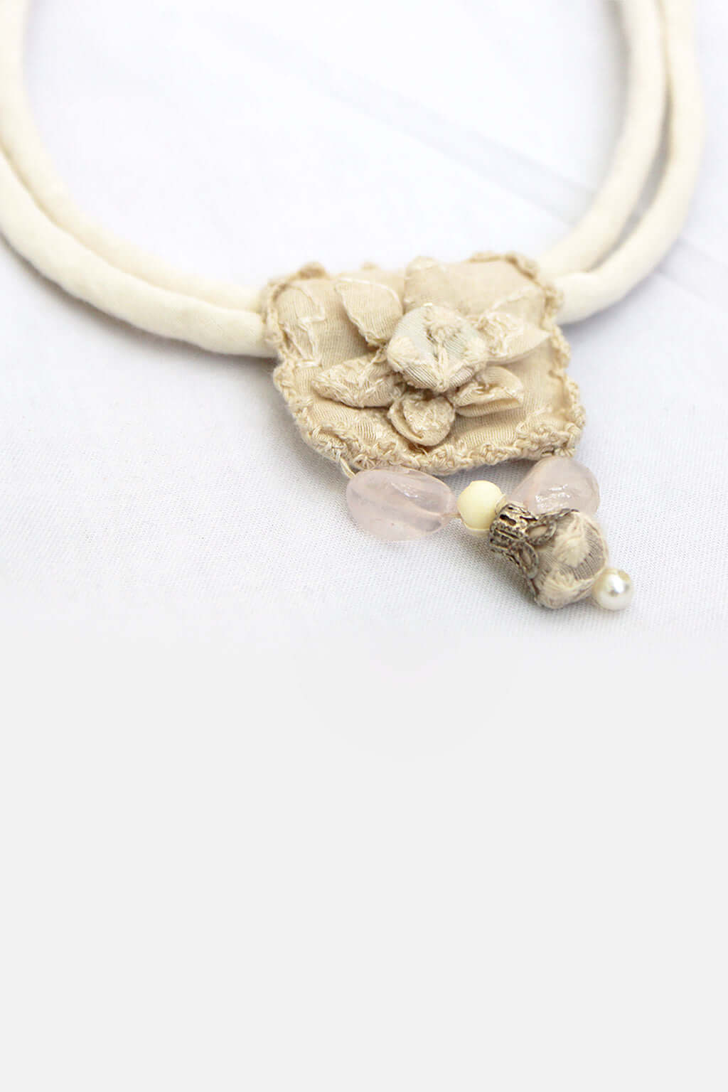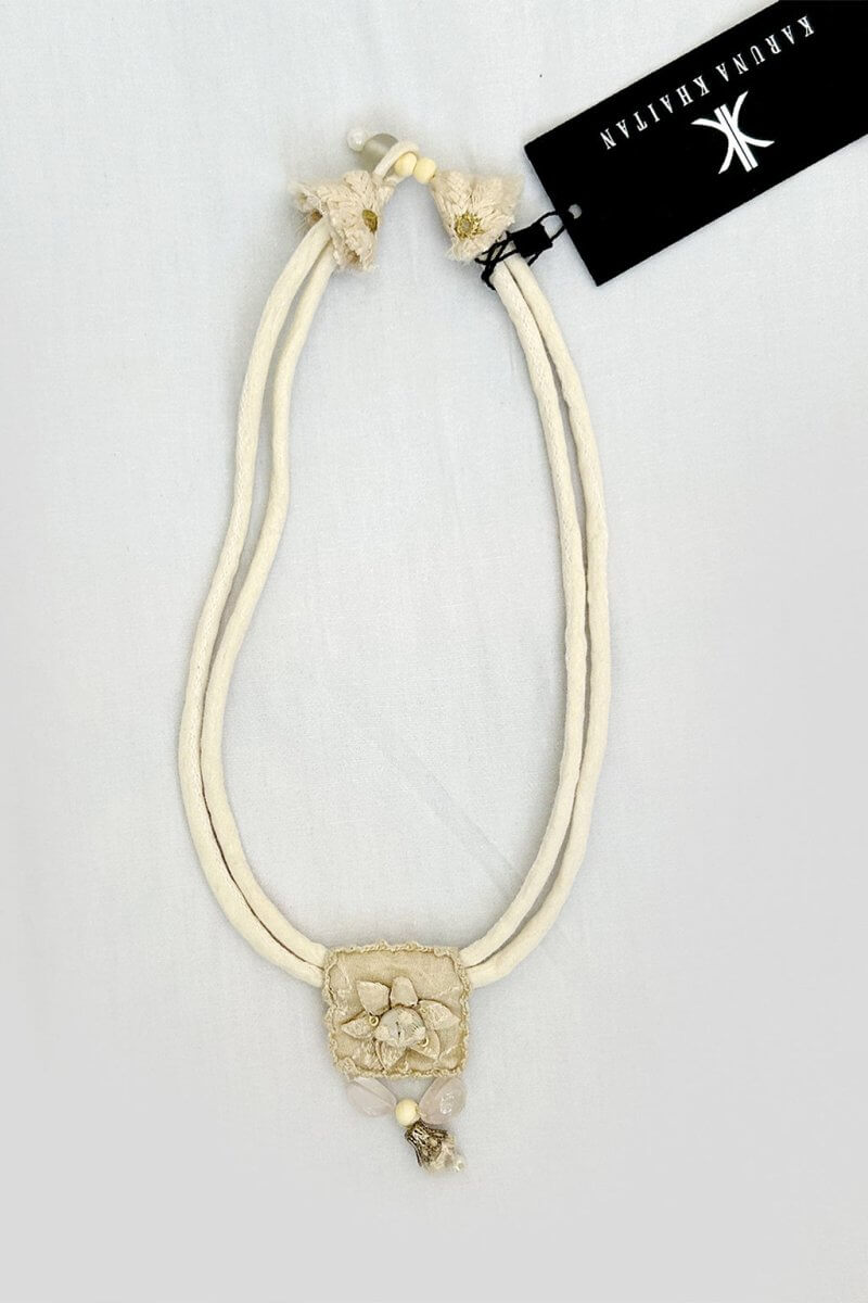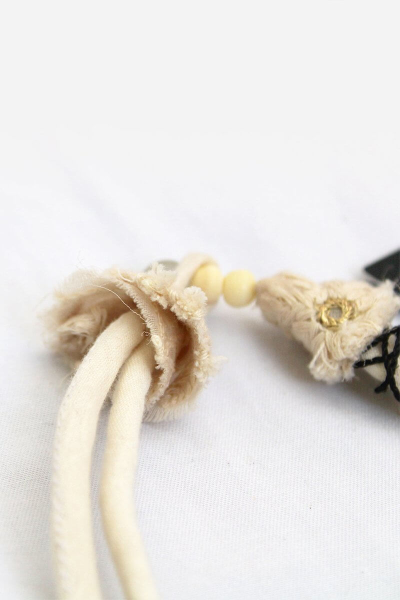 A multi-colored neckpiece 100% handmade from left-over fabrics, materials, and threads.
