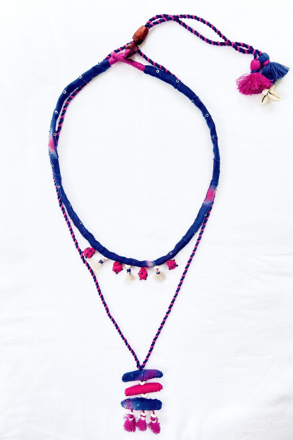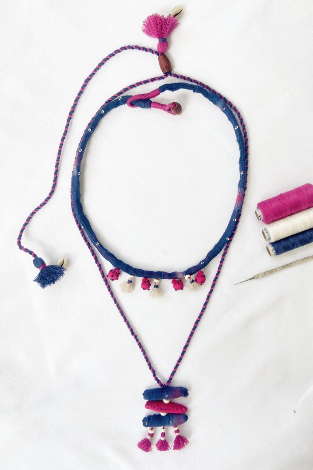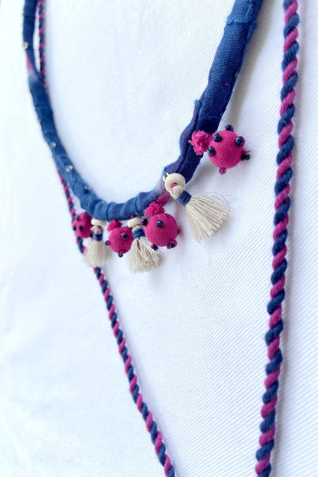 A playful neckpiece in braided magenta and indigo upcycled Chanderi, adorned with tassels, shells, and mirror accents. Lightweight, joyful, and crafted for conscious everyday wear.