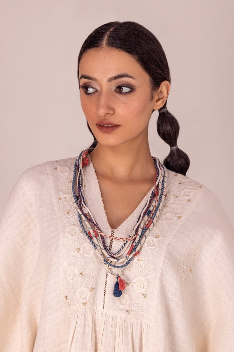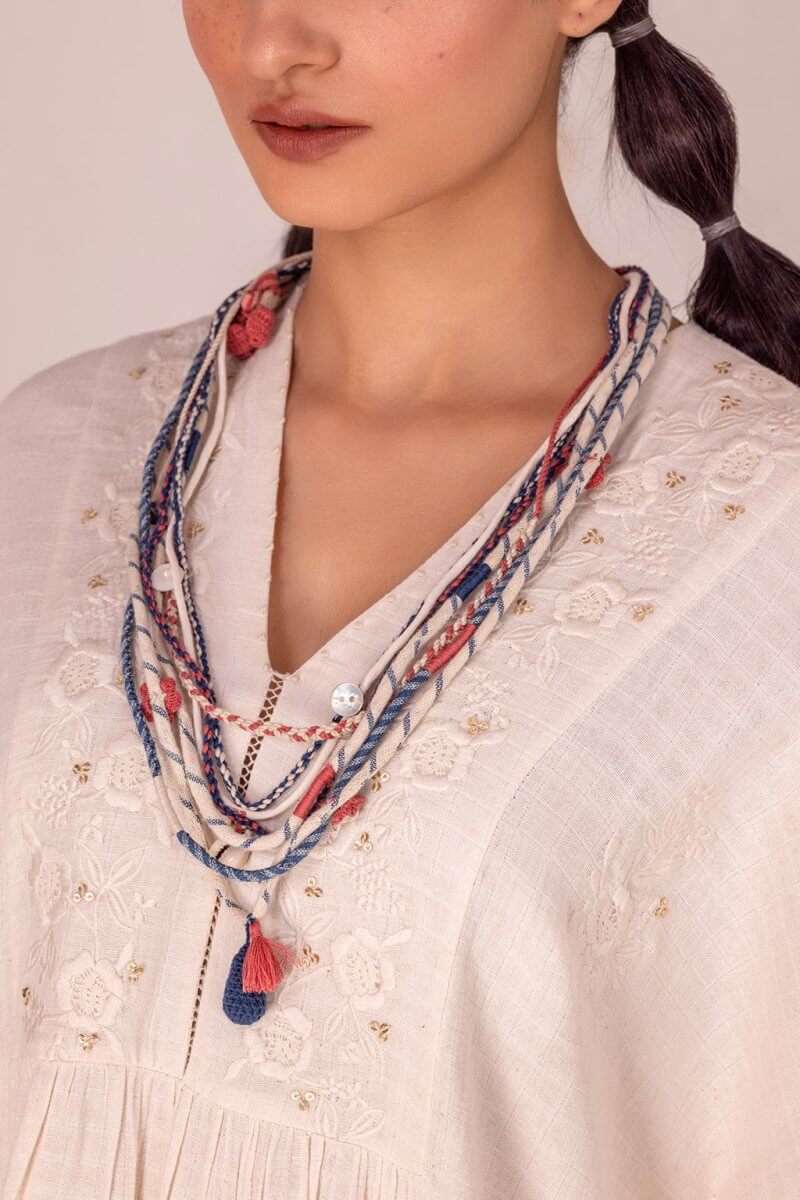 A multi-coloured and multi-layered neckpiece 100% handmade from left-over fabrics, materials and threads.