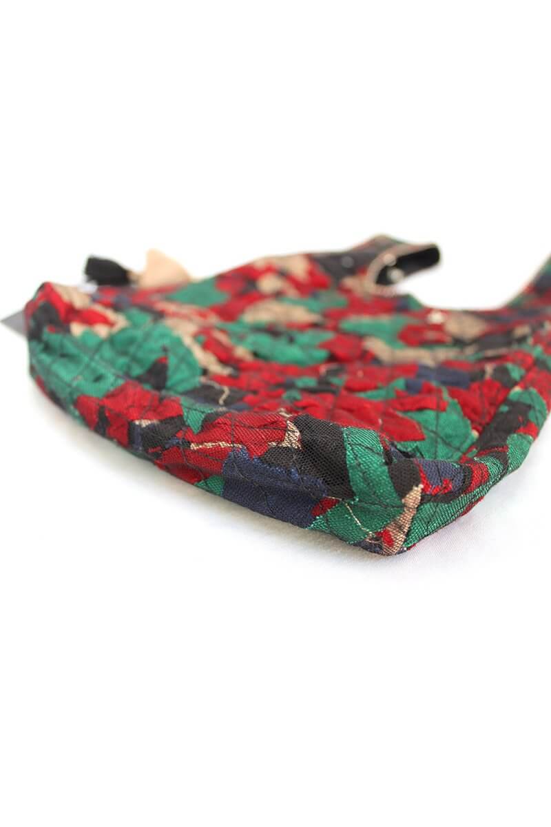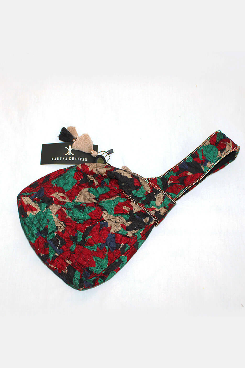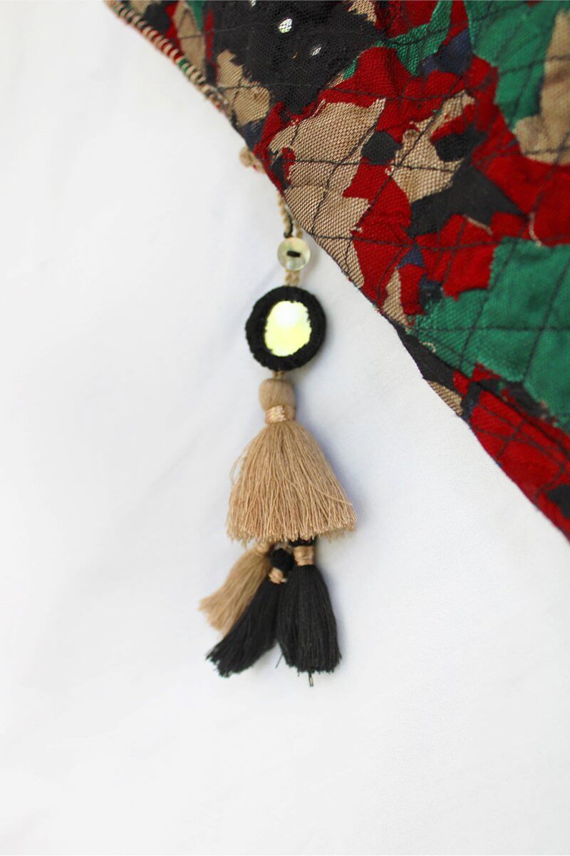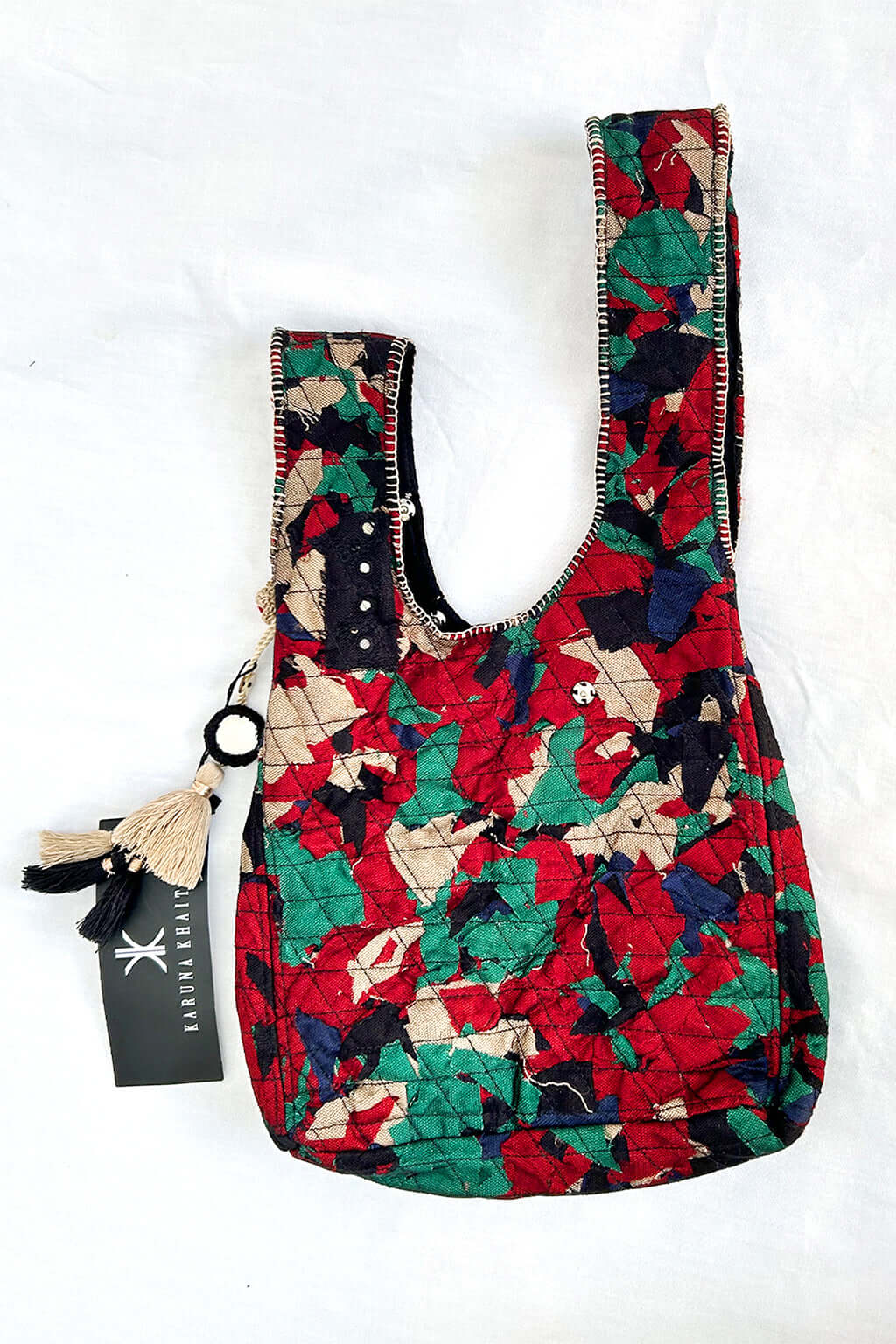 A handcrafted potli bag featuring unique and playful is made from a quilted fabric with a crisscross pattern. It has a distinct shape with a fold-over flap secured by a snap closure. Decorative elements include contrast stitching and a set of colourful tassels hanging from the side. The handle is made from the same quilted fabric, providing a comfortable grip. This bag is ideal for casual outings.