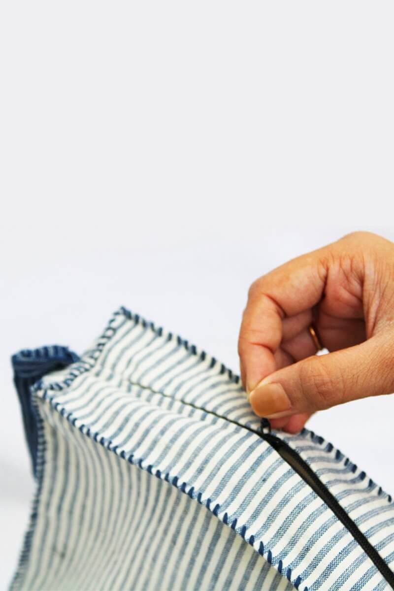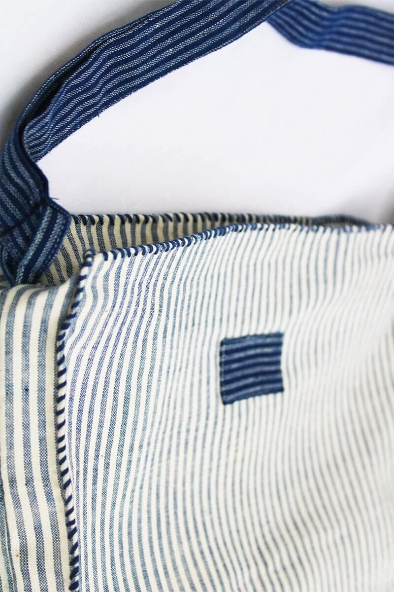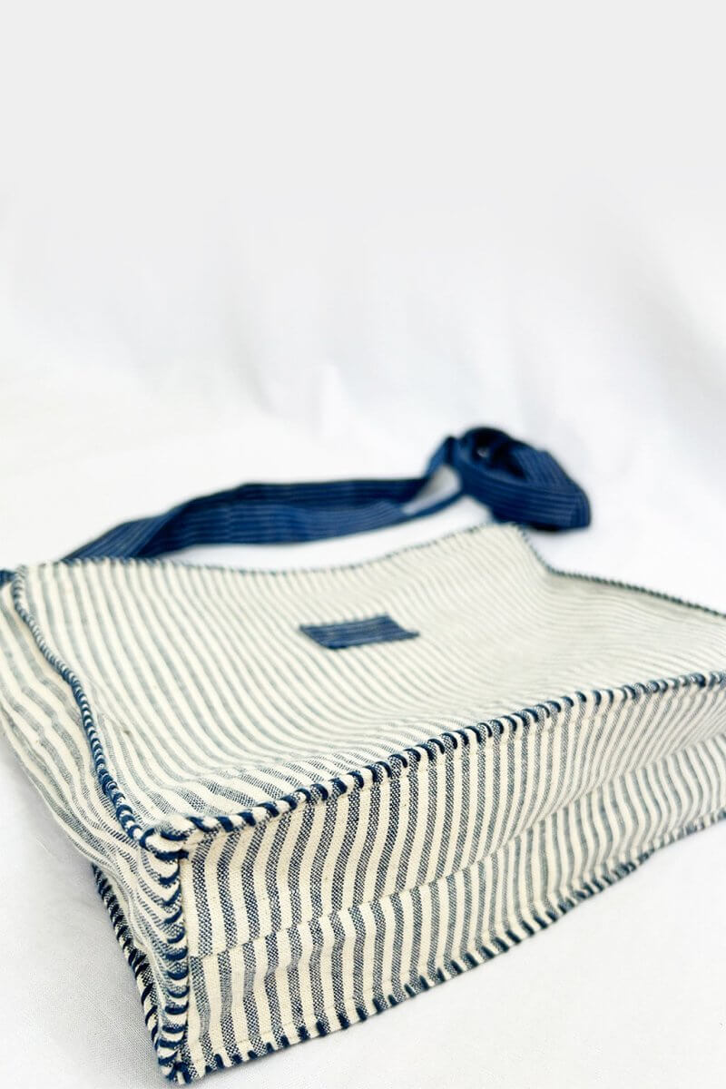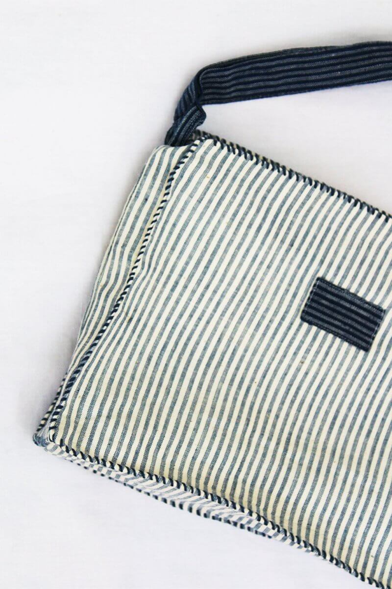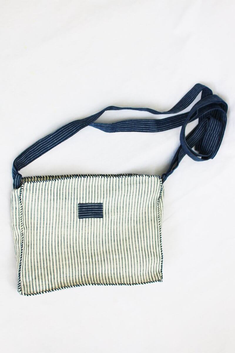 A rectangular shape bag features a pattern of vertical stripes in blue and white. The stitching around the edges provides a contrasting border. The pack includes a long, adjustable strap made from the blue and white striped fabric. This bag is ideal for casual outings.