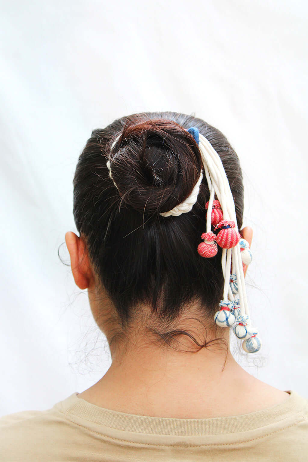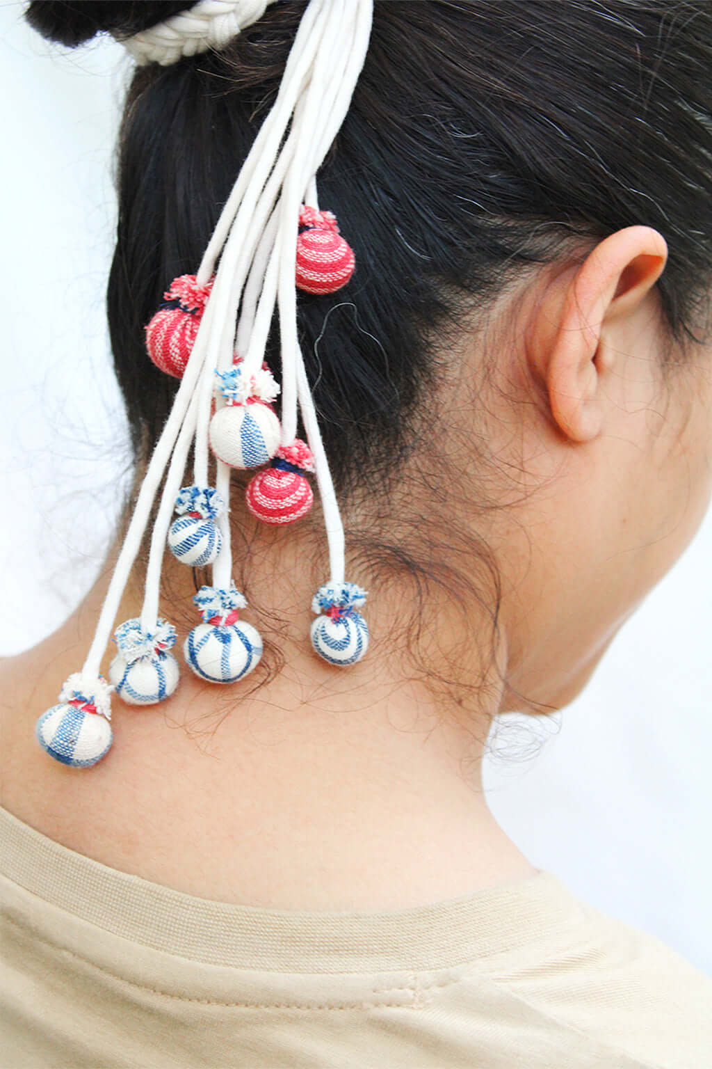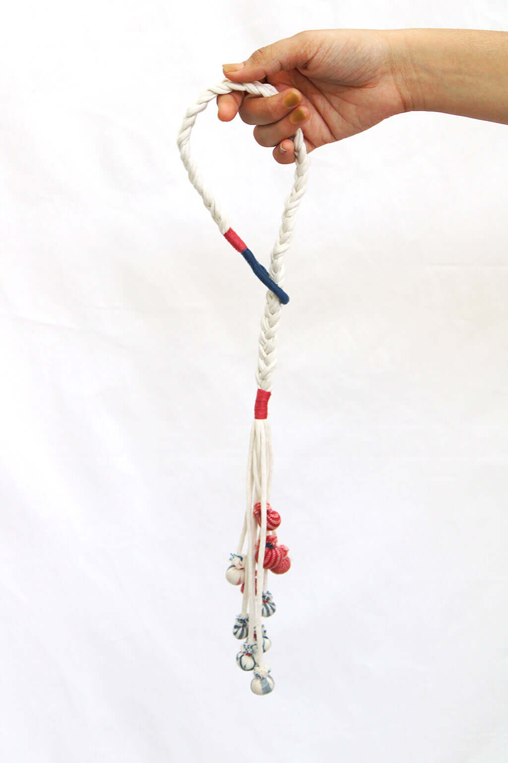 A Multi-coloured and multi-layered braided head accessory is 100% hand made and it's made up of the left-over fabrics, materials and threads used while making our collections.
