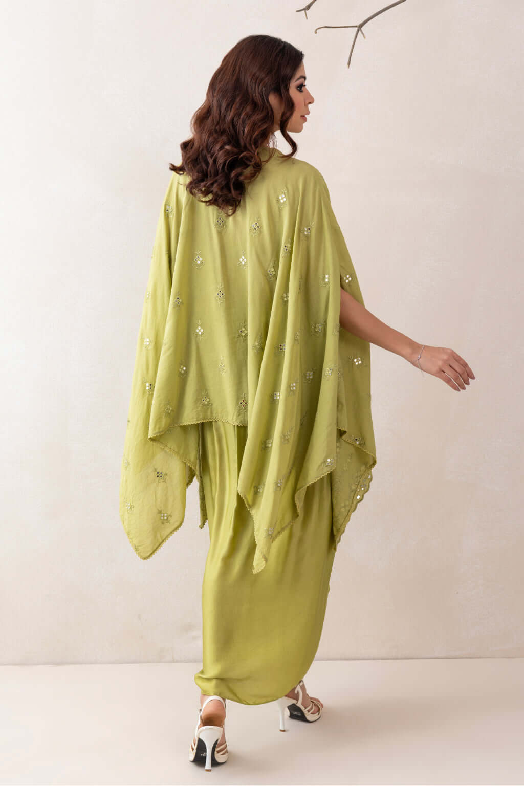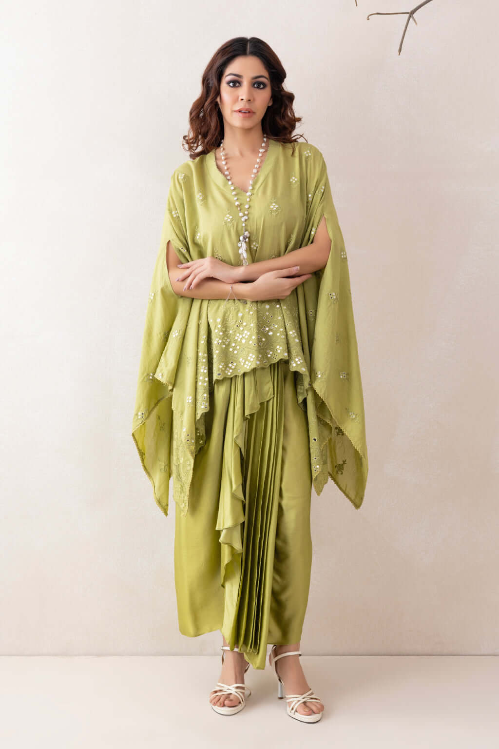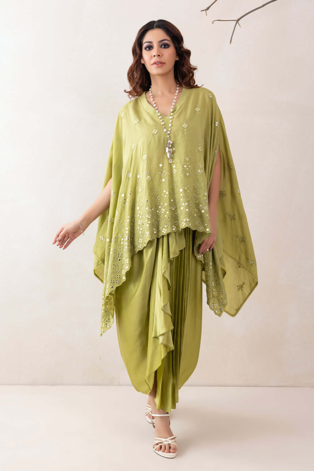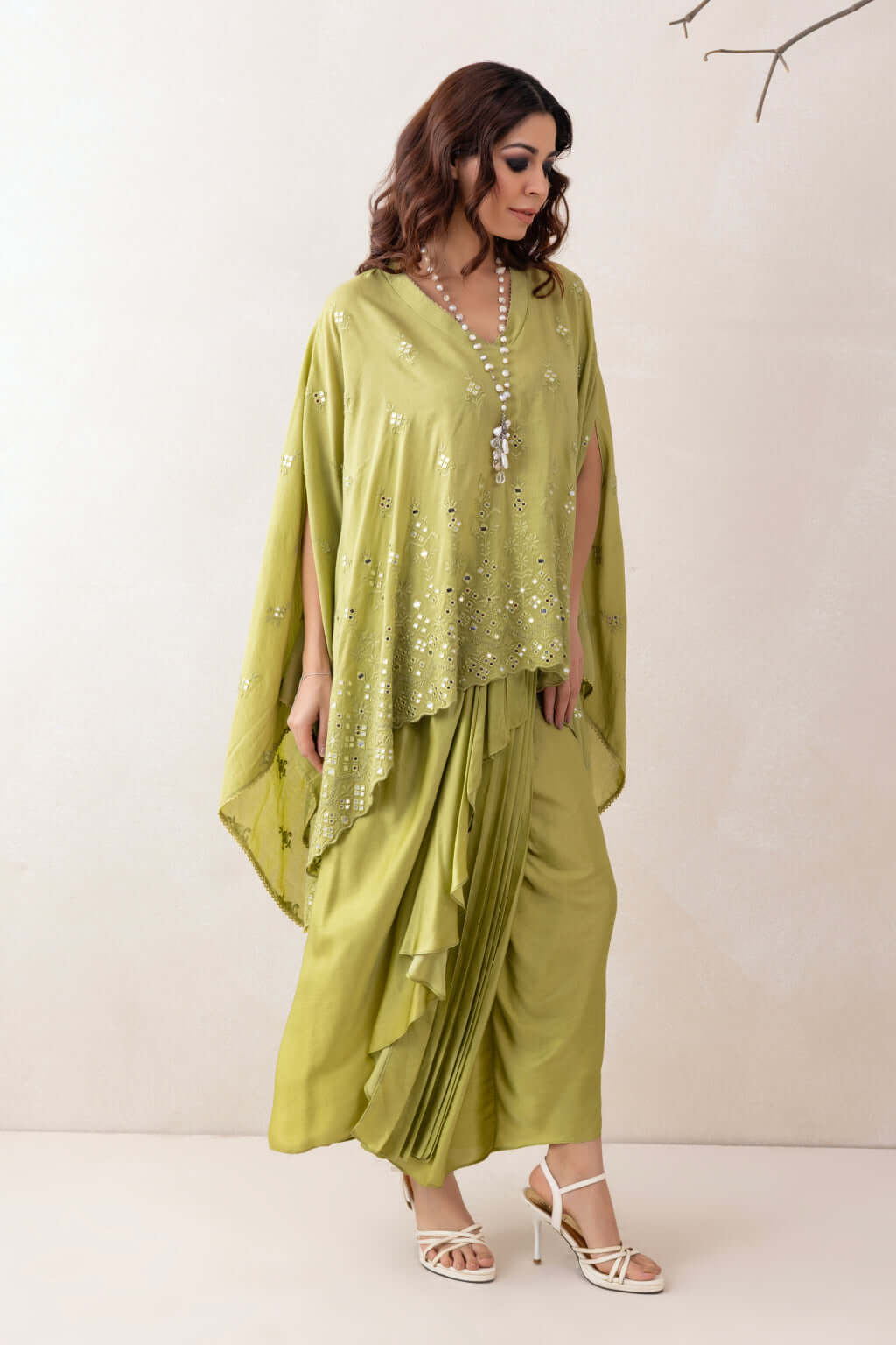 A kaftan-style top crafted in soft Sushi voile, featuring delicate mirror embellishments and a flattering V-neckline enhanced with intricate crochet detailing. Paired with a stylised draped skirt designed to resemble a dhoti, this ensemble blends traditional charm with contemporary elegance.