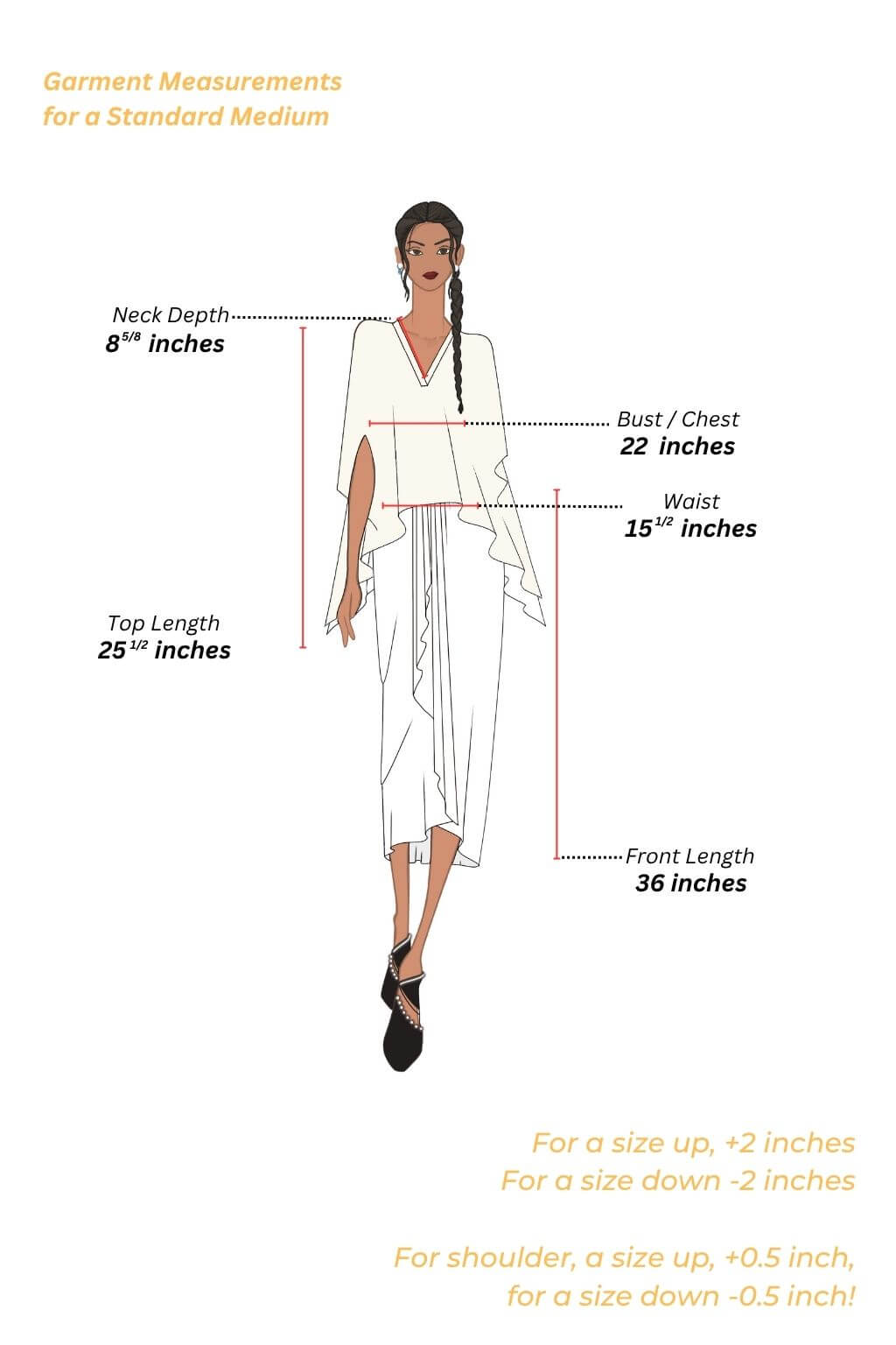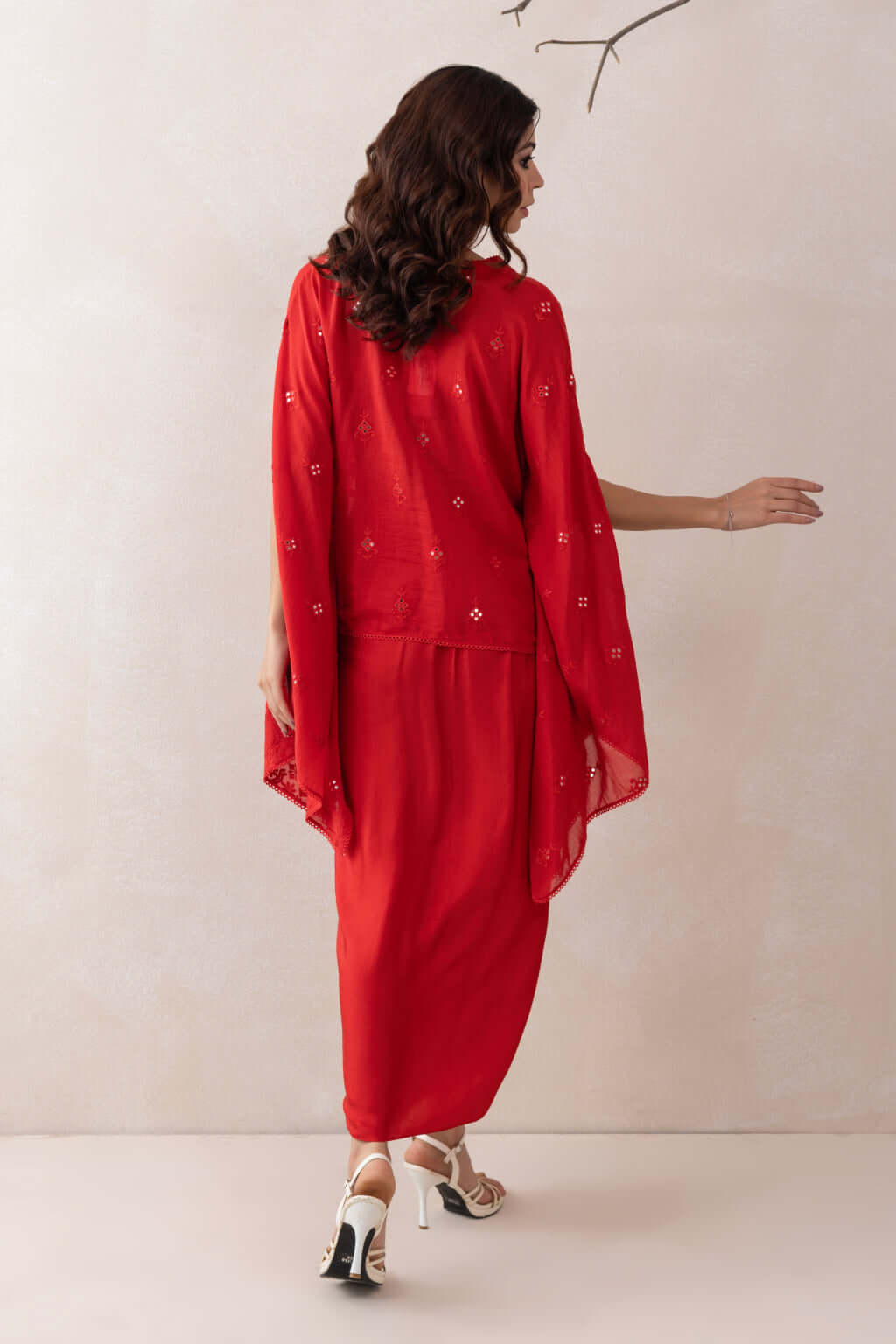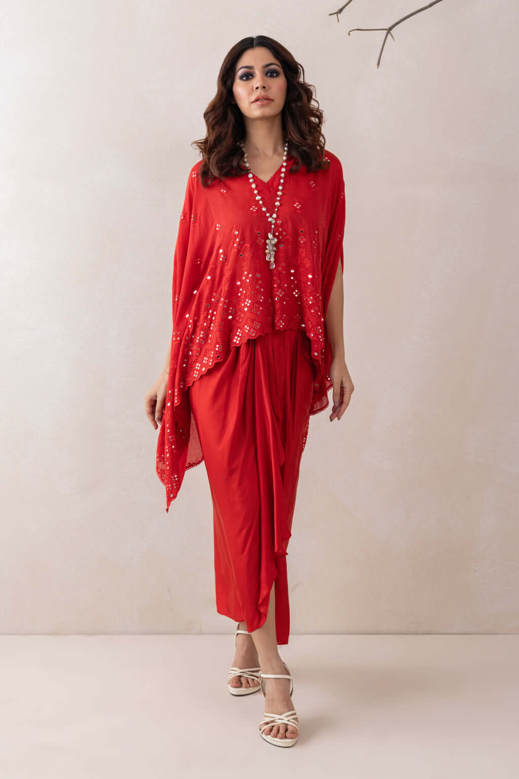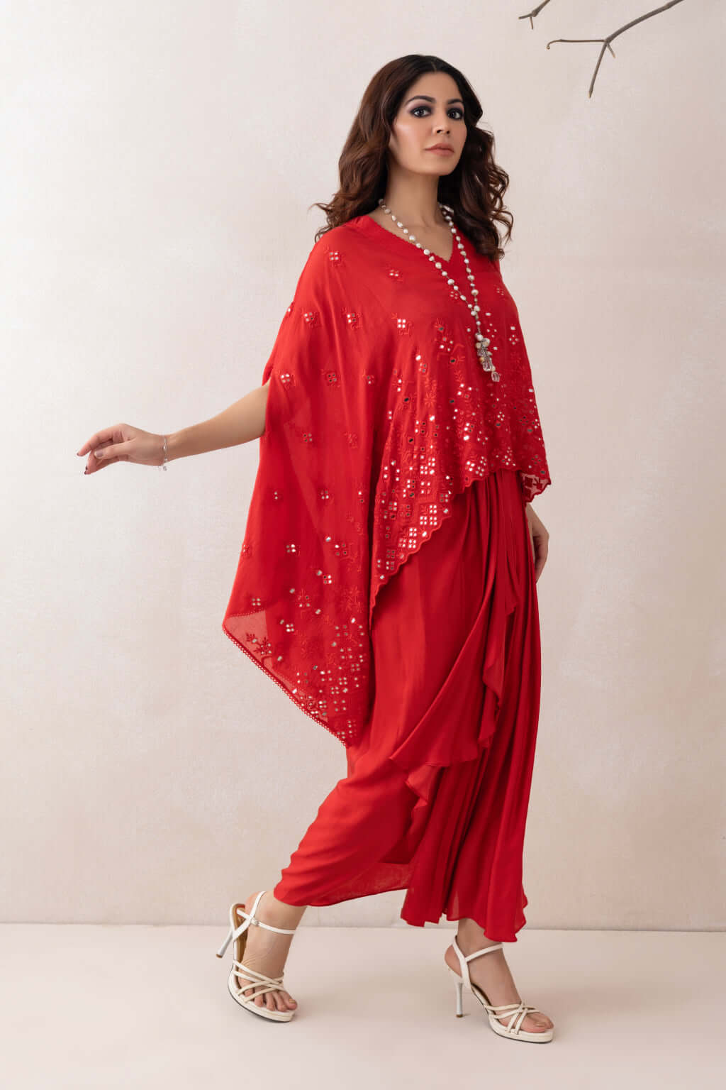 A kaftan-style top crafted in soft Sushi voile, featuring delicate mirror embellishments and a flattering V-neckline enhanced with intricate crochet detailing. Paired with a stylised draped skirt designed to resemble a dhoti, this ensemble blends traditional charm with contemporary elegance.