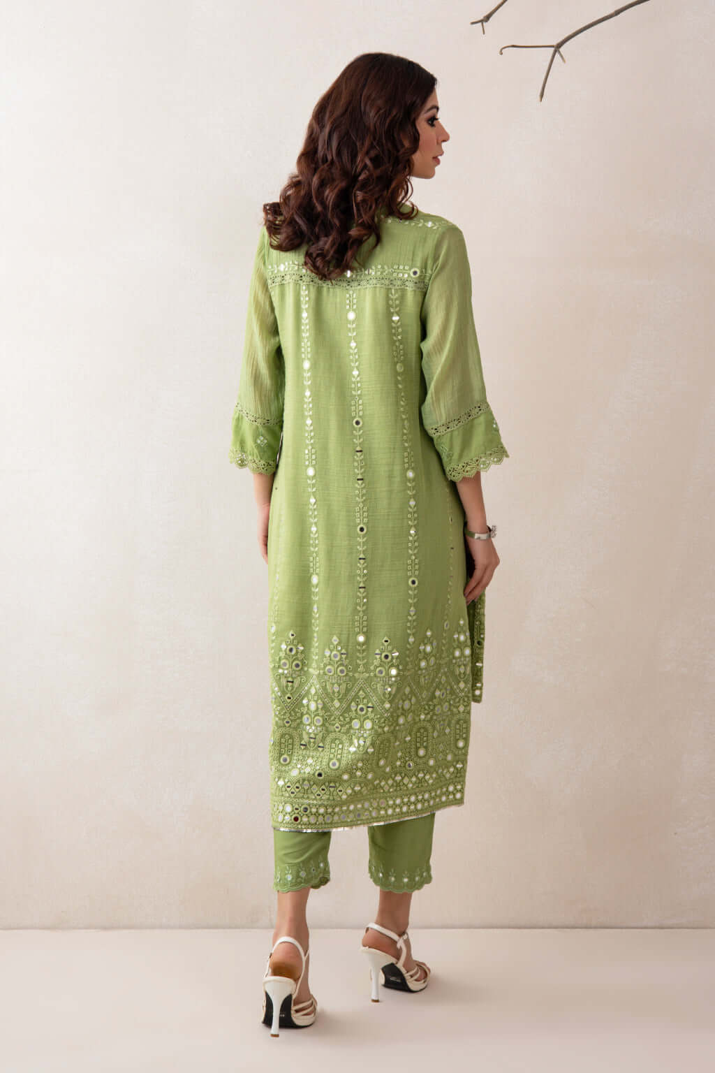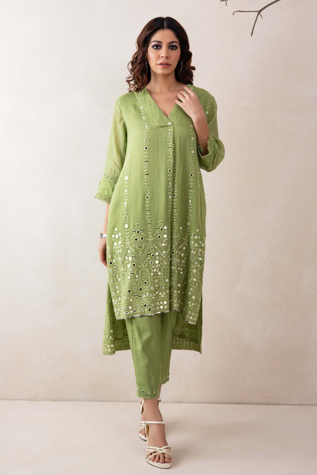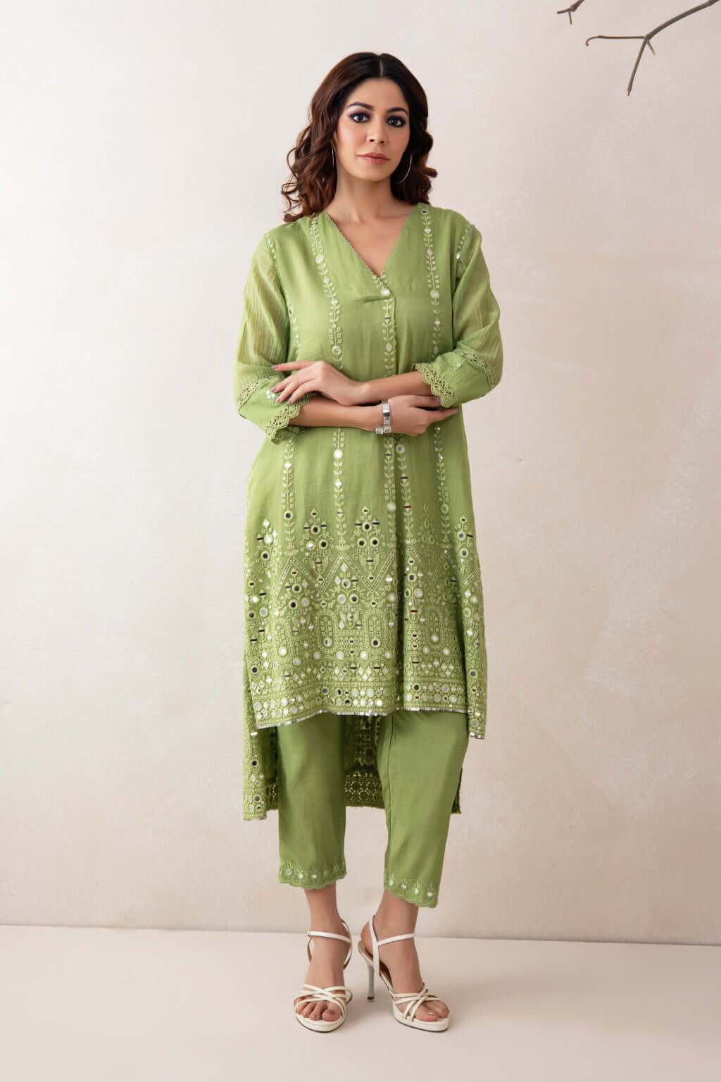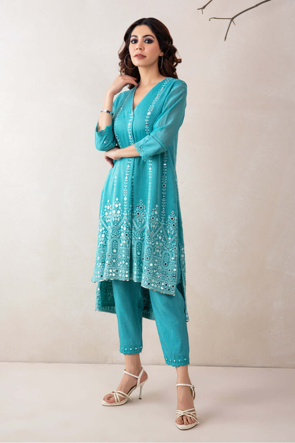 A stylish V-neckline tunic set featuring a high-low silhouette- shorter in the front and longer at the back-crafted in elegant Chanderi fabric and adorned with delicate mirror work. Paired with straight-cut pants in soft PS fabric, highlighted with matching embroidery and a scalloped hem for a refined and cohesive finish.