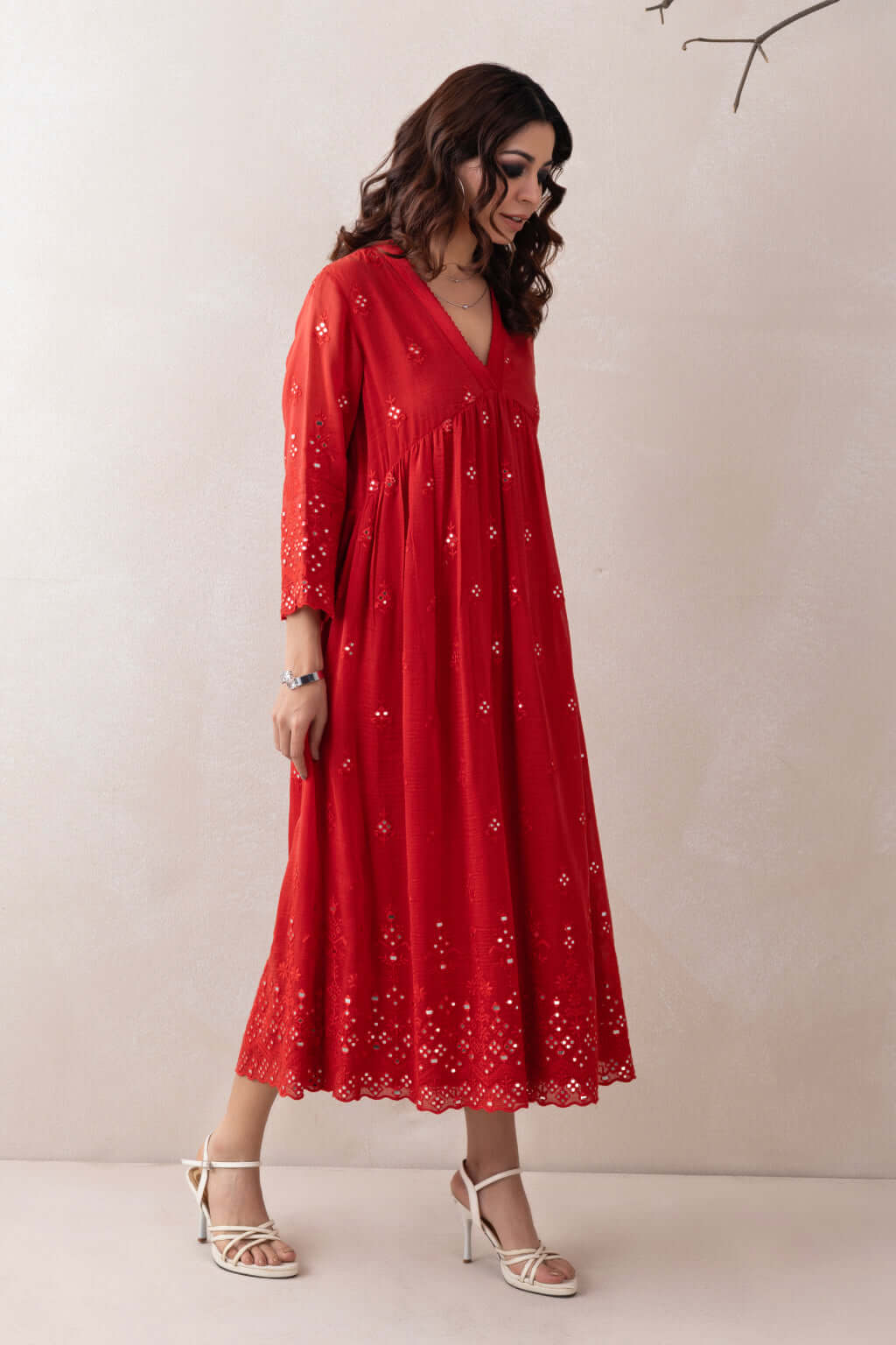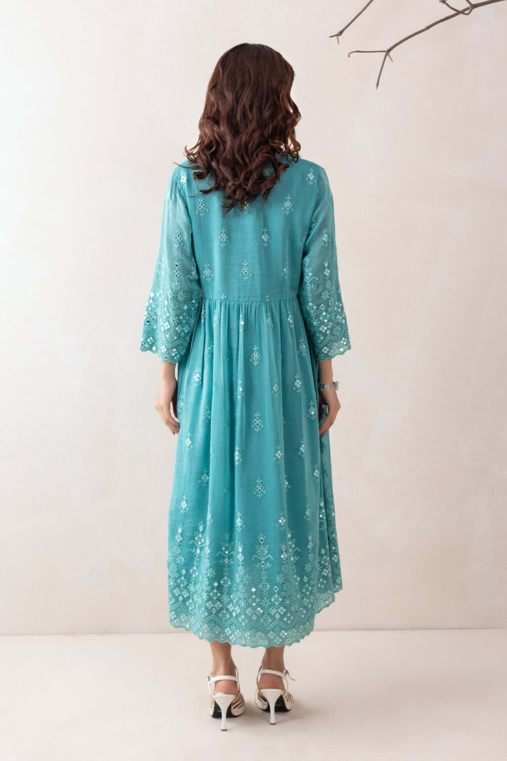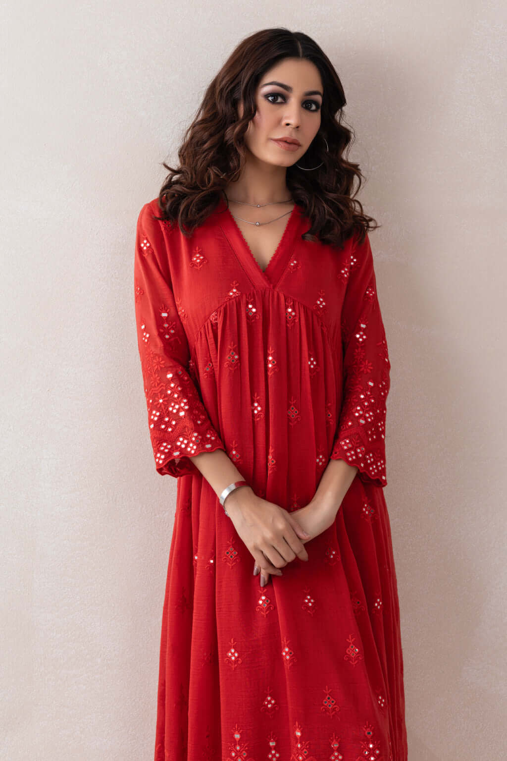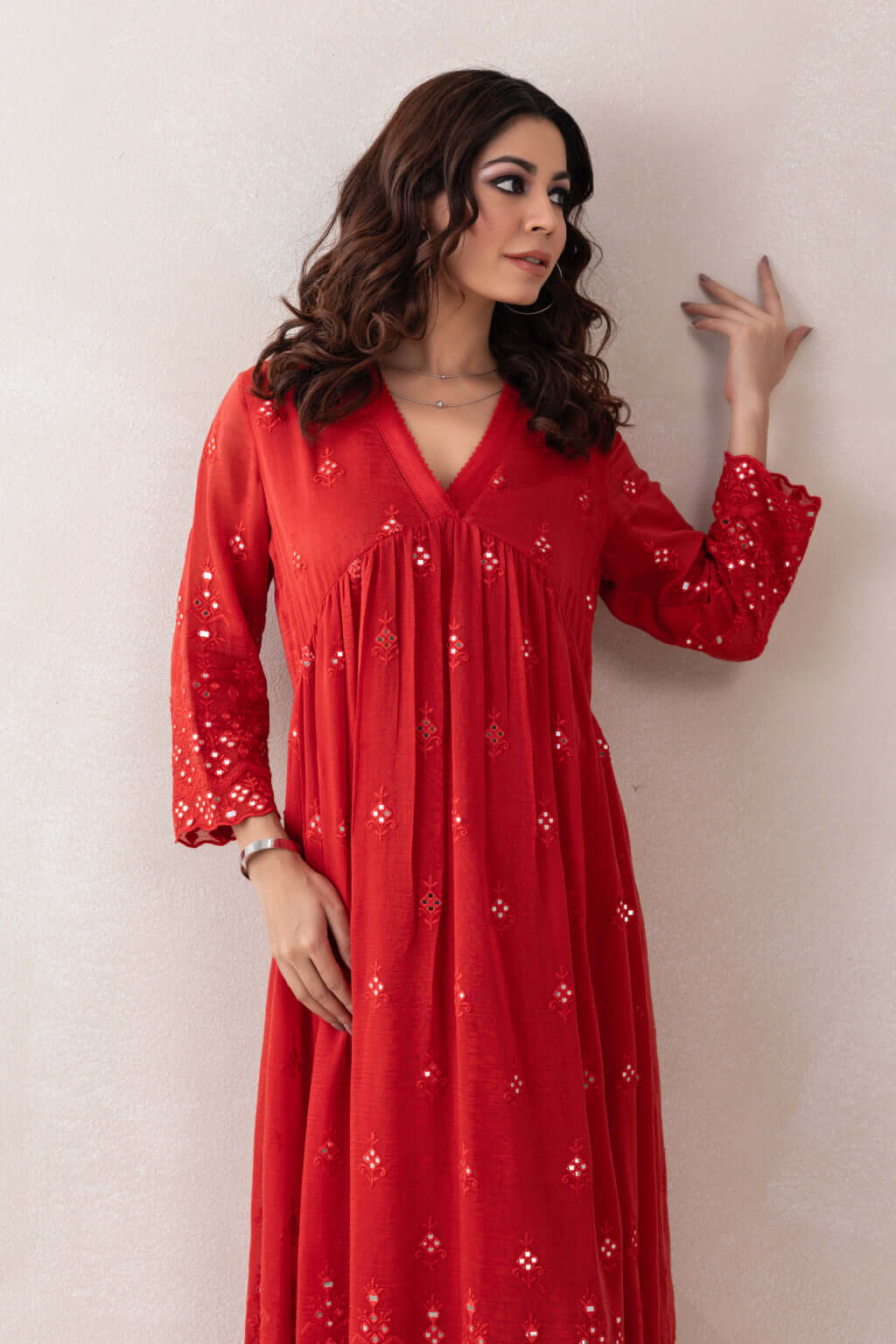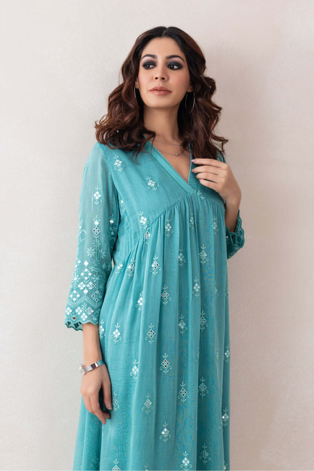 A gracefully designed dress featuring a flattering V-neckline, adorned with intricate crochet detailing. Crafted from luxurious Chanderi fabric, the ensemble is further elevated with exquisite mirror work embellishments that add a touch of sparkle and traditional charm, making it a perfect blend of elegance and artisanal craftsmanship.