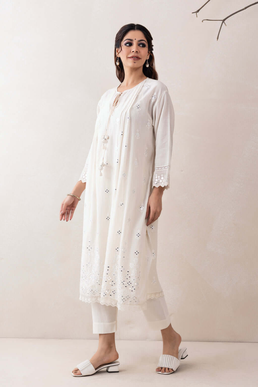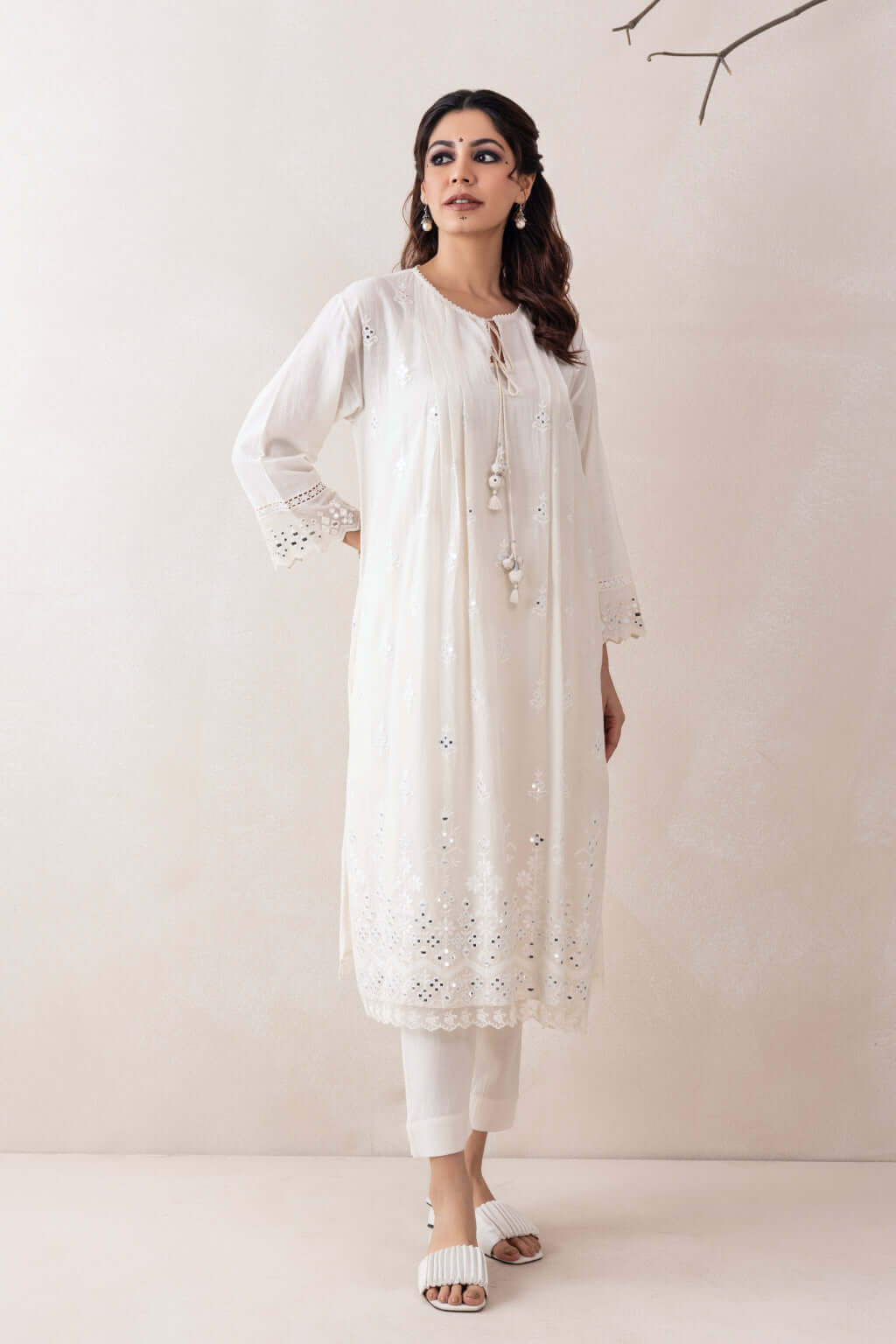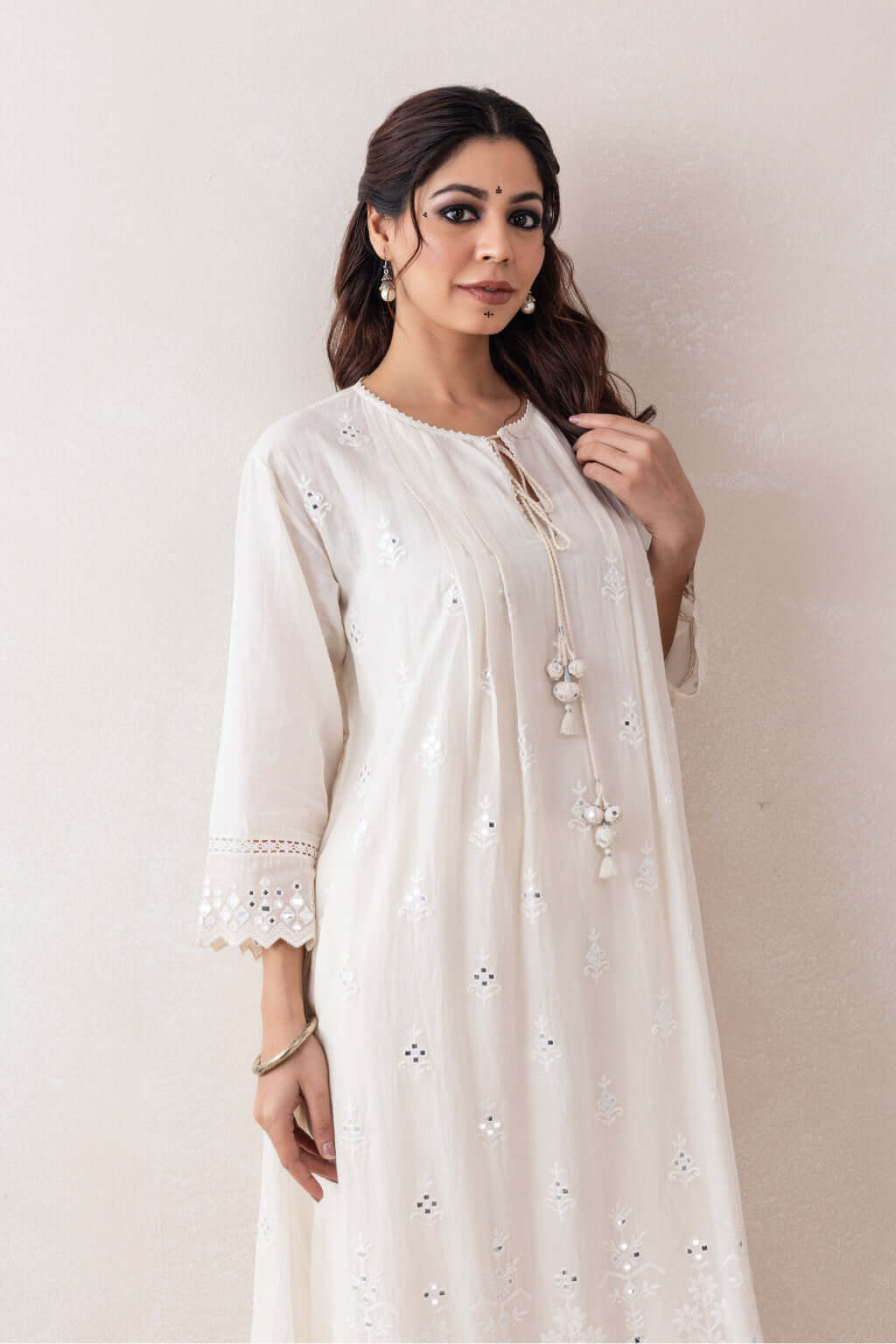 A two-piece set featuring a tunic in soft Sushi voile, adorned with an all-over scattered mirror pattern. The tunic showcases pleated detailing at the yoke and a tie-up neckline accented with tassels for a charming touch. The set is completed with a matching slip, offering a balanced blend of comfort and elegance.