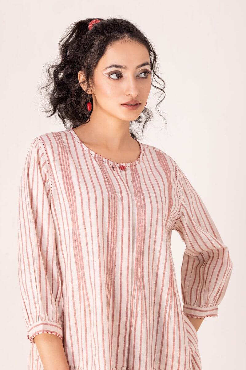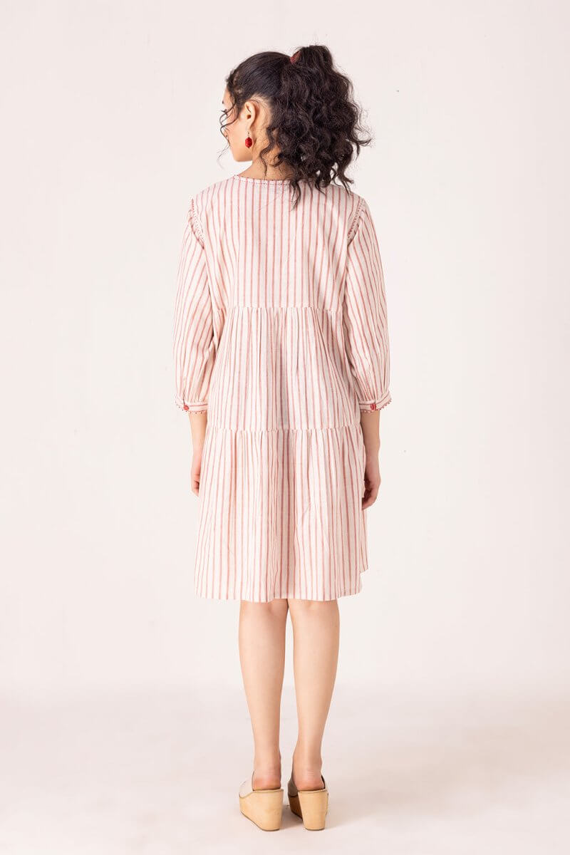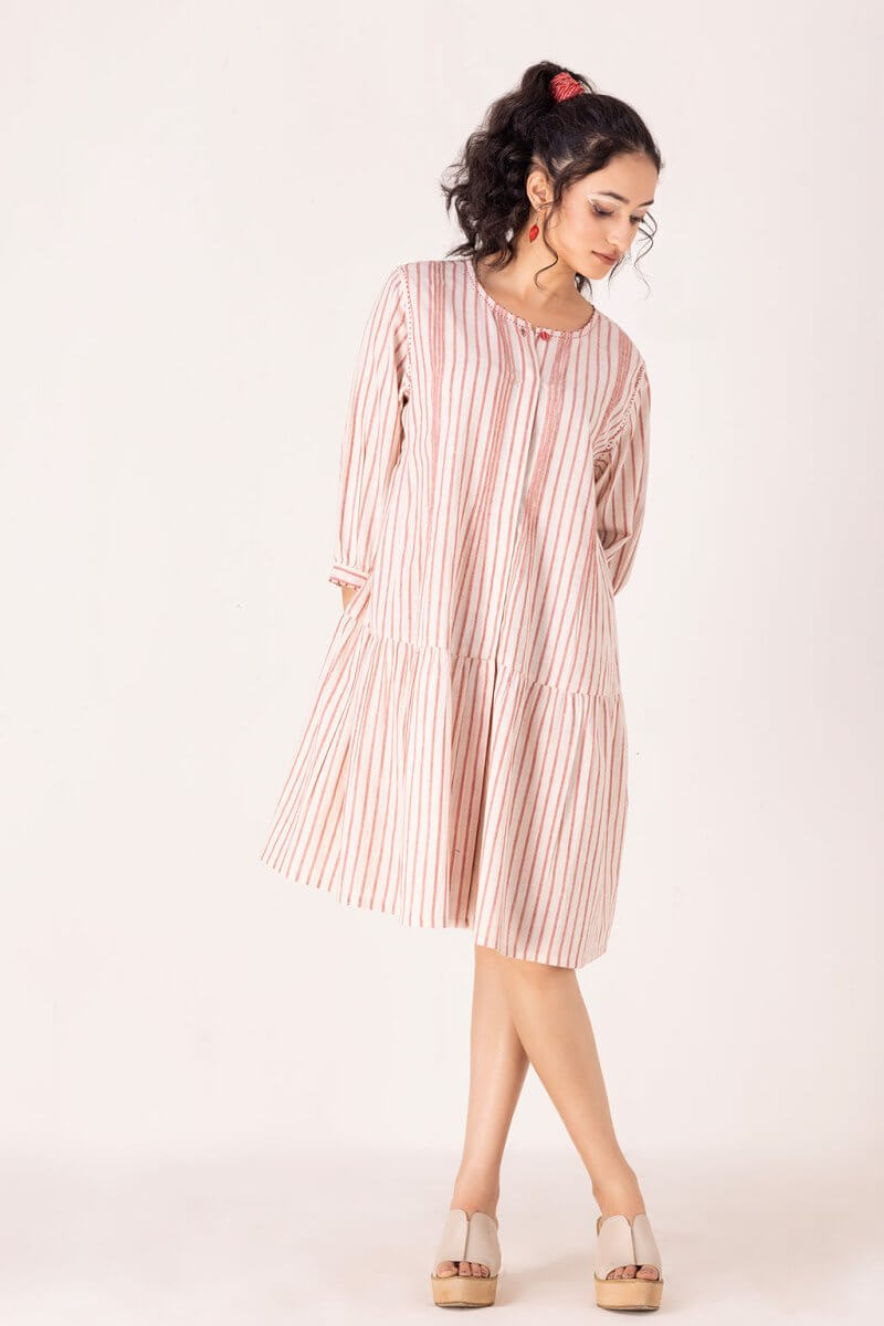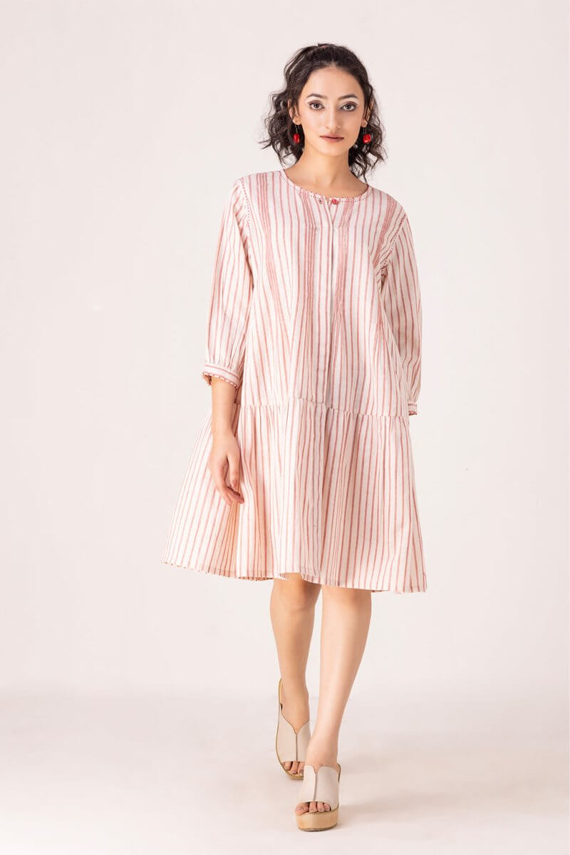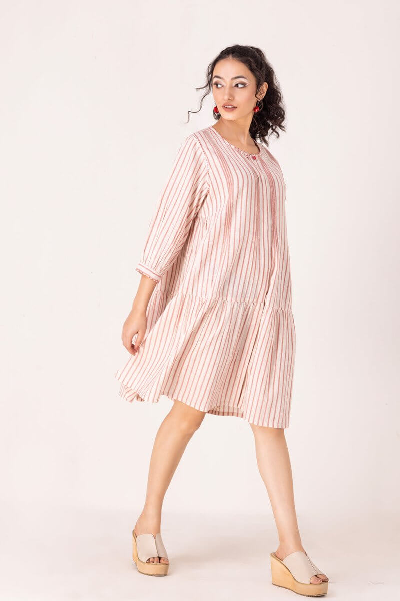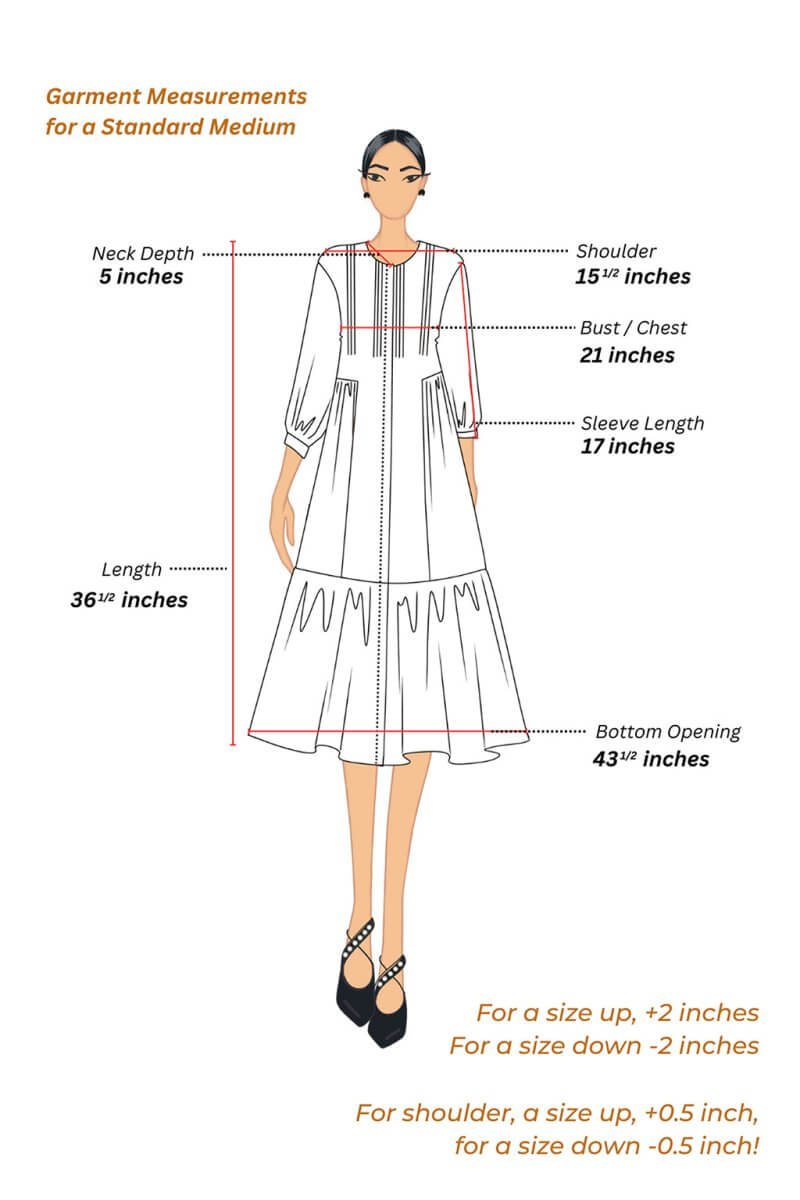A short knee-length playful dress featuring pin-tucks in the front, adding charm and subtle texture to the design. It provides a classic and versatile round neckline adorned with kantha and knots. It has a front opening with a concealed placket to it. 3/4 th sleeves offer an elegant and balanced look. This dress includes convenient pockets with thread hand detailing. It has a flattering flare silhouette ensuring comfort. The bottom of the garment is finished with intricate hemming.