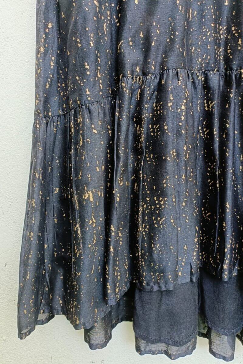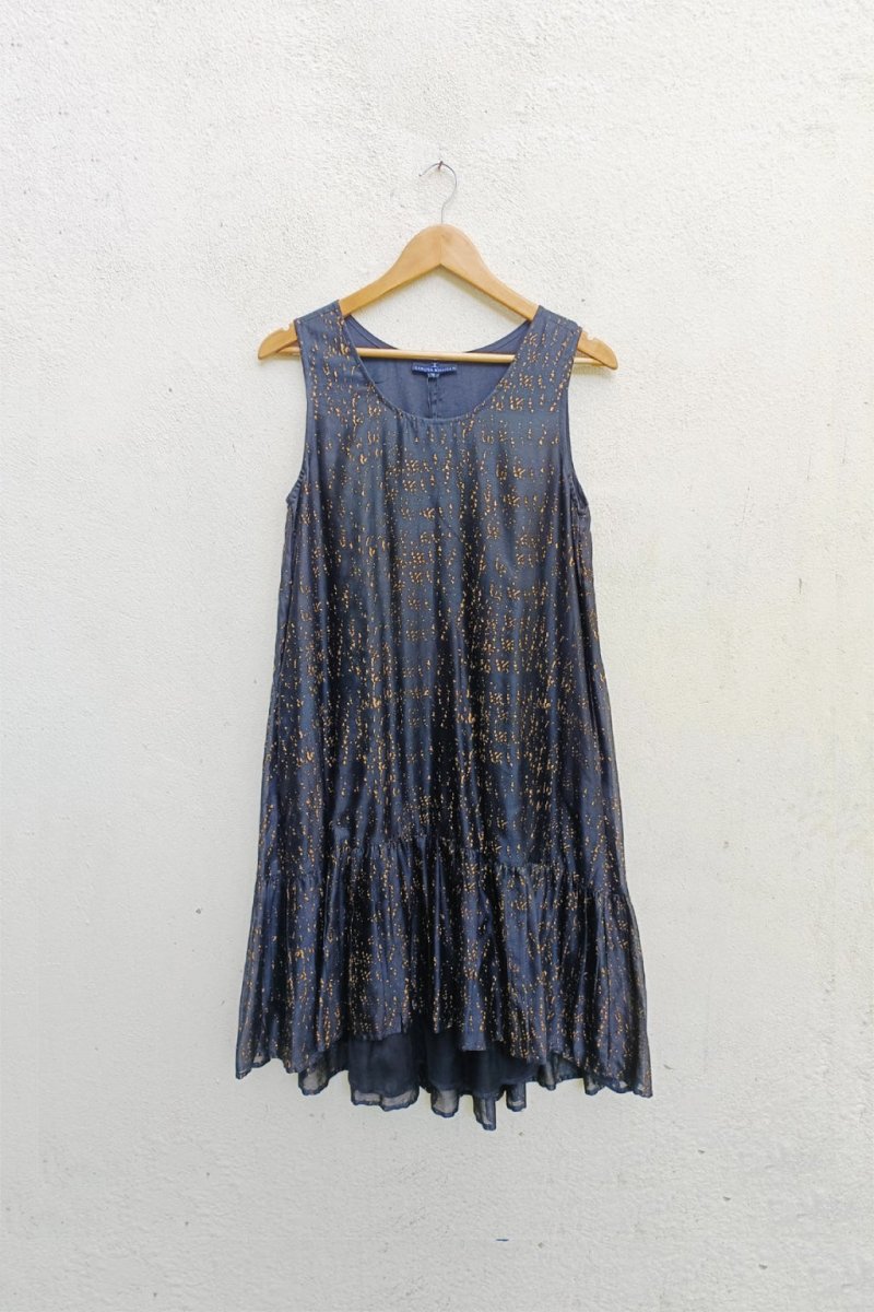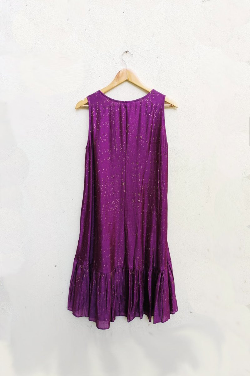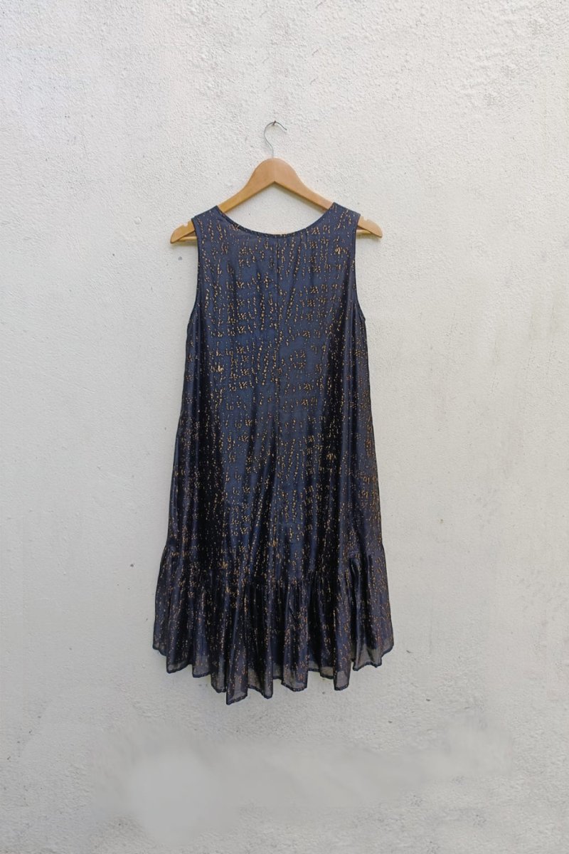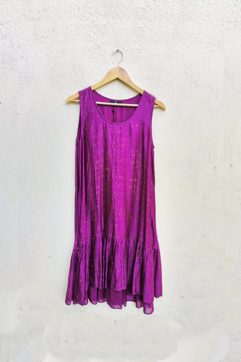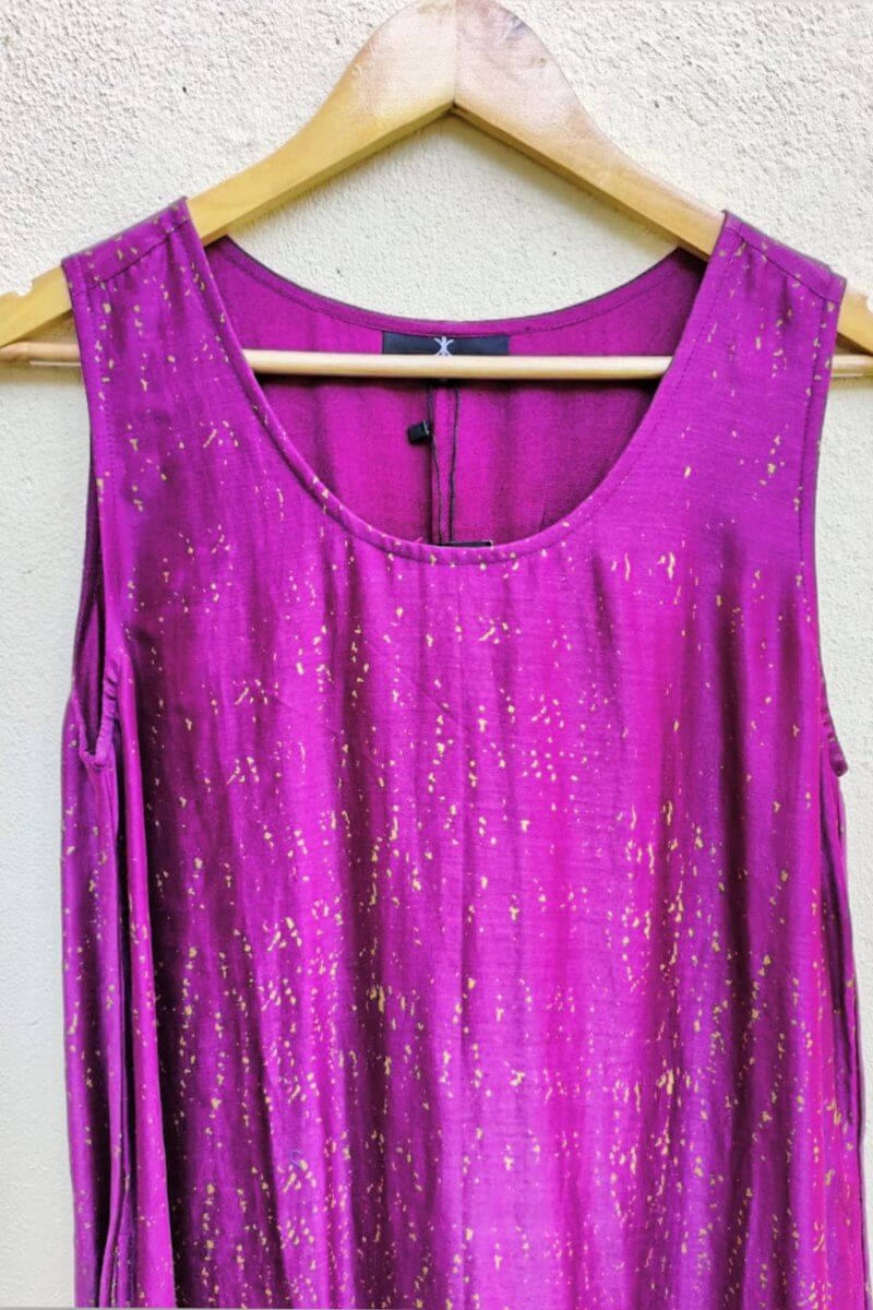 This Azura dress made up of printed chanderi fabric has a round neckline, sleeveless with a high low silhouette.