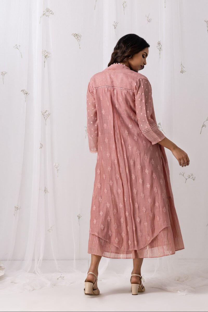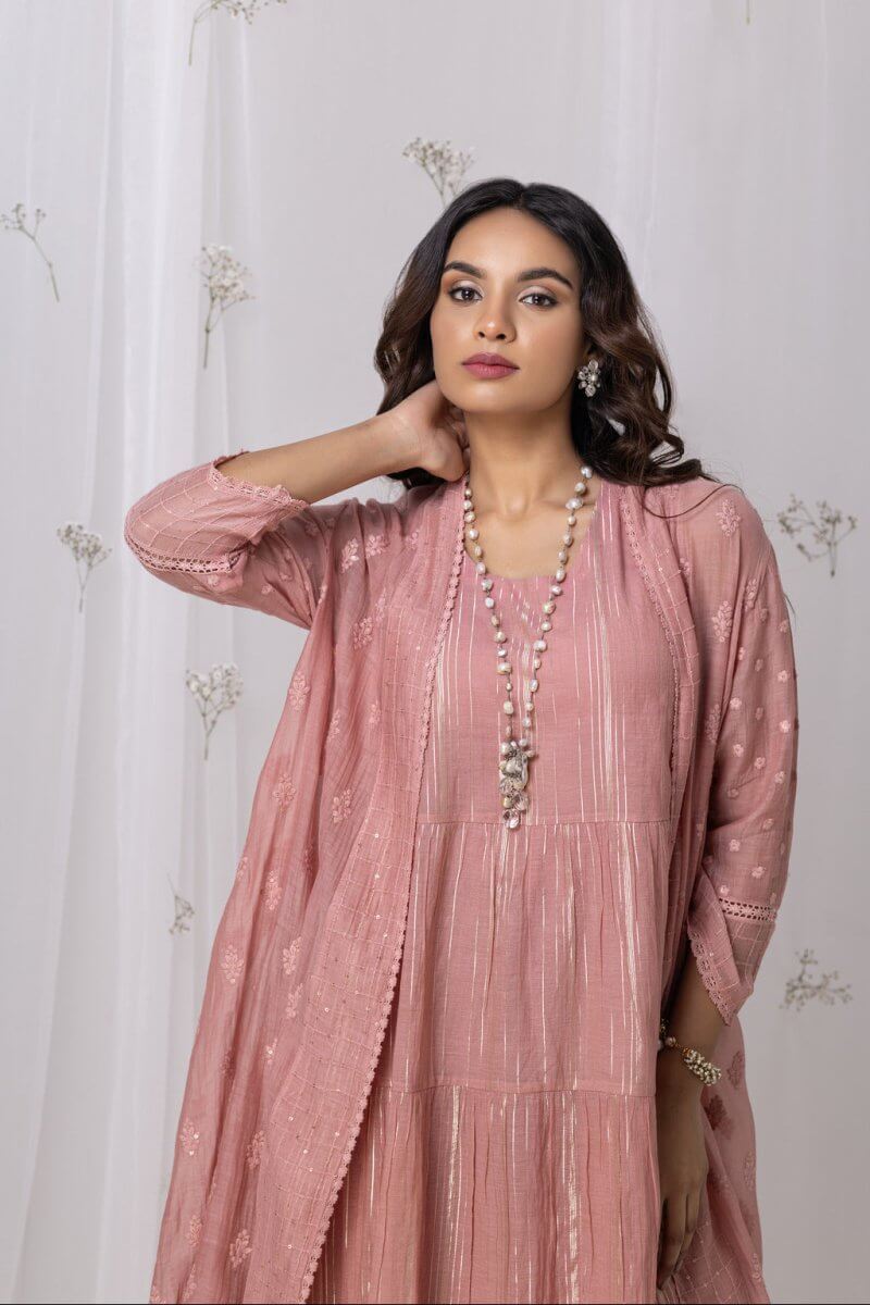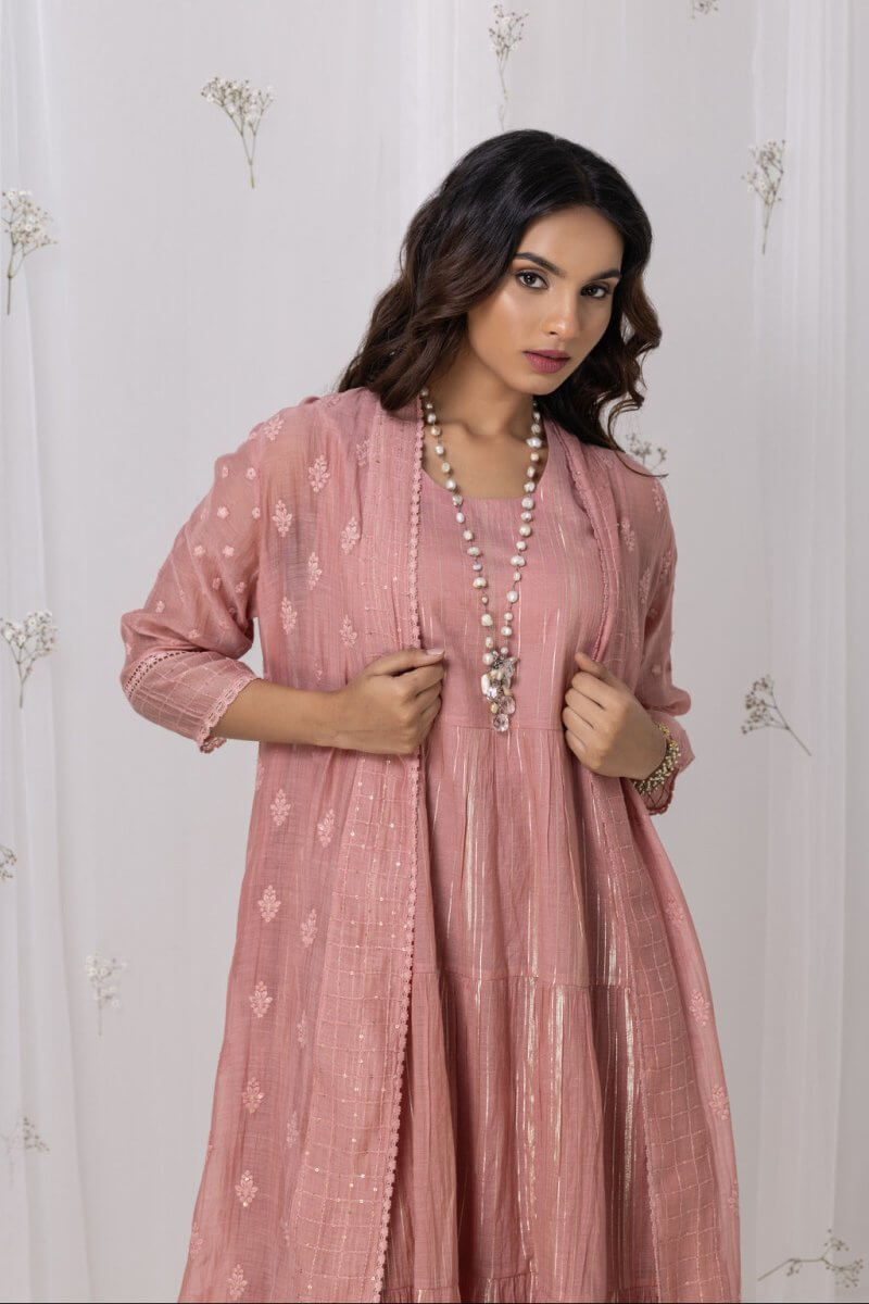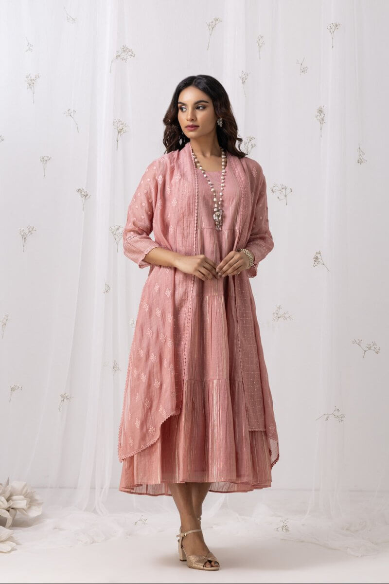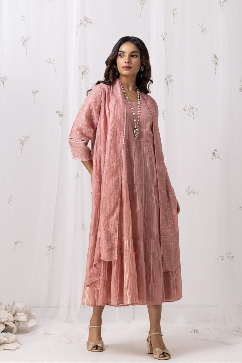 A Chanderi self embroidered 2-piece garment in which the dress is layering to embrace the multi-tier with a huge bottom, assembled with a overlay which has 3/4th sleeve. The lace detalings add elegance to it.