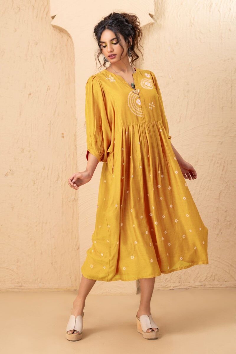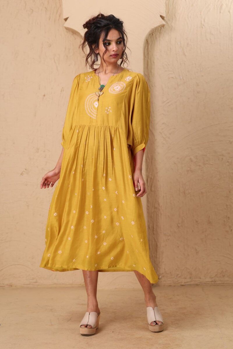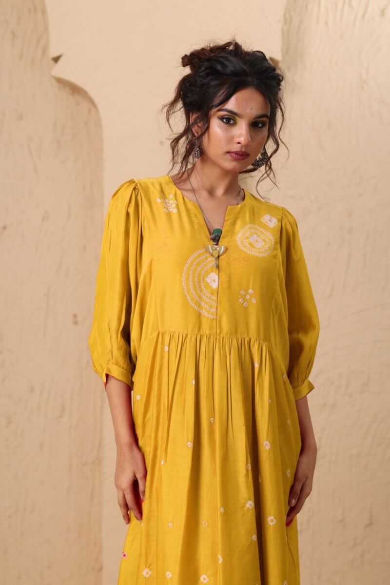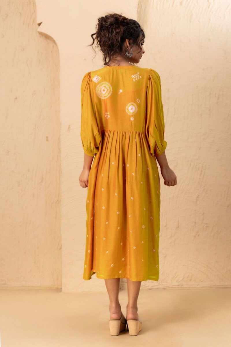 A dress featuring a front yoke with a V-neckline, paired with balloon sleeves finished with cuffs. The sleeves are adorned with delicate handwork, including Kantha stitching and decorative knots. The yoke, on both the front and back, showcases a striking tie-dye effect created through intricate stitching techniques forming circular and half-circular patterns in various sizes. The bottom of the dress is finished in a traditional Bandhani-style tie-dye, adding a vibrant and handcrafted touch.