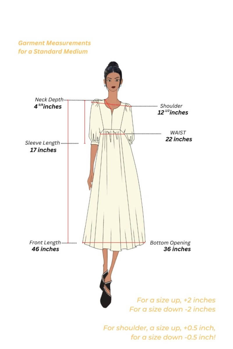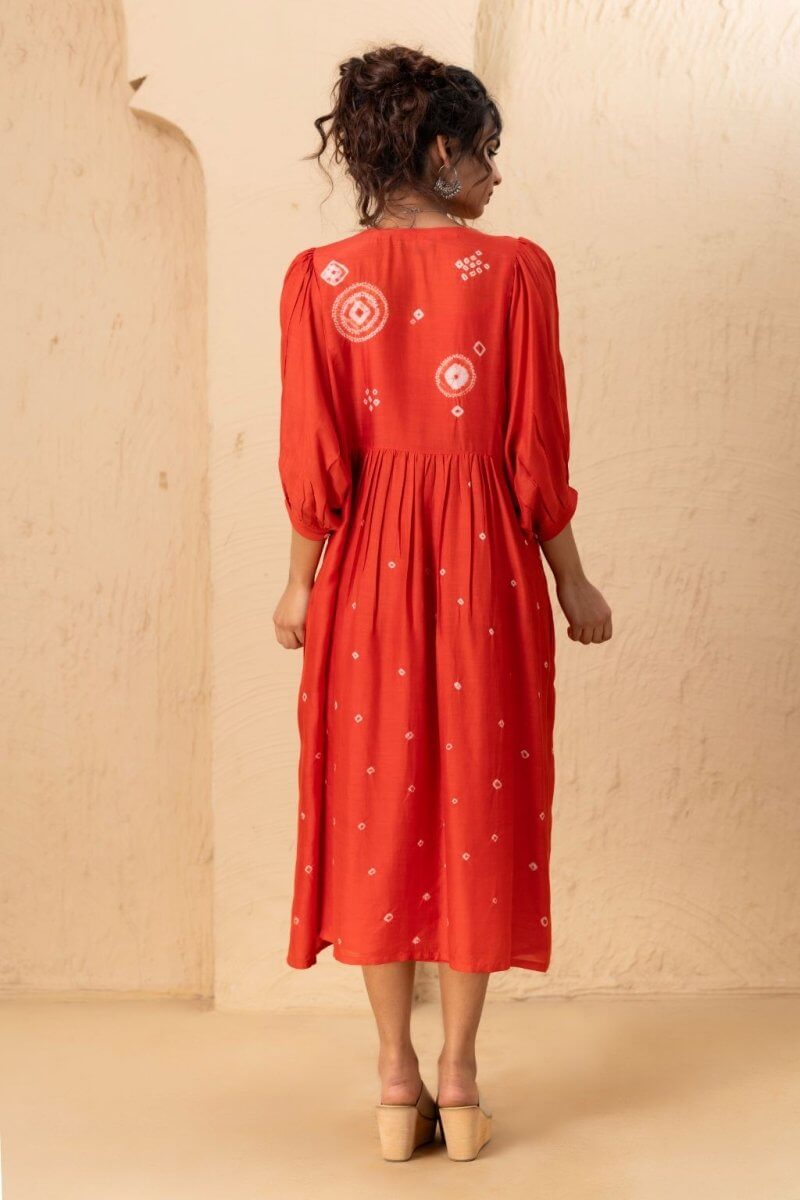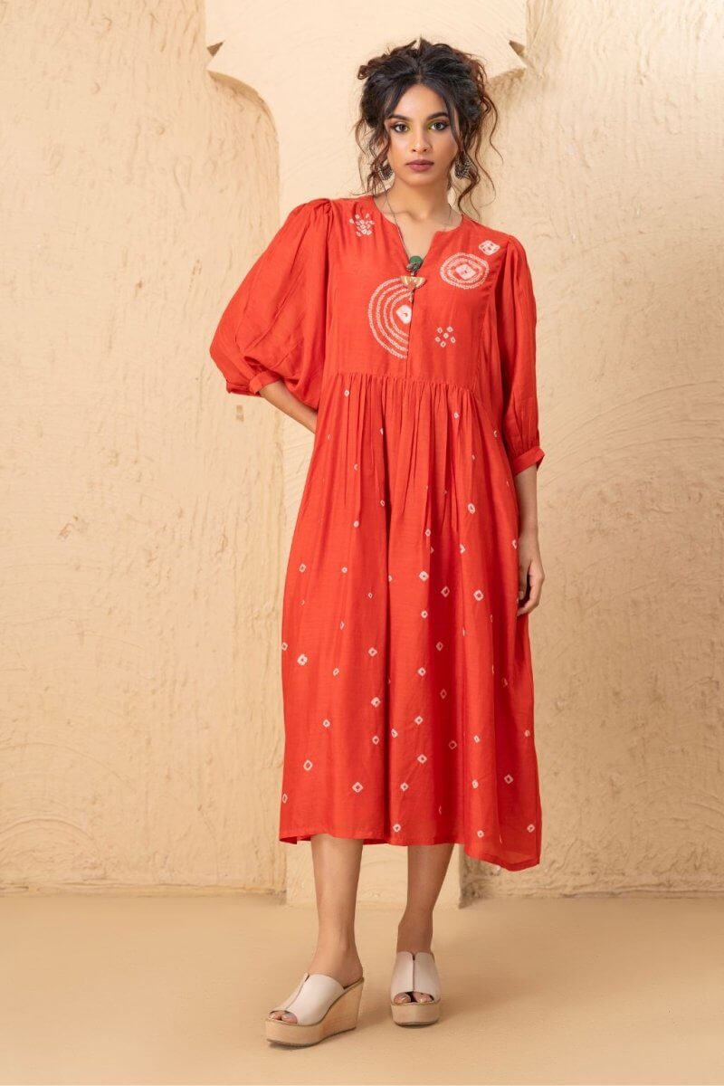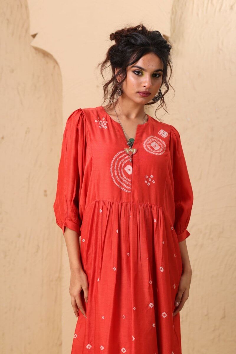 A dress featuring a front yoke with a V-neckline, paired with balloon sleeves finished with cuffs. The sleeves are adorned with delicate handwork, including Kantha stitching and decorative knots. The yoke, on both the front and back, showcases a striking tie-dye effect created through intricate stitching techniques forming circular and half-circular patterns in various sizes. The bottom of the dress is finished in a traditional Bandhani-style tie-dye, adding a vibrant and handcrafted touch.