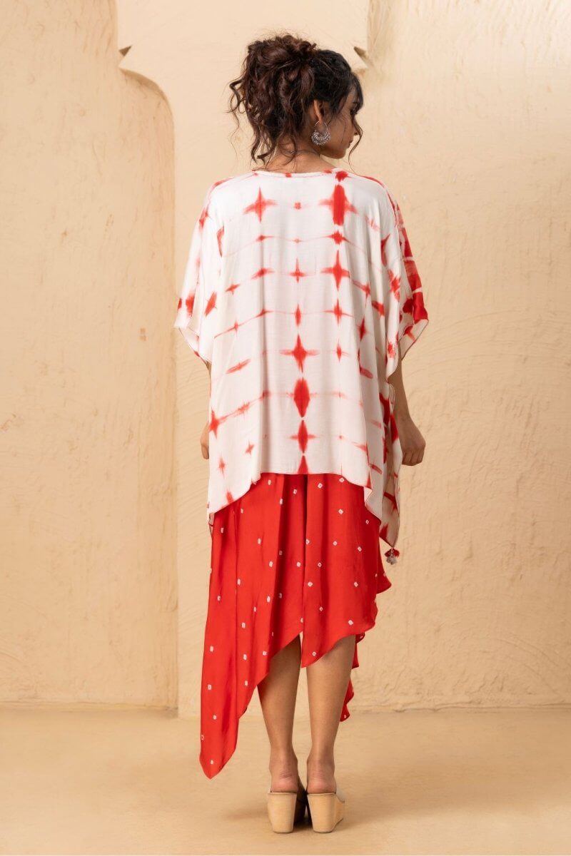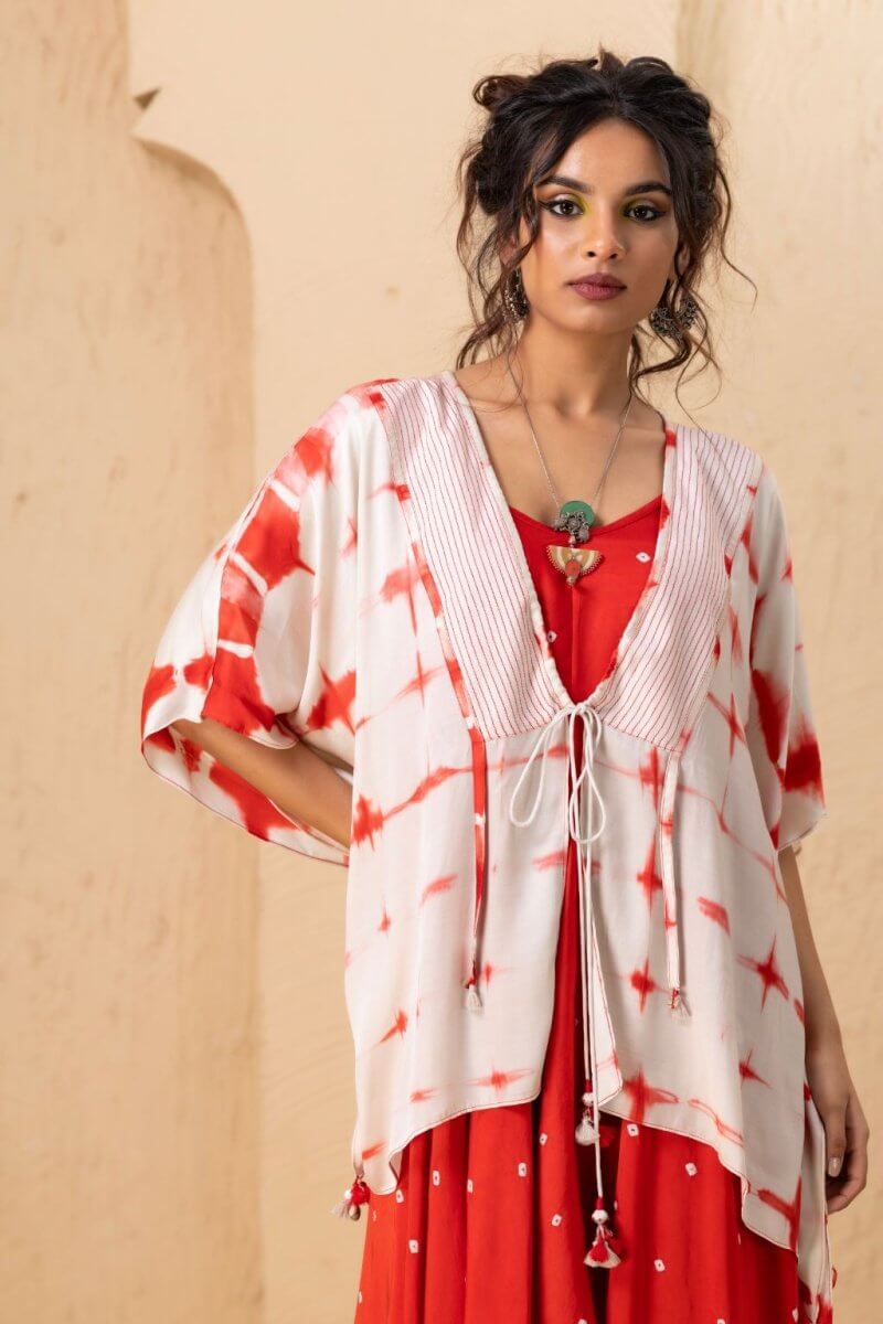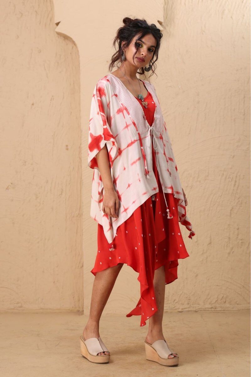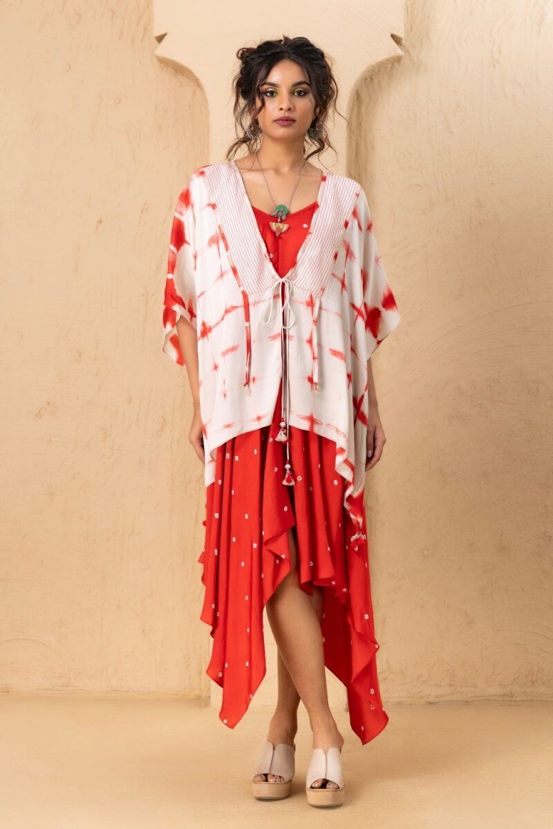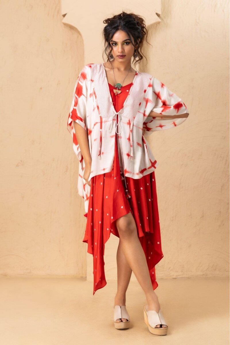 A Bandhani-style tie-dye dress featuring a subtly curved V-neckline and a high-low hem, designed with adjustable straps and crafted from luxurious modal satin for a soft, lustrous finish. It is paired with a Shibori-technique overlay in matching modal satin. It features 3/4th sleeves and a flowing silhouette, shorter in the front and longer at the back, adding an elegant and layered dimension to the ensemble.