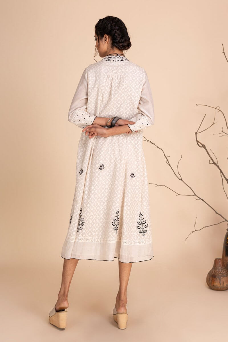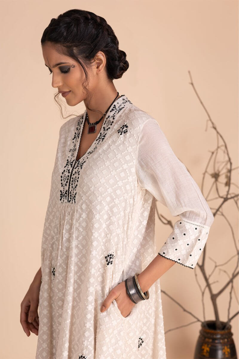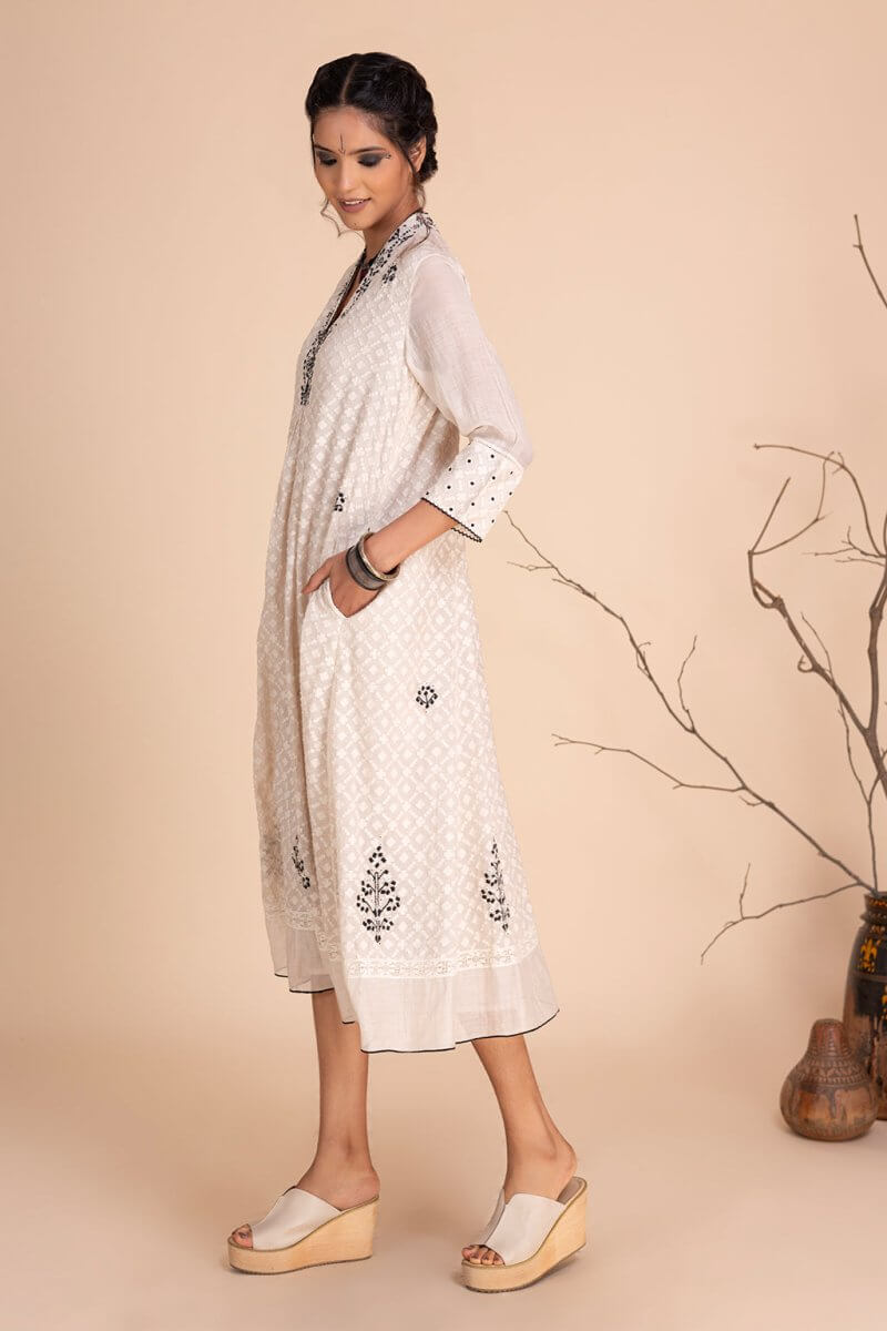 A Cutwork Chanderi embroidered dress in which the dress is elegantly embellished with thread embroidery and a glimpse of beads to embrace the dress. The dress is assembled with a 3/4th sleeve, a V-neck line and a delicate bottom layer with lace. The crochet details add to the elegance of it.