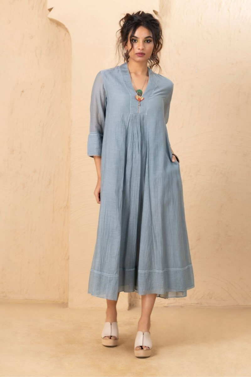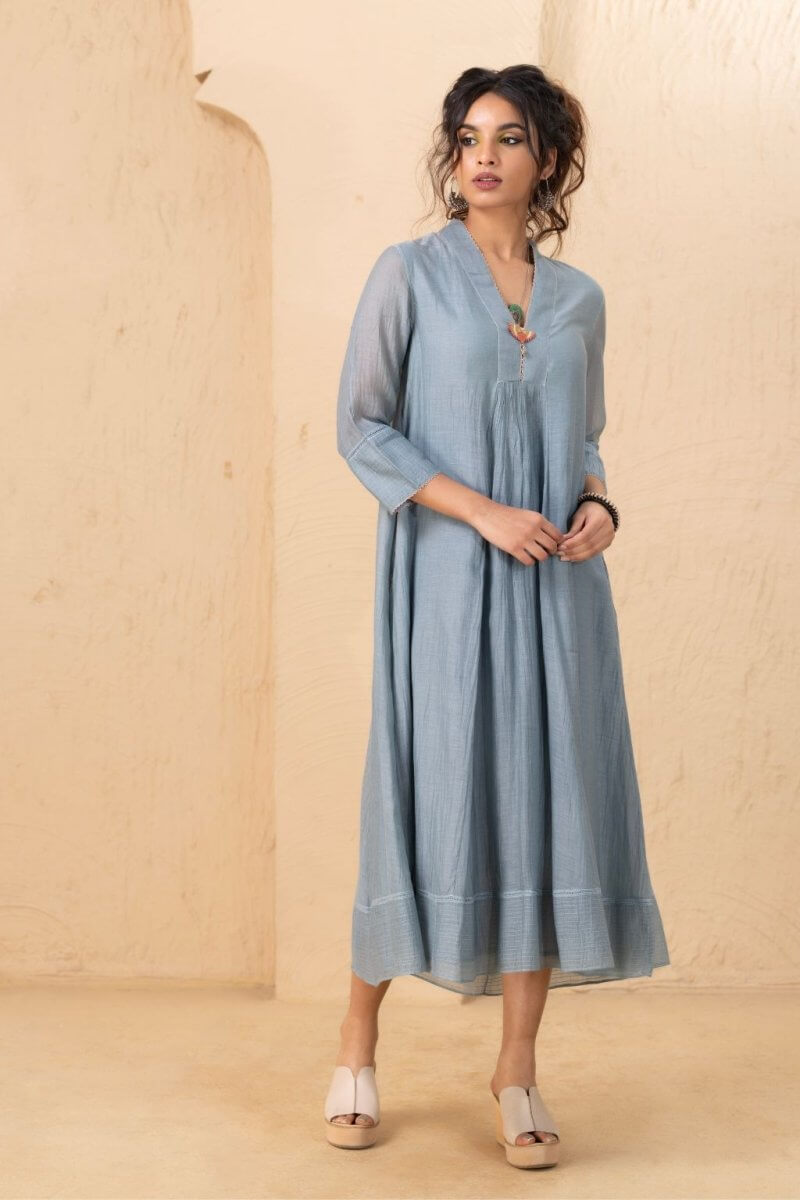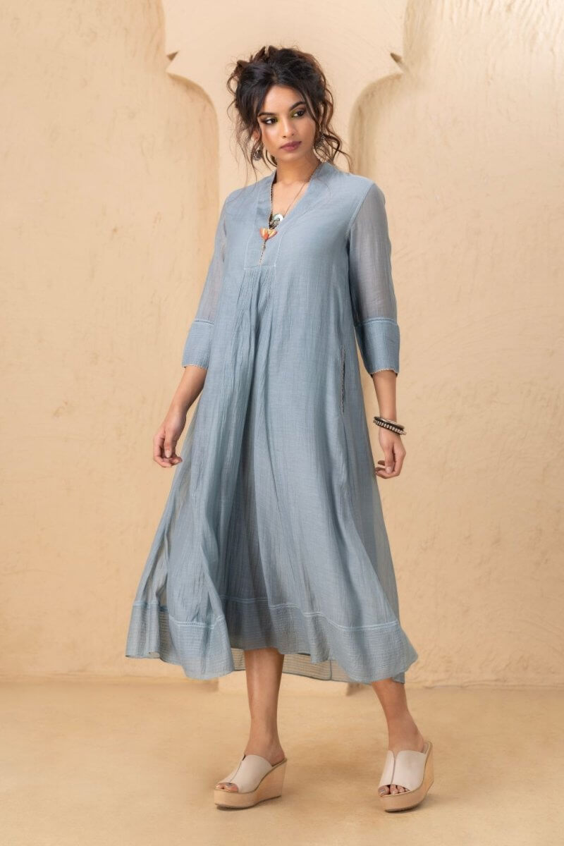 A Chanderi dress features 3/4th sleeves adorned with thread embroidery and beading lace at the bottom, a V-neckline, and a delicate bottom layer. The intricate crochet details with threads further add to its elegance.