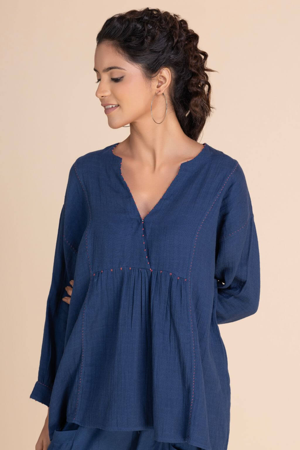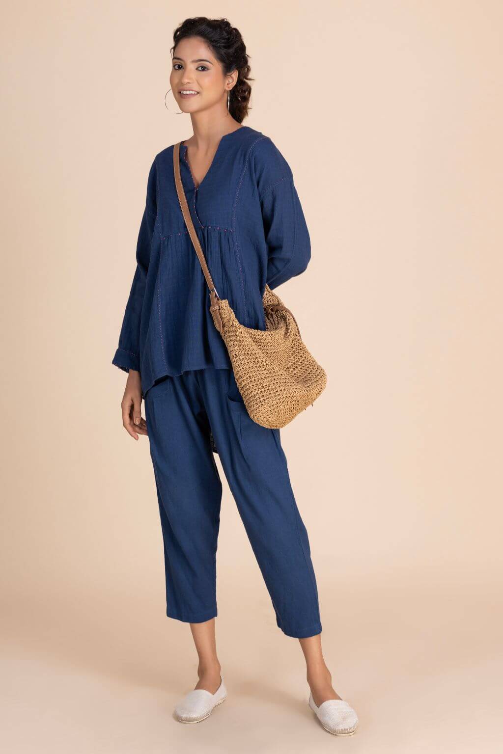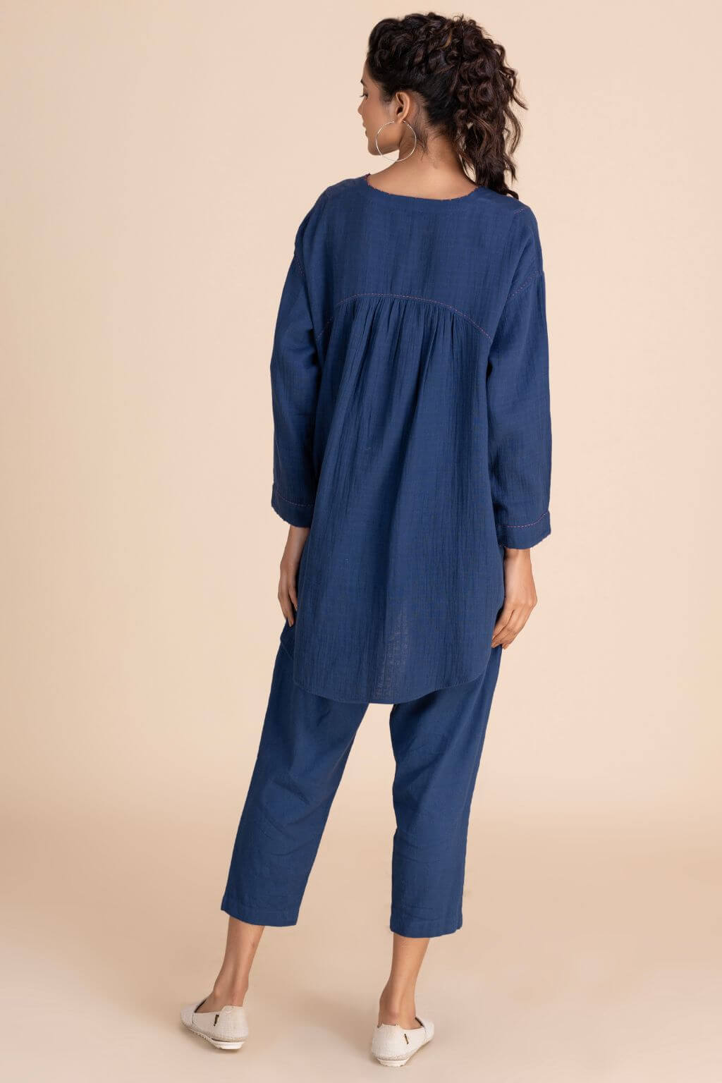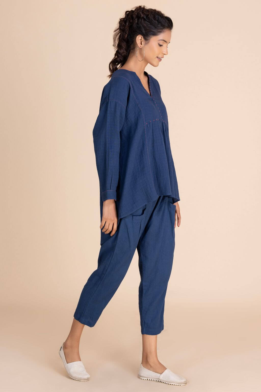 The Noor Pant Set in blue double gauze includes a V-neck, long sleeve top with a band collar, and pants that narrow at the bottom. Simple and comfortable, this set is perfect for everyday wear.