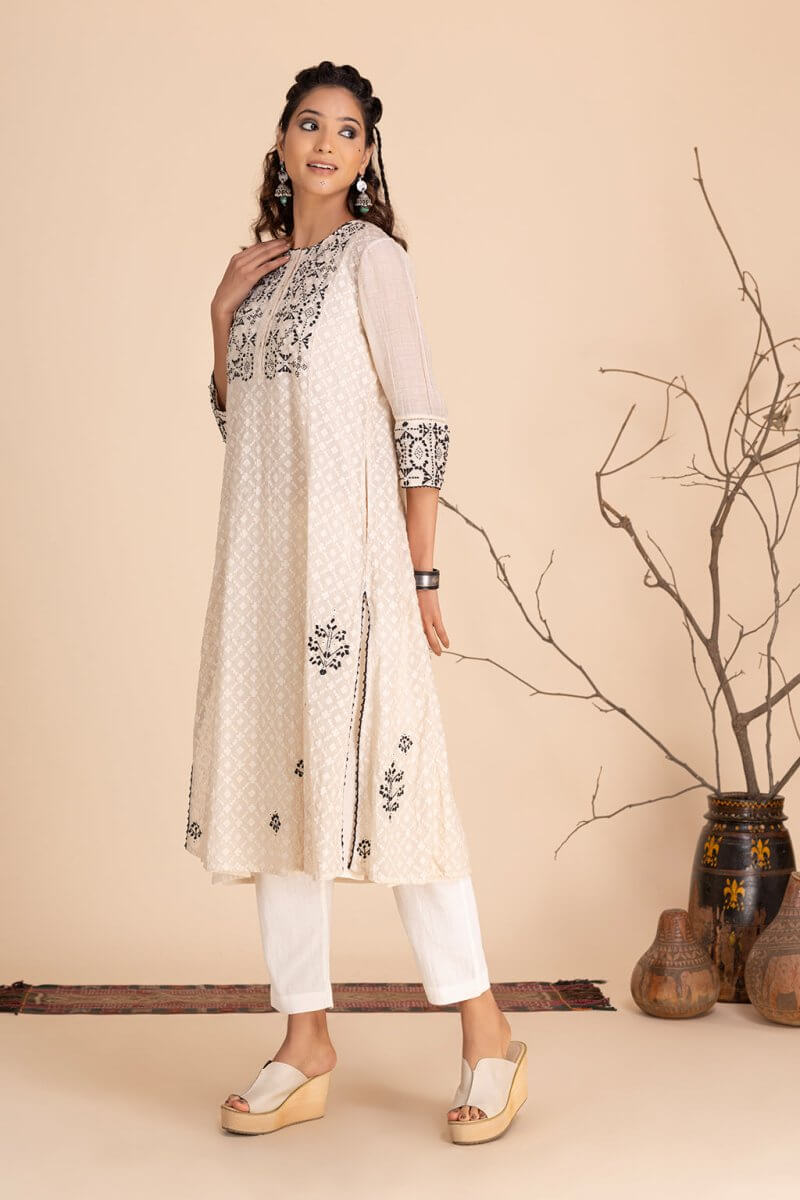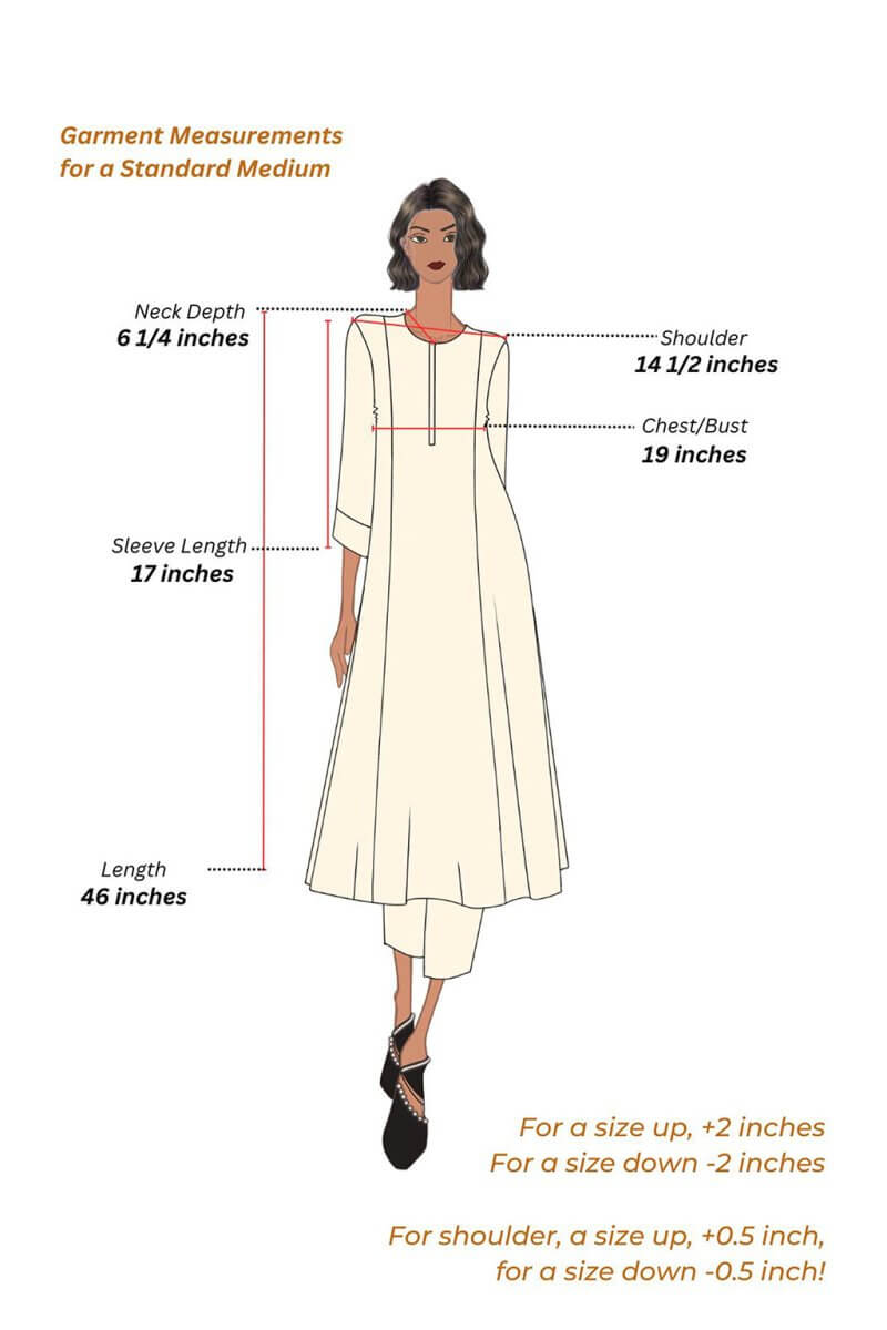 Round neck cutwork Chanderi co-ord set with shell buttons closure on front. The tunic has beautiful intricate thread embroidery inspired by Navajo motifs. The tunic has side pockets and is hand-detailed with beads.