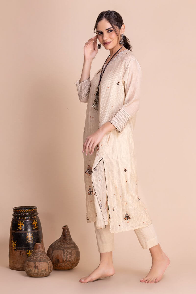 A Jaal Chanderi embroidered co-ord set in which the v-neck tunic is elegantly embellished with thread embroidery and a glimpse of beadwork to embrace the tunic. The tunic is assembled with a 3/4th sleeve, V-neck line and side slits. The pair of pants are put together as narrow pants./p>