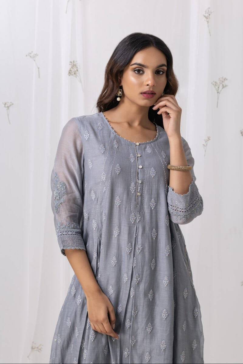 A Chanderi embroidered tunic in which the tunic is elegantly embellished with thread embroidery and a glimpse of zari and beads to embrace the dress. The tunic is assembled with 3/4th sleeves with zari embroidery, a v-neckline, and symmetrical layering at the bottom of the garment. The delicate lace details add to the elegance of it.