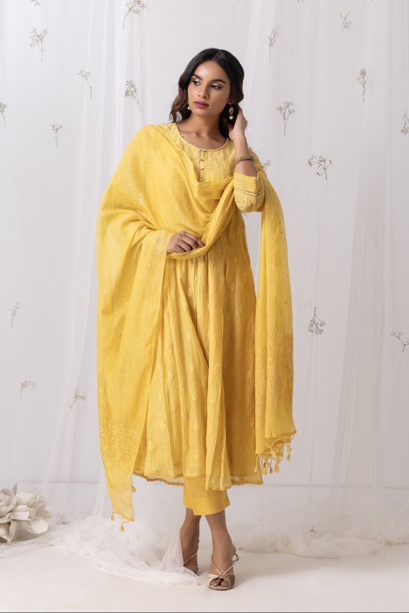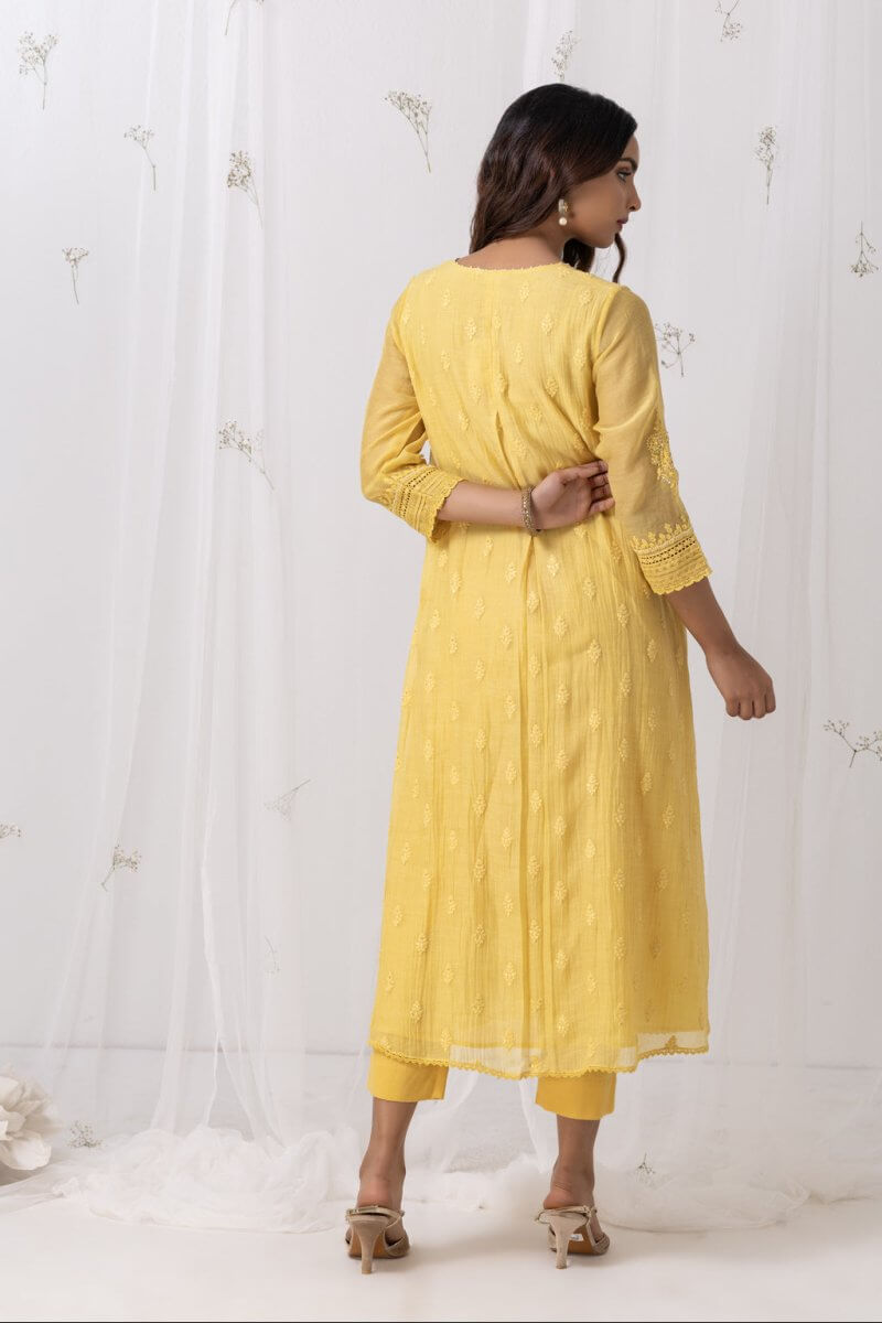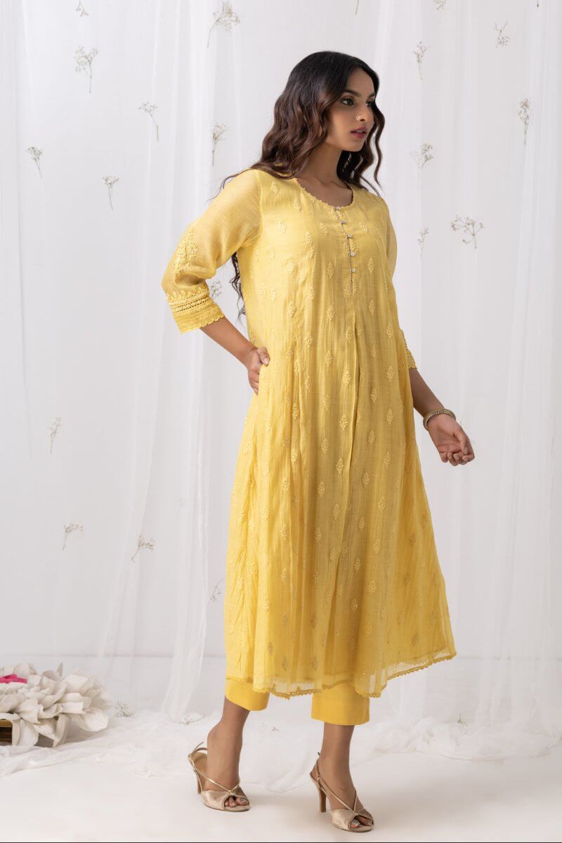 A Chanderi embroidered tunic in which the tunic is elegantly embellished with thread embroidery and a glimpse of zari and beads to embrace the dress. The tunic is assembled with 3/4th sleeves with zari embroidery, a v-neckline, and symmetrical layering at the bottom of the garment. The delicate lace details add to the elegance of it.