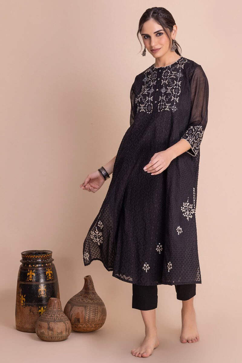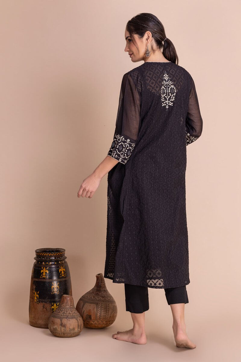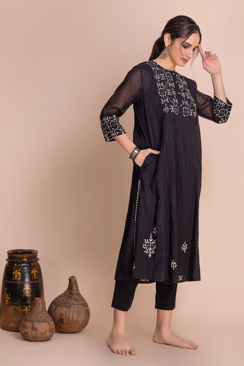Round neck cutwork Chanderi co-ord set with shell buttons closure on front. The tunic has beautiful intricate thread embroidery inspired by Navajo motifs. The tunic has side pockets and is hand-detailed with beads.