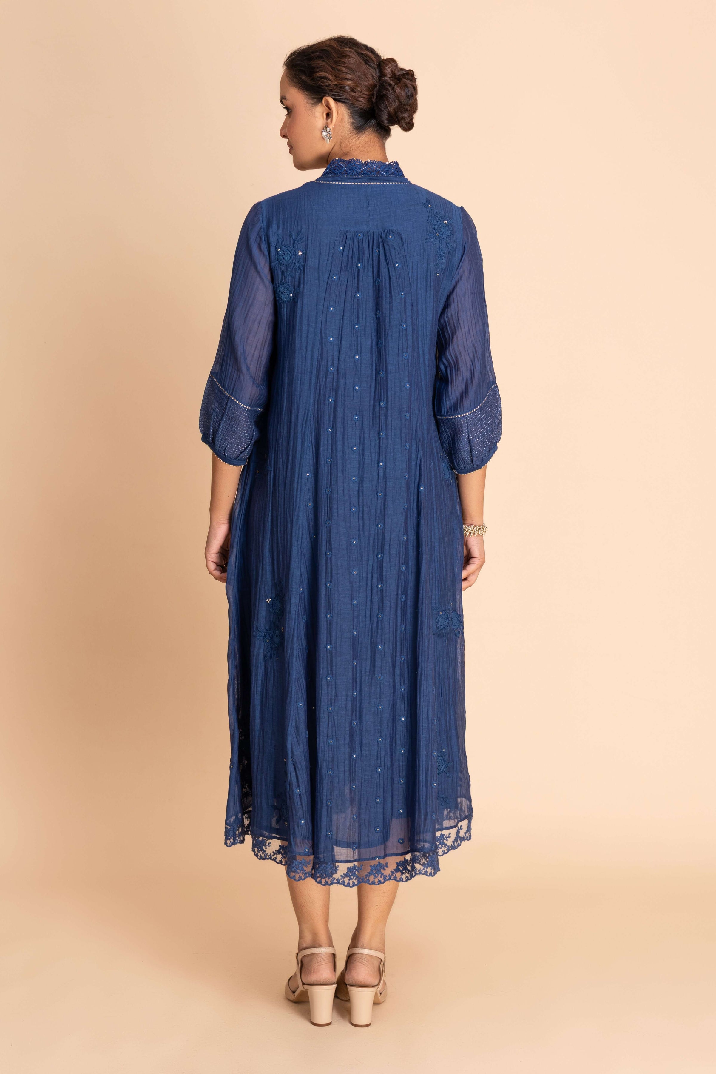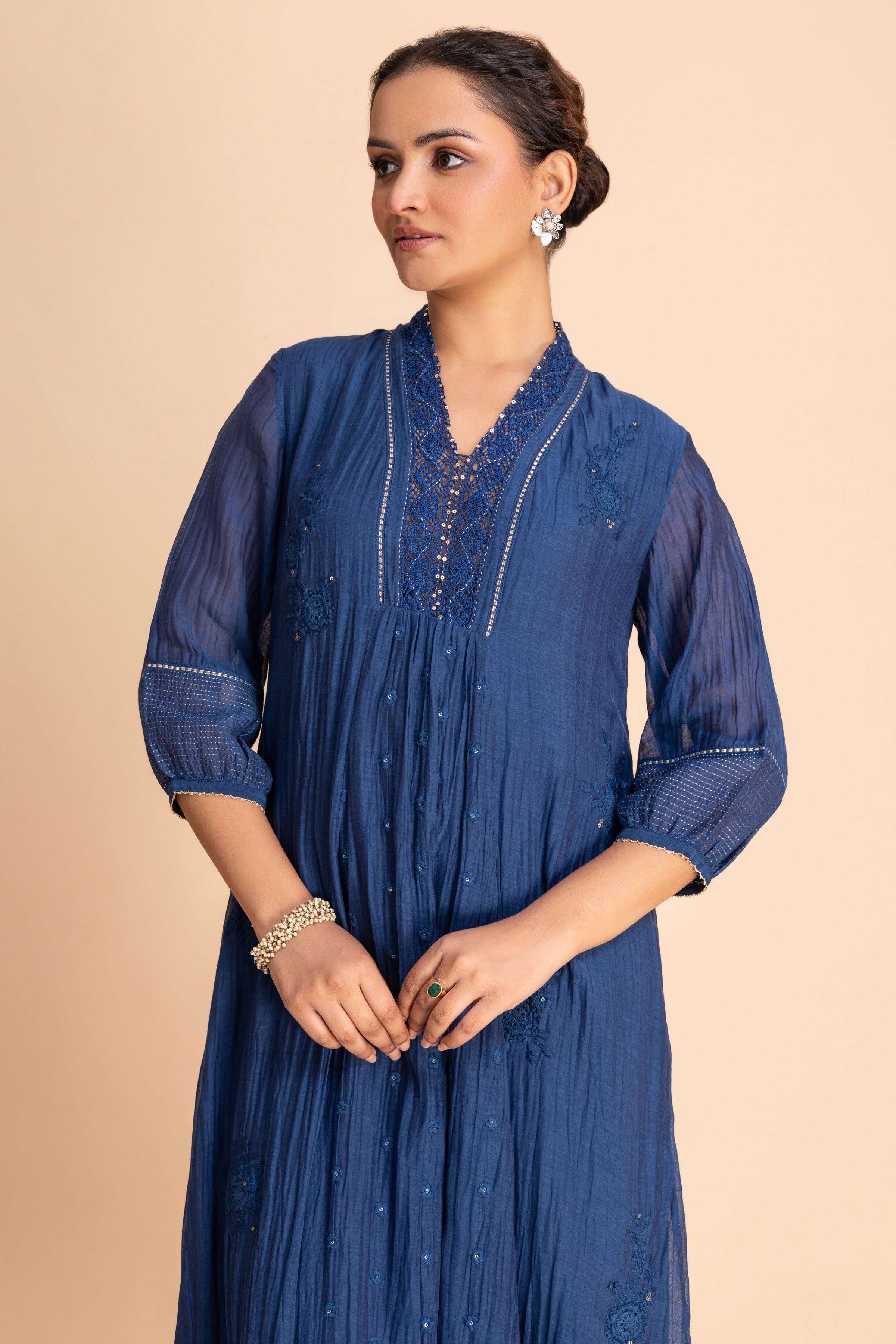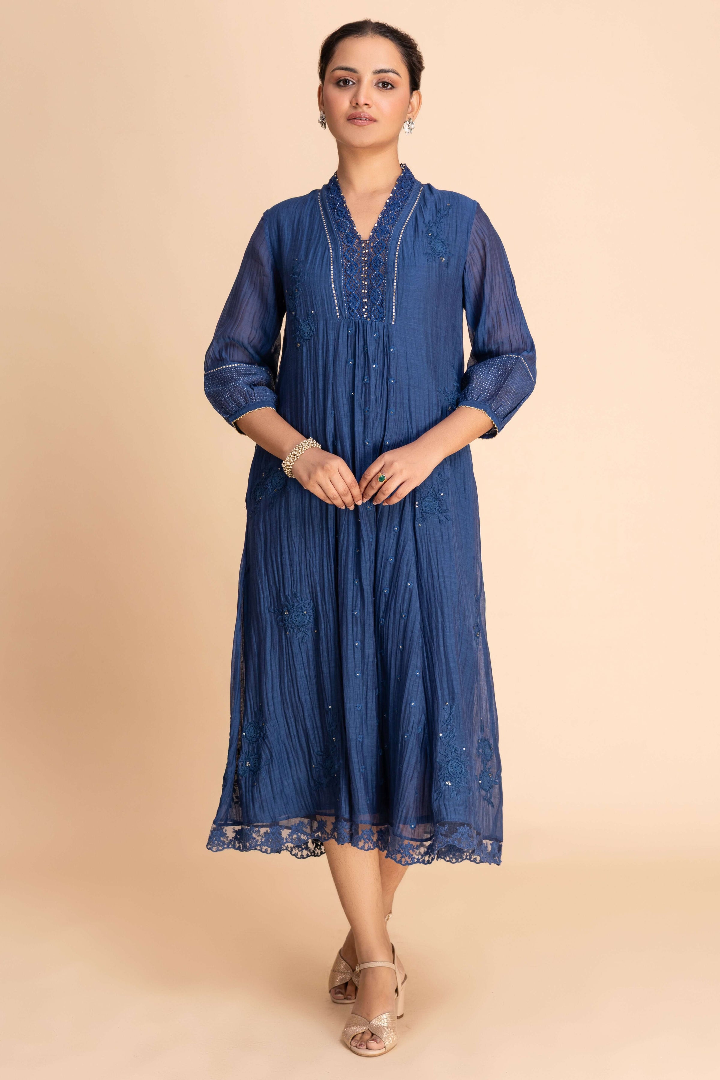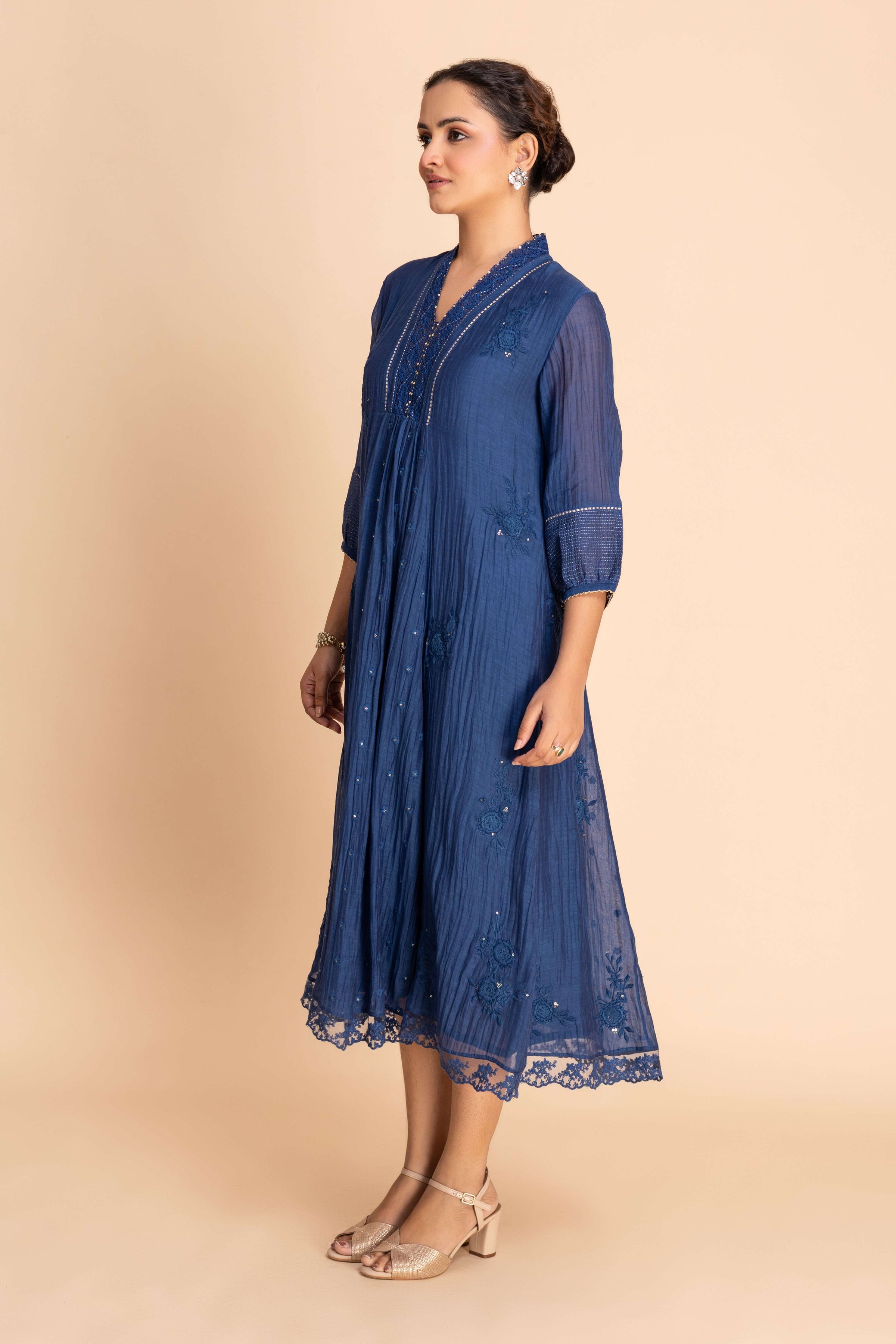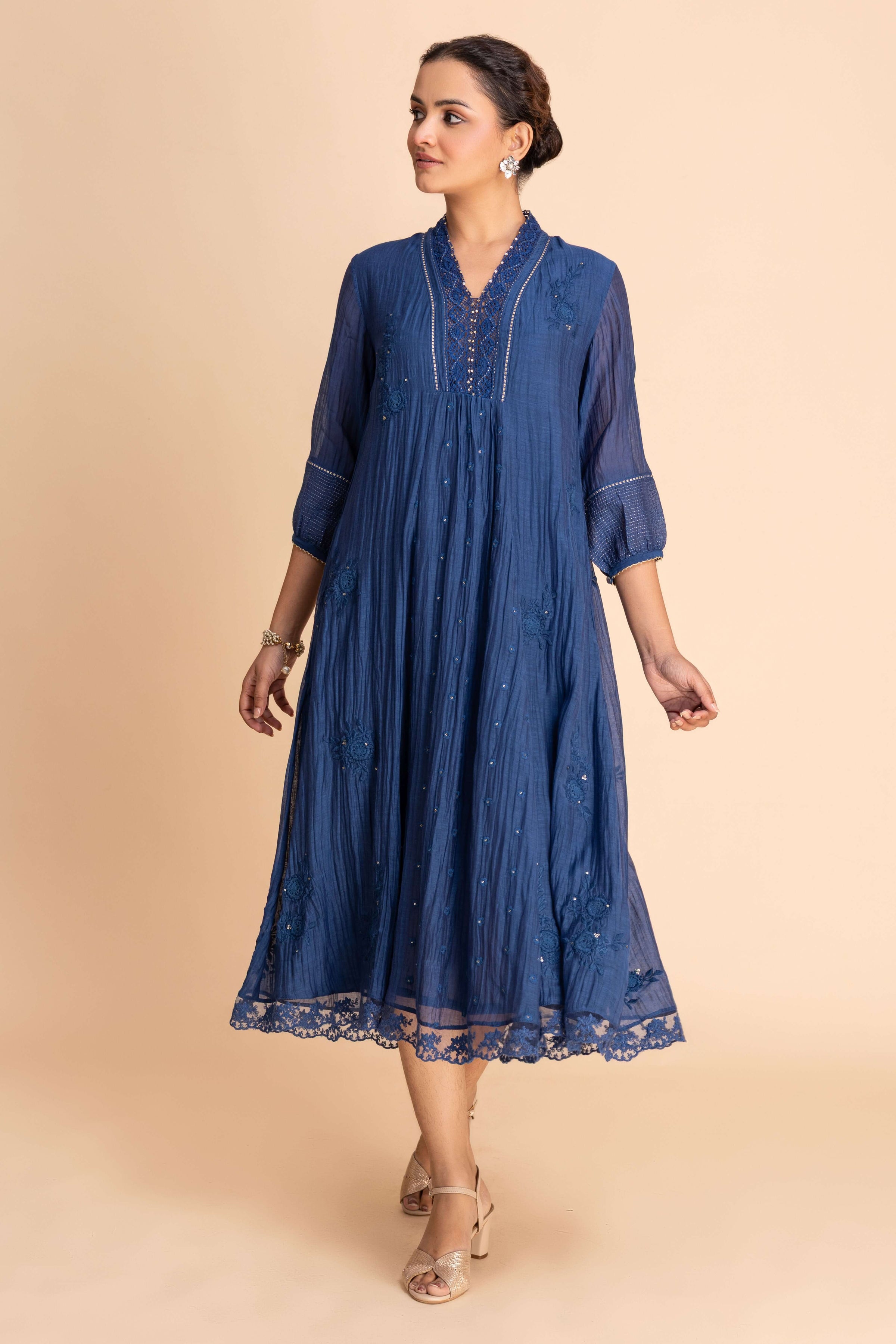 A gracefully flared Dress featuring delicate embroidery along the neckline, sleeves, and scattered motifs across the body. Designed with a subtle V-slit neckline, 3/4th sleeves, and a scalloped hemline, it blends refined detailing perfect for both festive and special occasions.