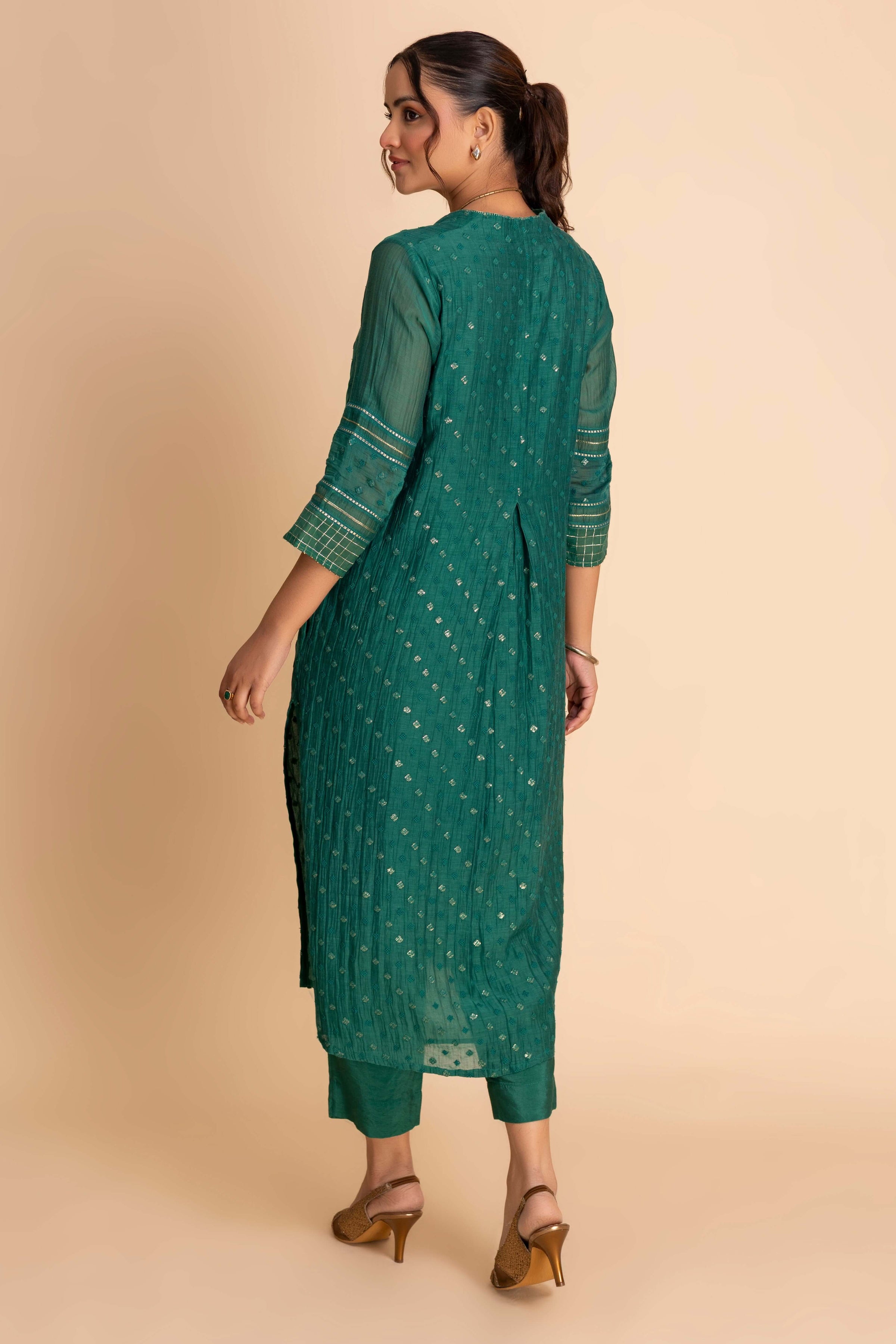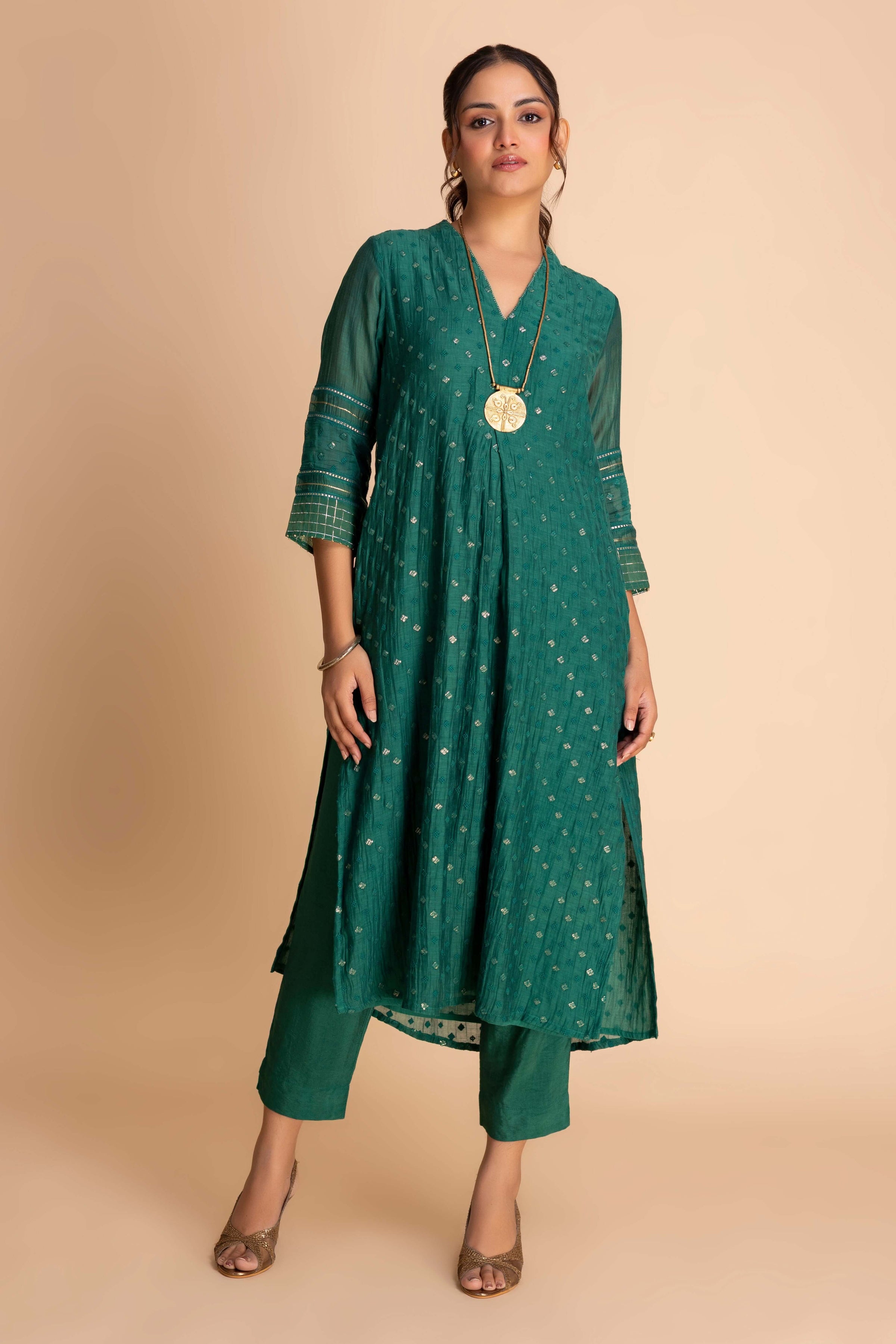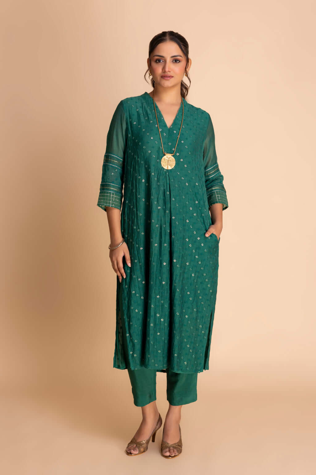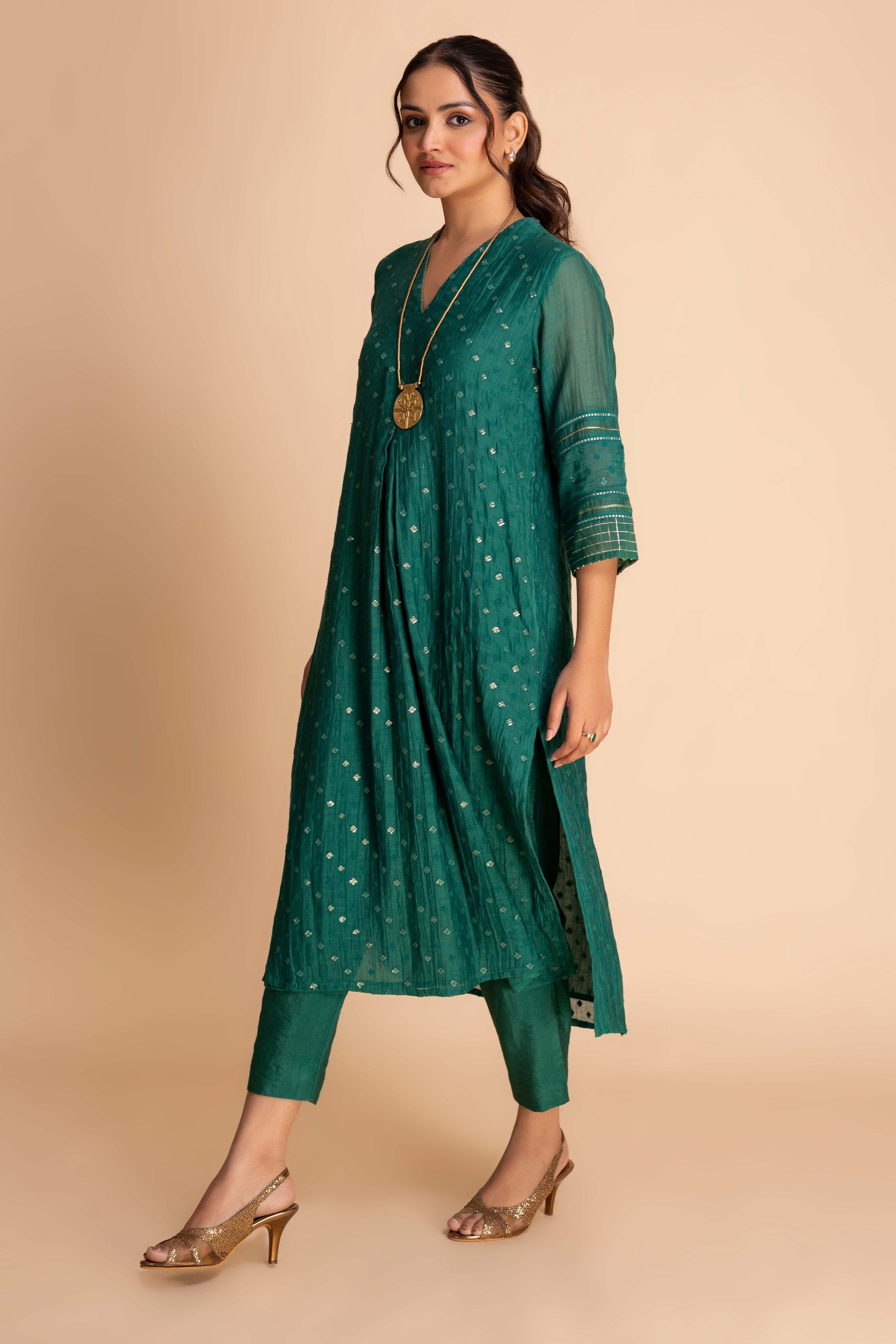 This sophisticated ensemble features a straight kurta with a modern V-neckline and 3/4th sleeves detailed with intricate embroidery and linear accents. Falling below the knee, it is paired with slim-fit trousers for a coordinated look. The outfit balances elegance with contemporary simplicity, perfect for festive gatherings or refined daywear.