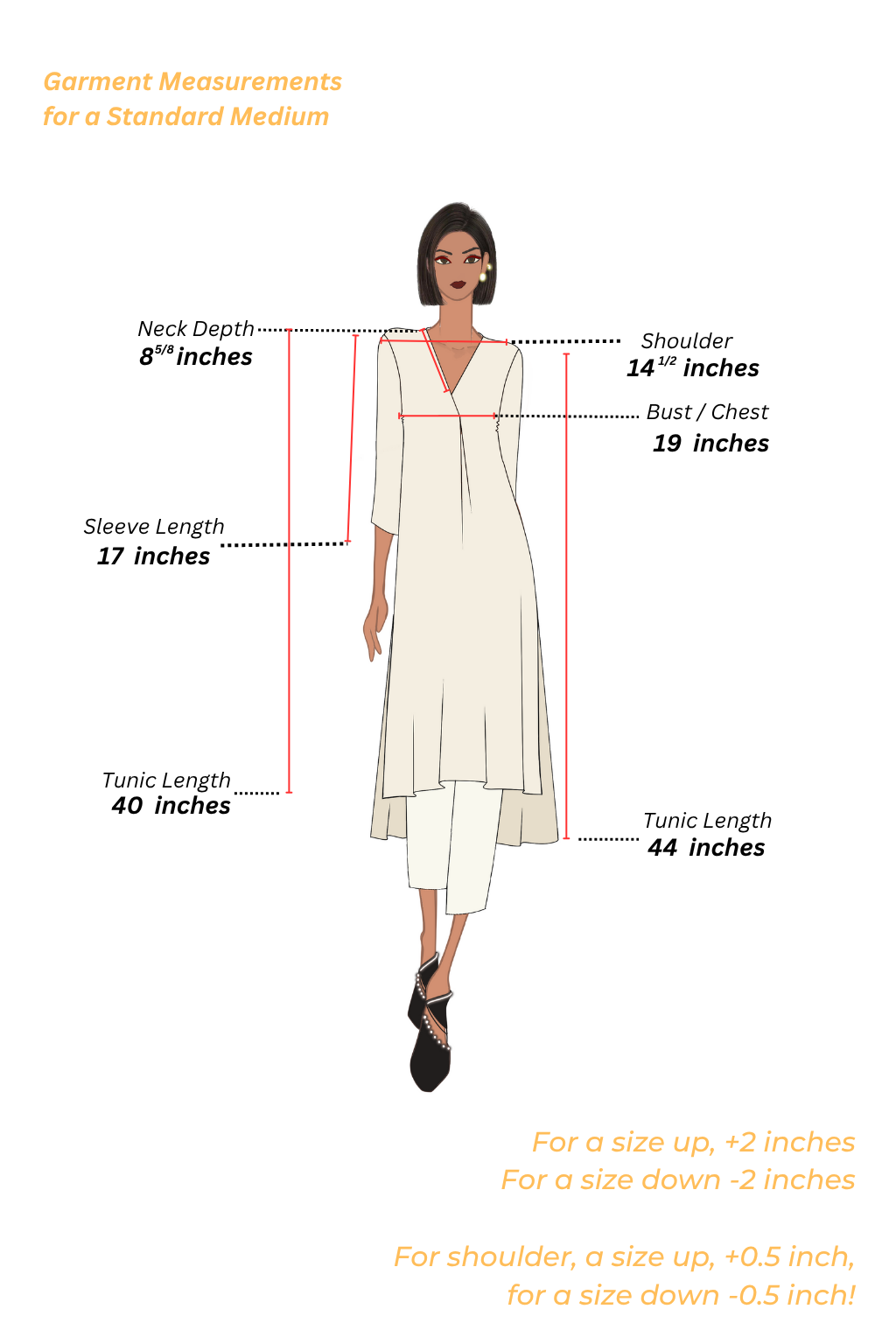 A stylish V-neckline tunic set featuring a high-low silhouette- shorter in the front and longer at the back-crafted in elegant Chanderi fabric and adorned with delicate mirror work. Paired with straight-cut pants in soft PS fabric, highlighted with matching embroidery and a scalloped hem for a refined and cohesive finish.