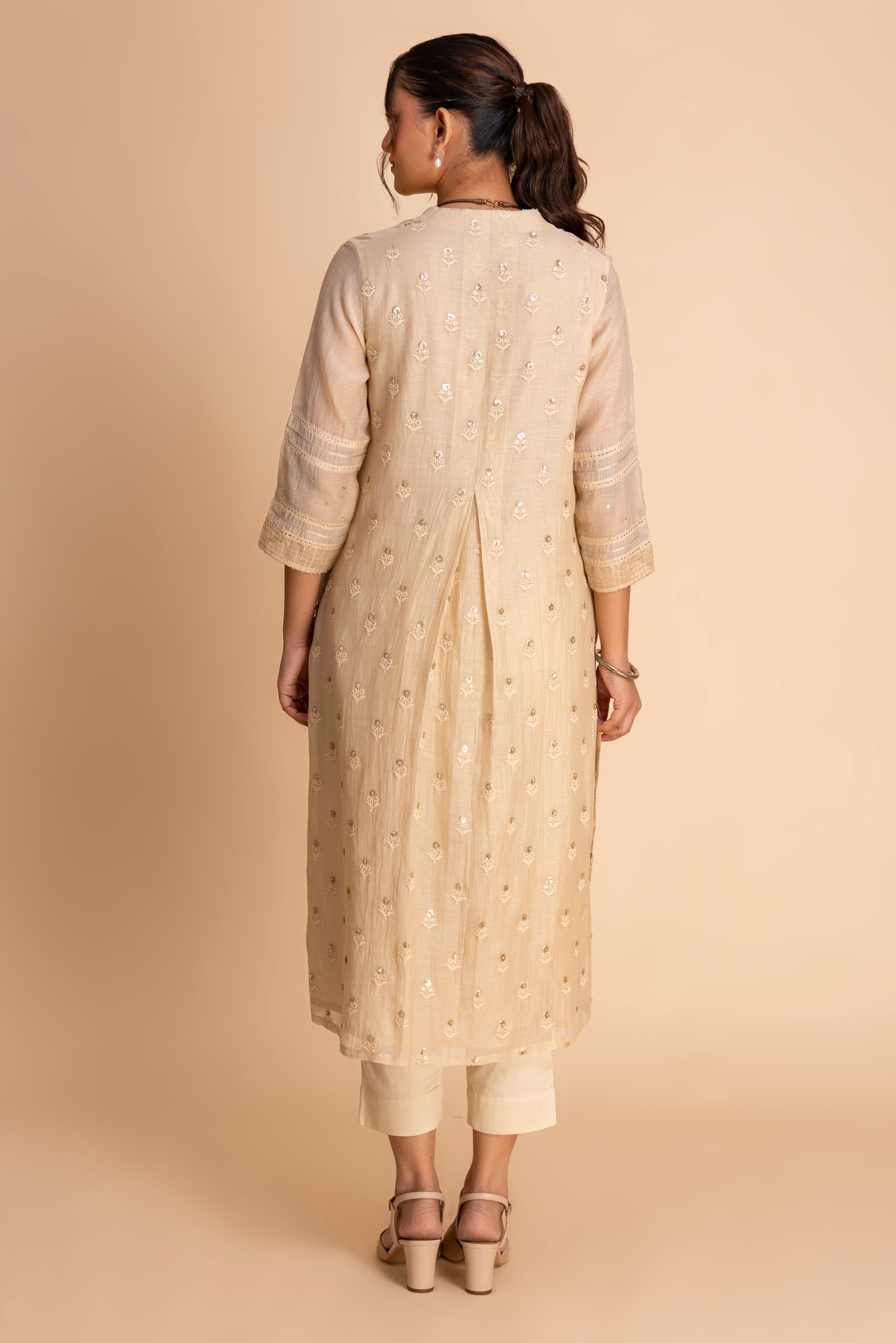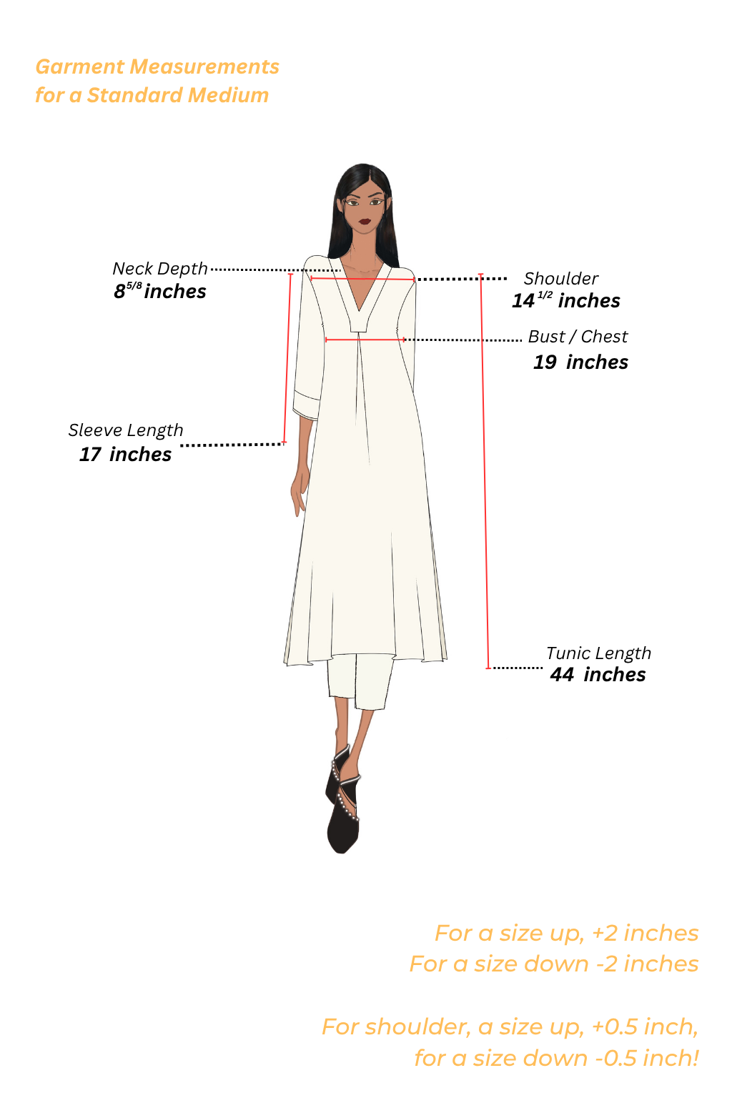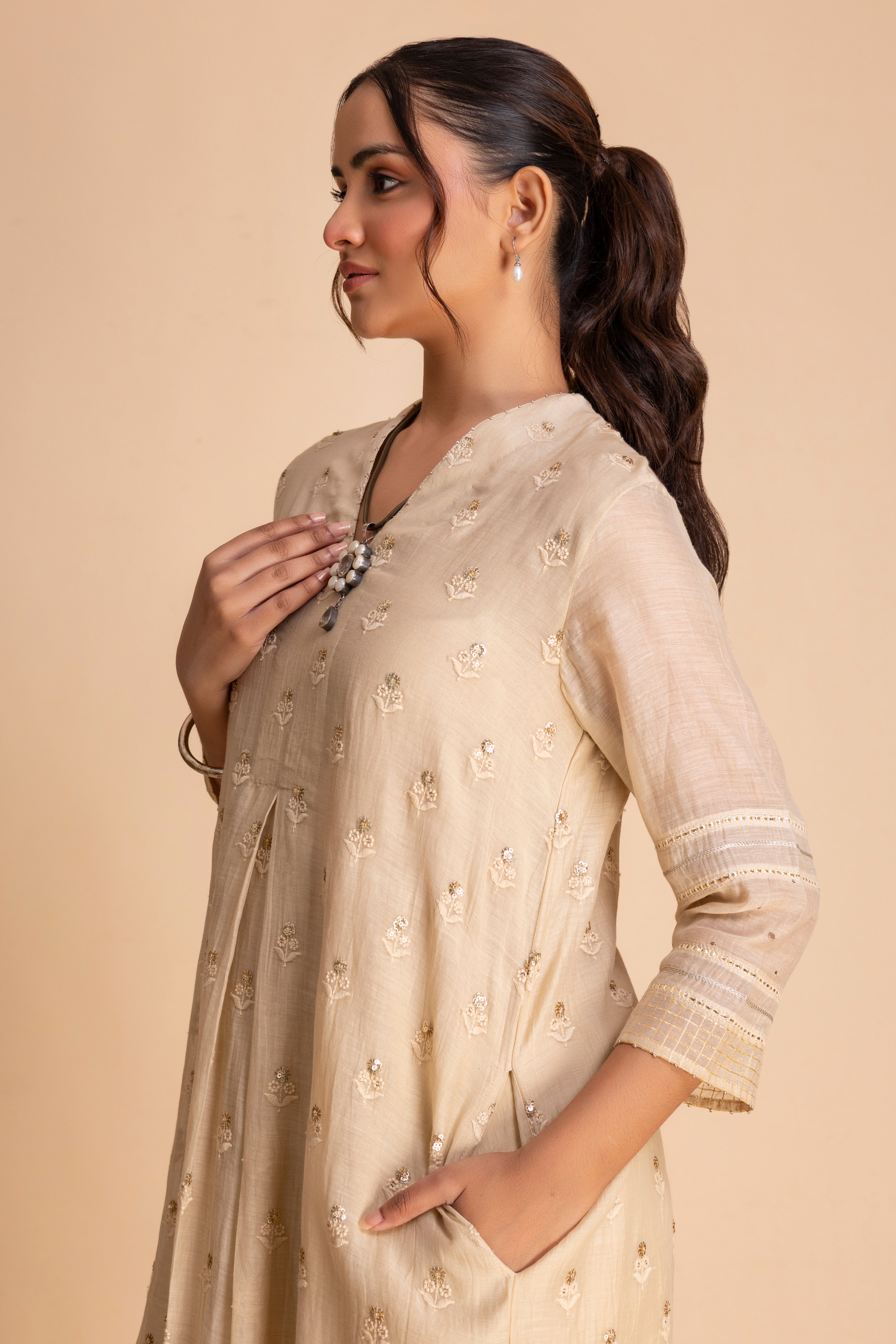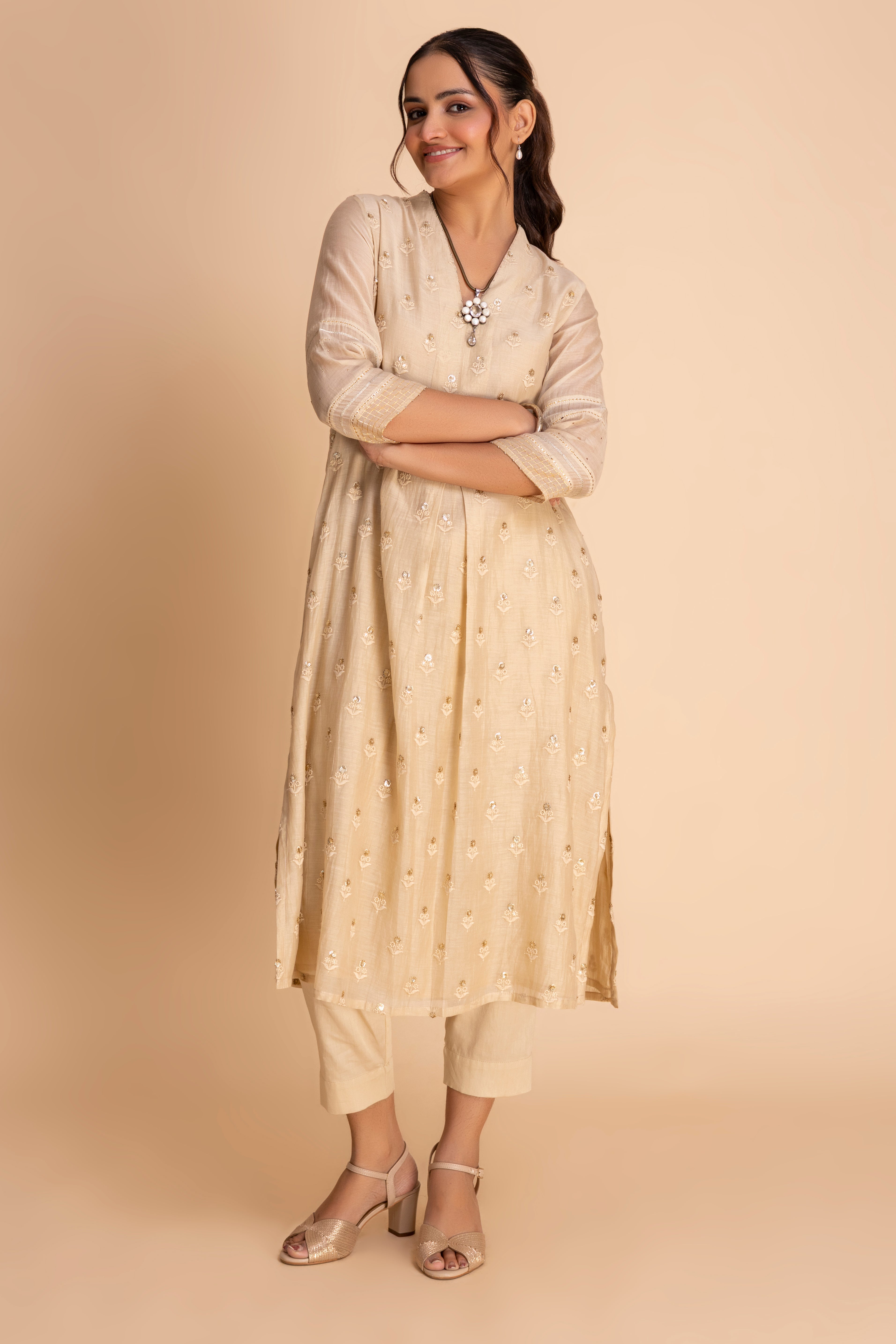 This sophisticated ensemble features a straight kurta with a modern V-neckline and 3/4th sleeves detailed with intricate embroidery and linear accents. Falling below the knee, it is paired with slim-fit trousers for a coordinated look. The outfit balances elegance with contemporary simplicity, perfect for festive gatherings or refined daywear.