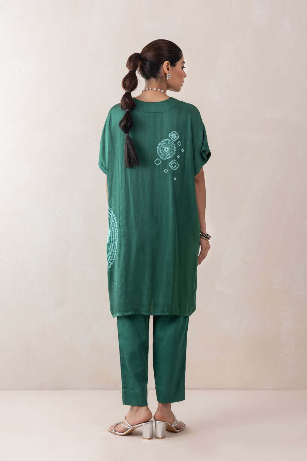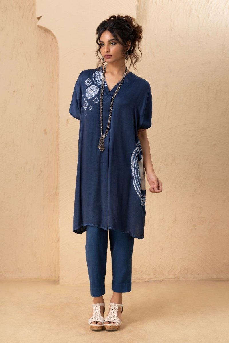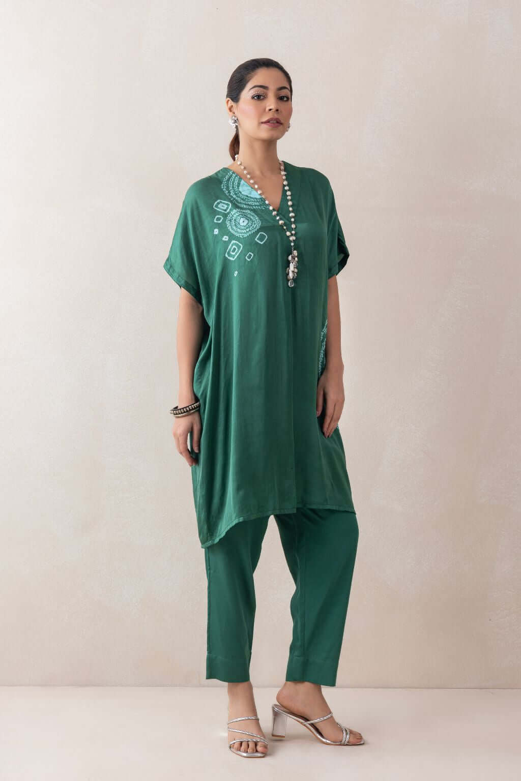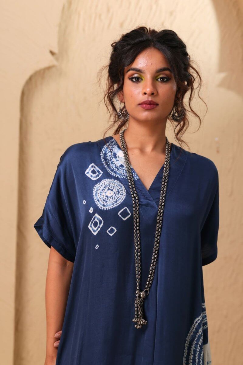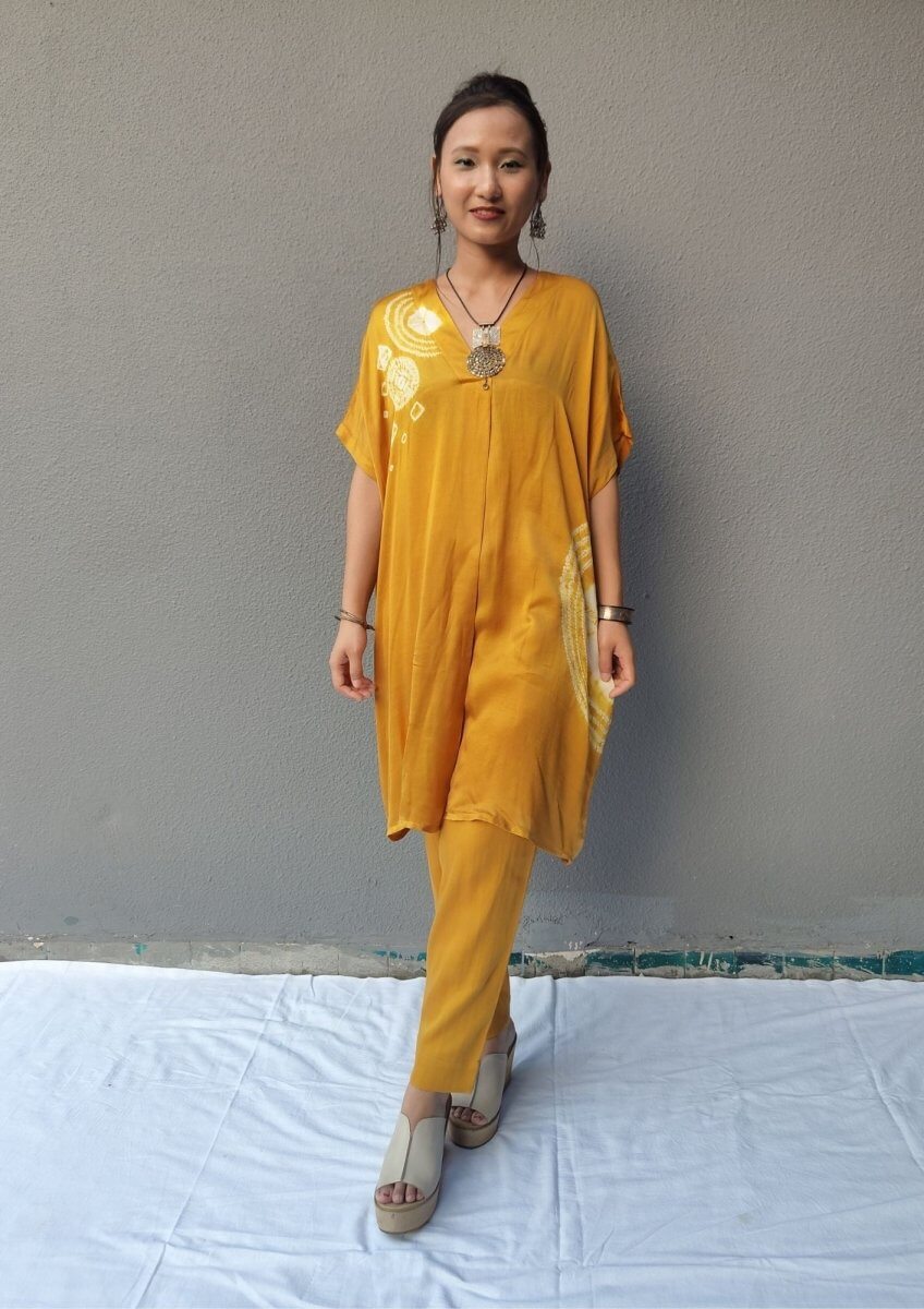 A loose-fit satin tunic featuring a V-neckline and an elegant arrangement of tie-dye stitch techniques, including small and large patterns, as well as circular and half-circular designs that add a sophisticated touch. Paired with matching satin pants, the ensemble offers a sleek and polished look.
