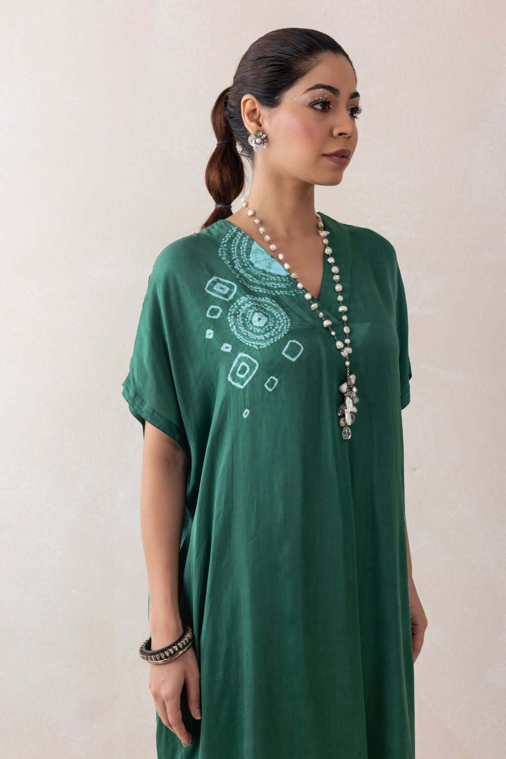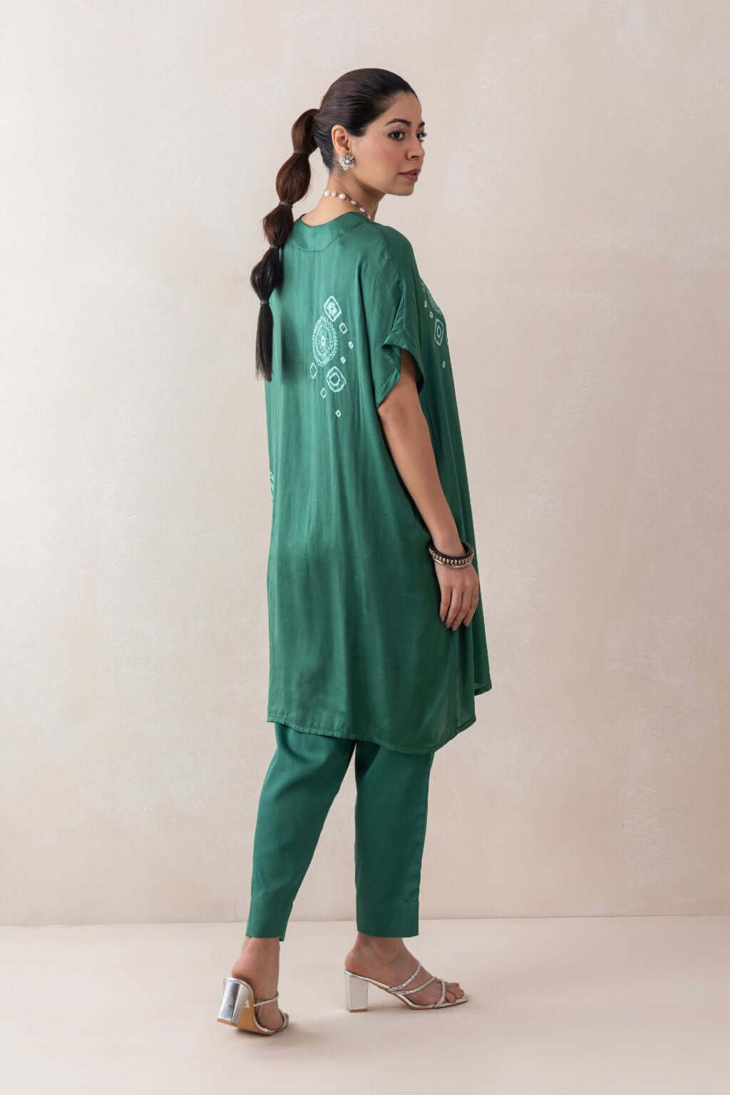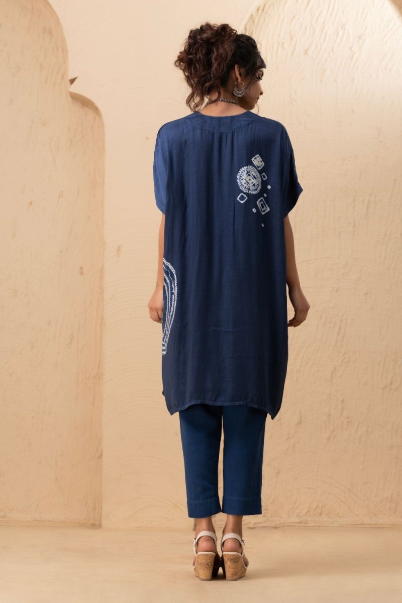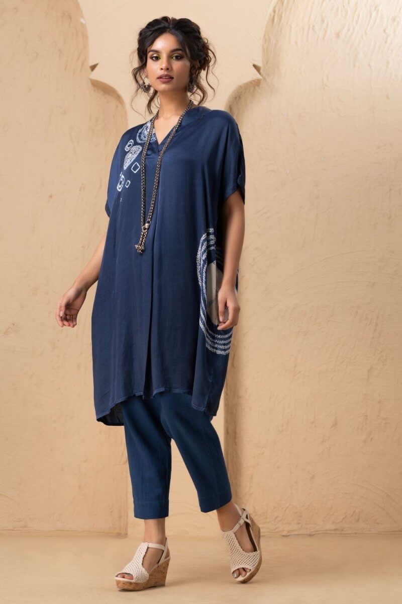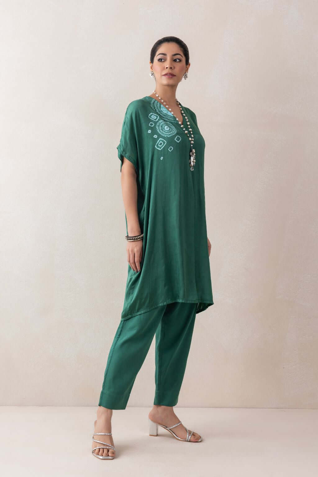 A loose-fit satin tunic featuring a V-neckline and an elegant arrangement of tie-dye stitch techniques, including small and large patterns, as well as circular and half-circular designs that add a sophisticated touch. Paired with matching satin pants, the ensemble offers a sleek and polished look.