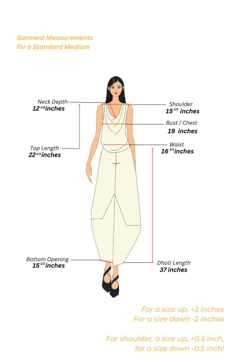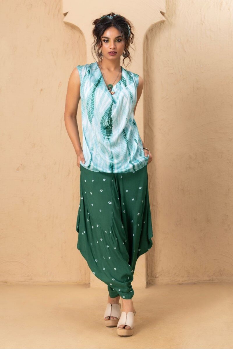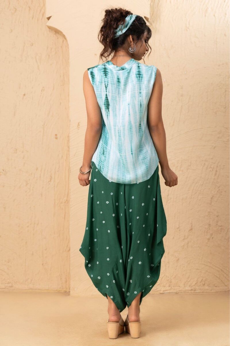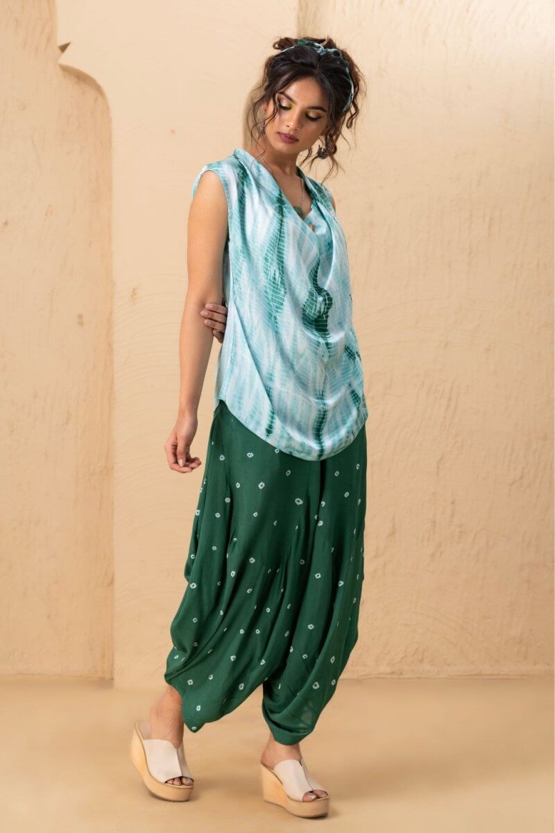 A cowl-neck top crafted from modal satin, featuring the Shibori dyeing technique for a fluid, flowing silhouette, paired with a uniquely styled dhoti in soft modal cotton, adorned with intricate Bandhani print at the bottom.