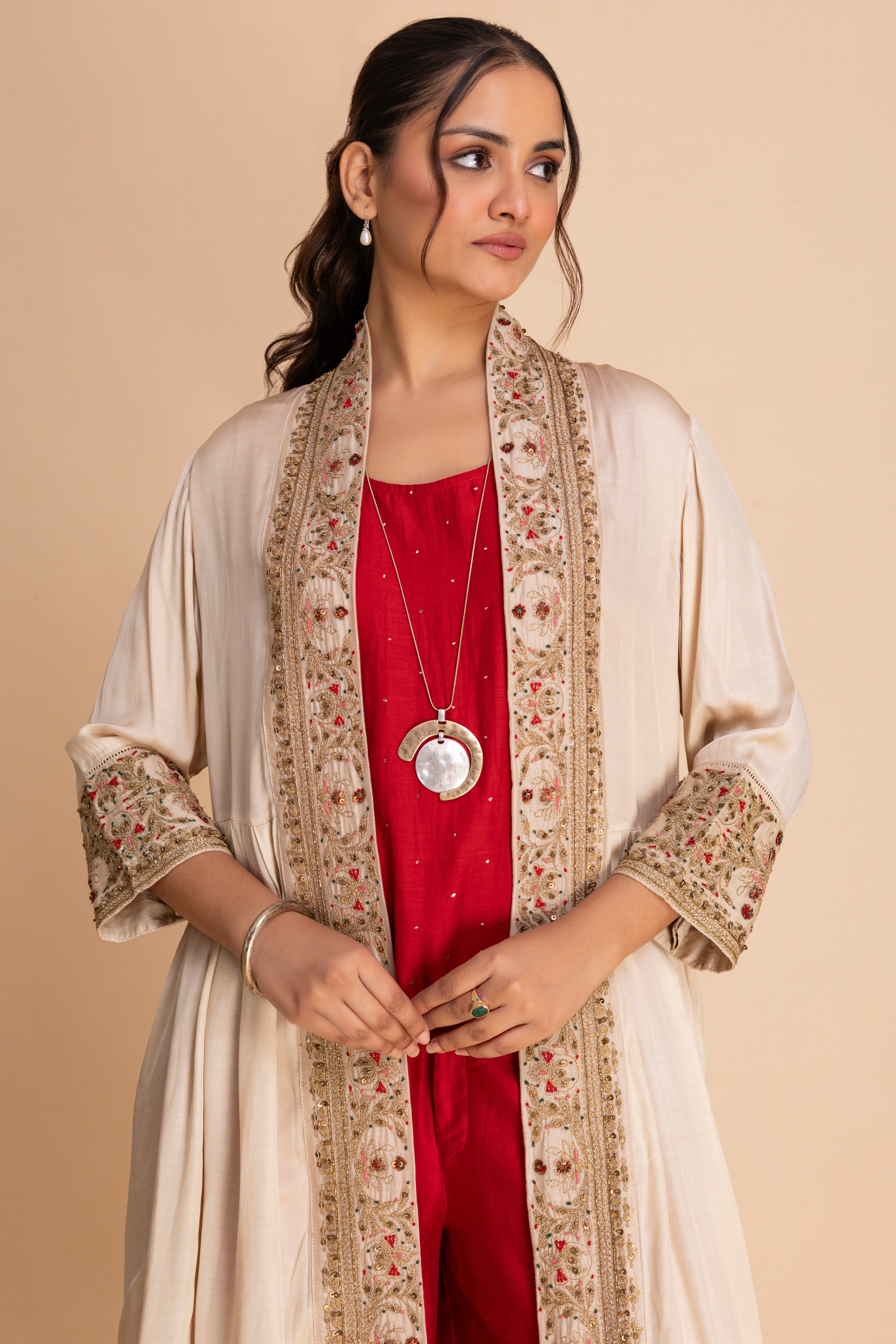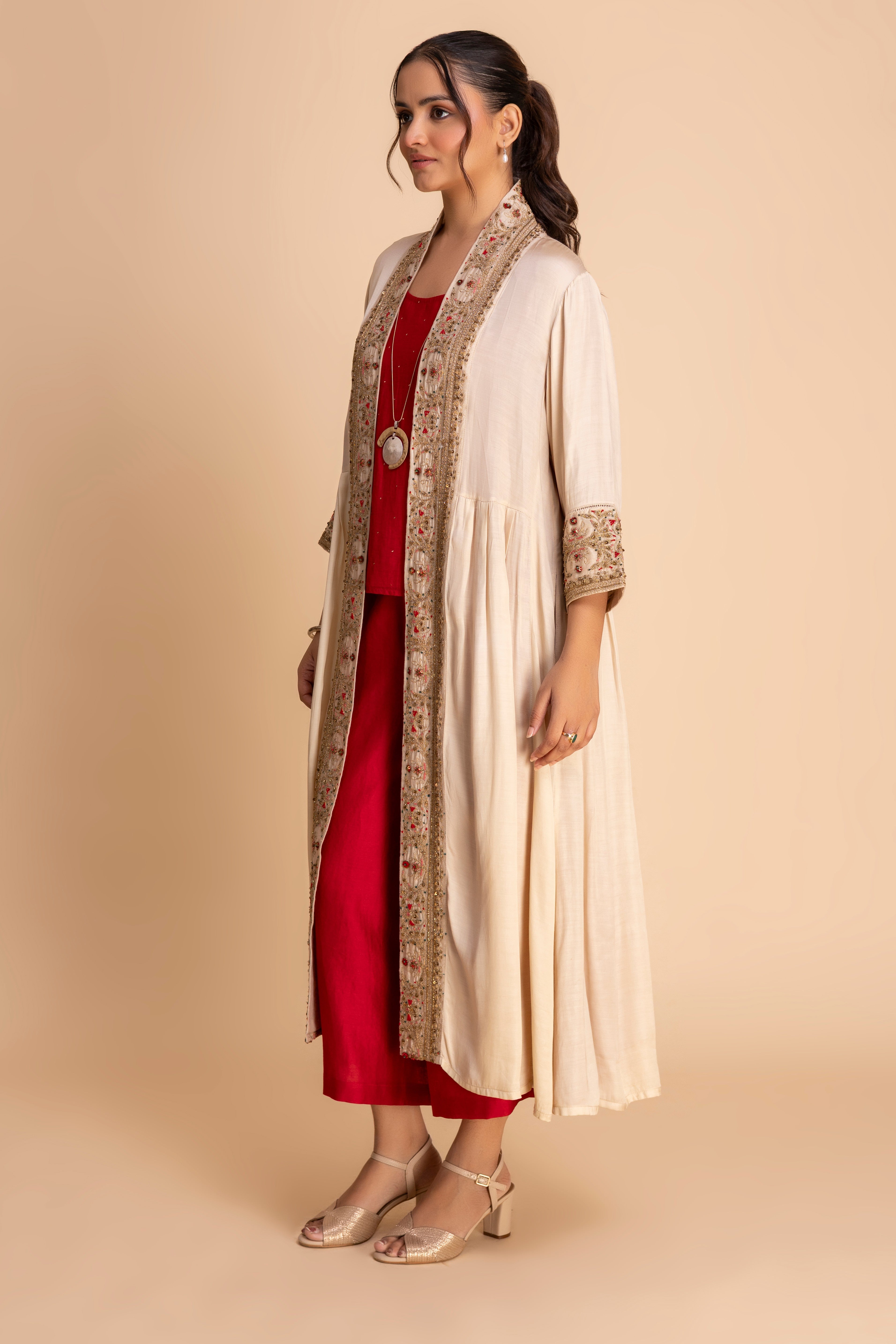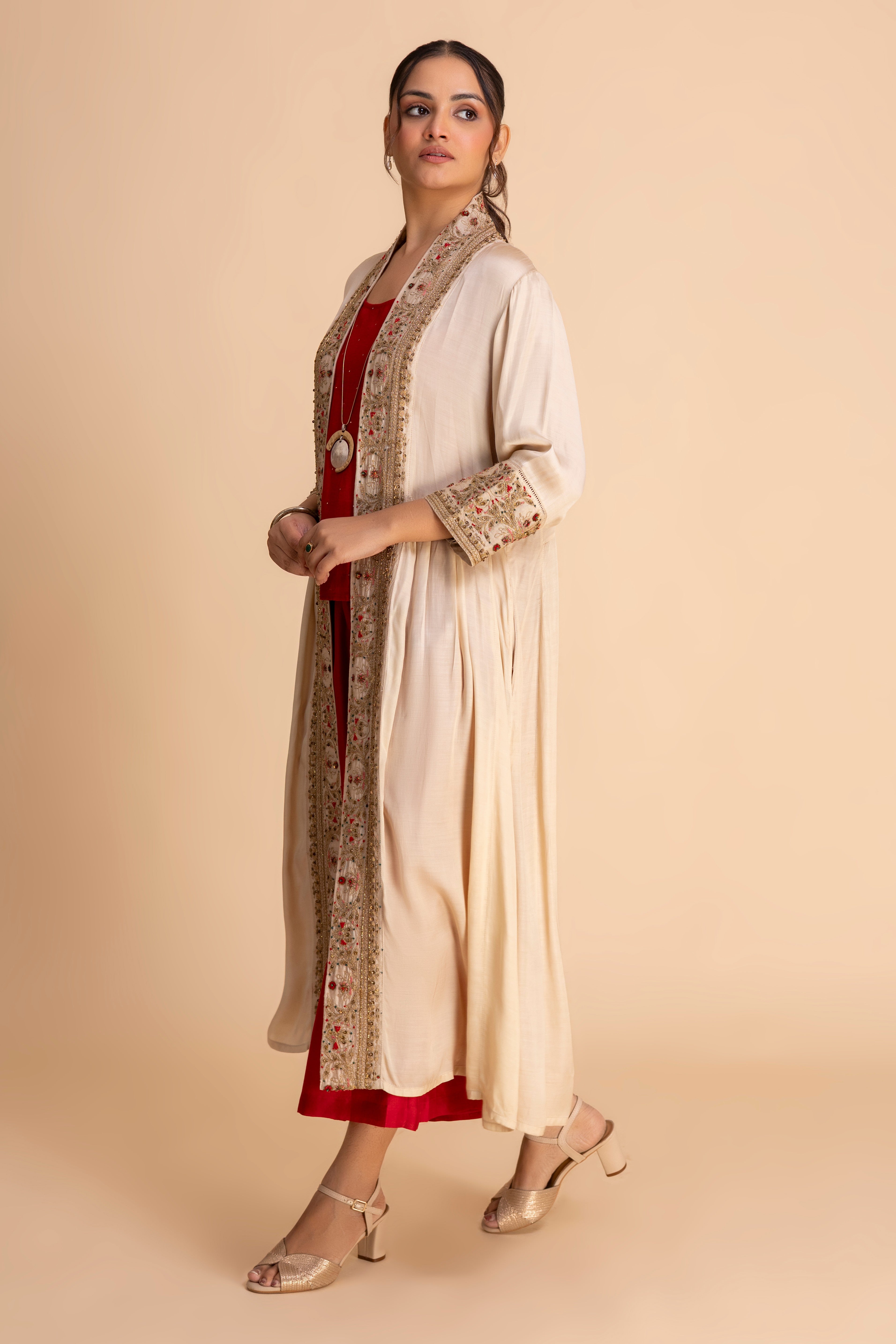 An elegant beige overlay adorned with intricate embroidery along the front and cuffs, layered over a rich red dress. The ensemble blends classic detailing with modern layering, making it perfect for festive and evening occasion.