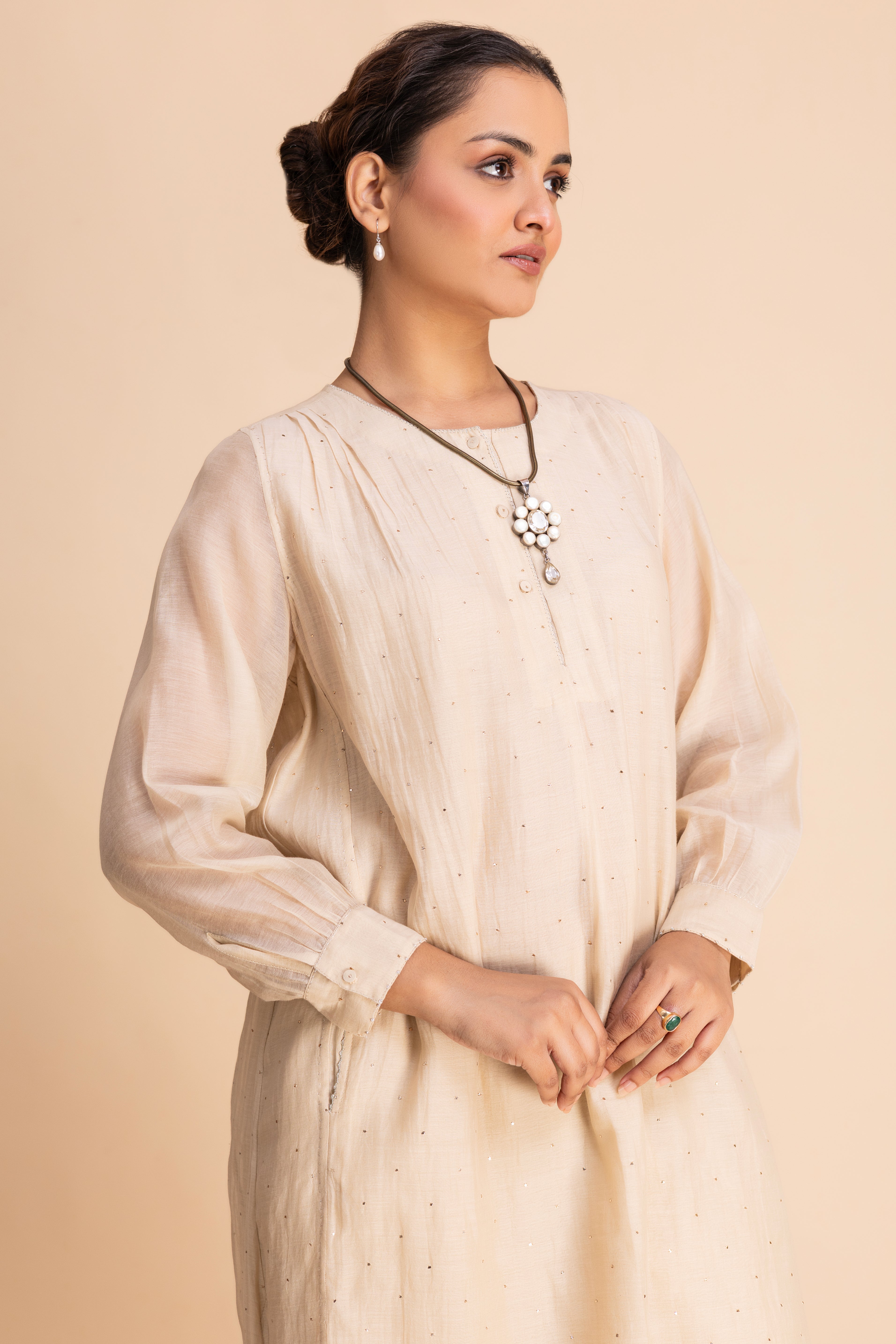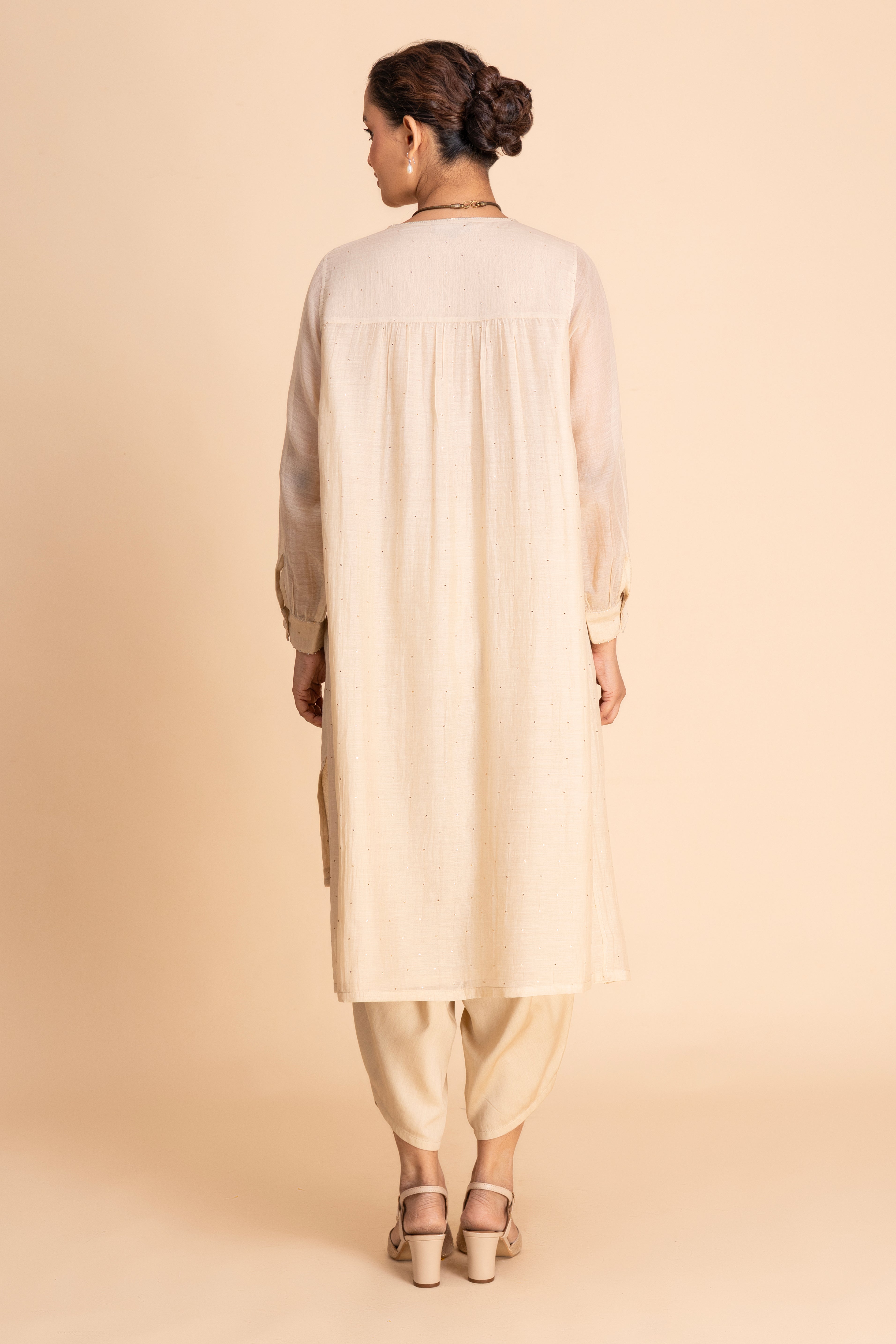 Elegant beige kurta set crafted from handwoven fabric, featuring a round neckline, full sleeves, and a high-low hem. Paired with cotton satin pants for a refined yet comfortable look perfect for festive or casual occasions.