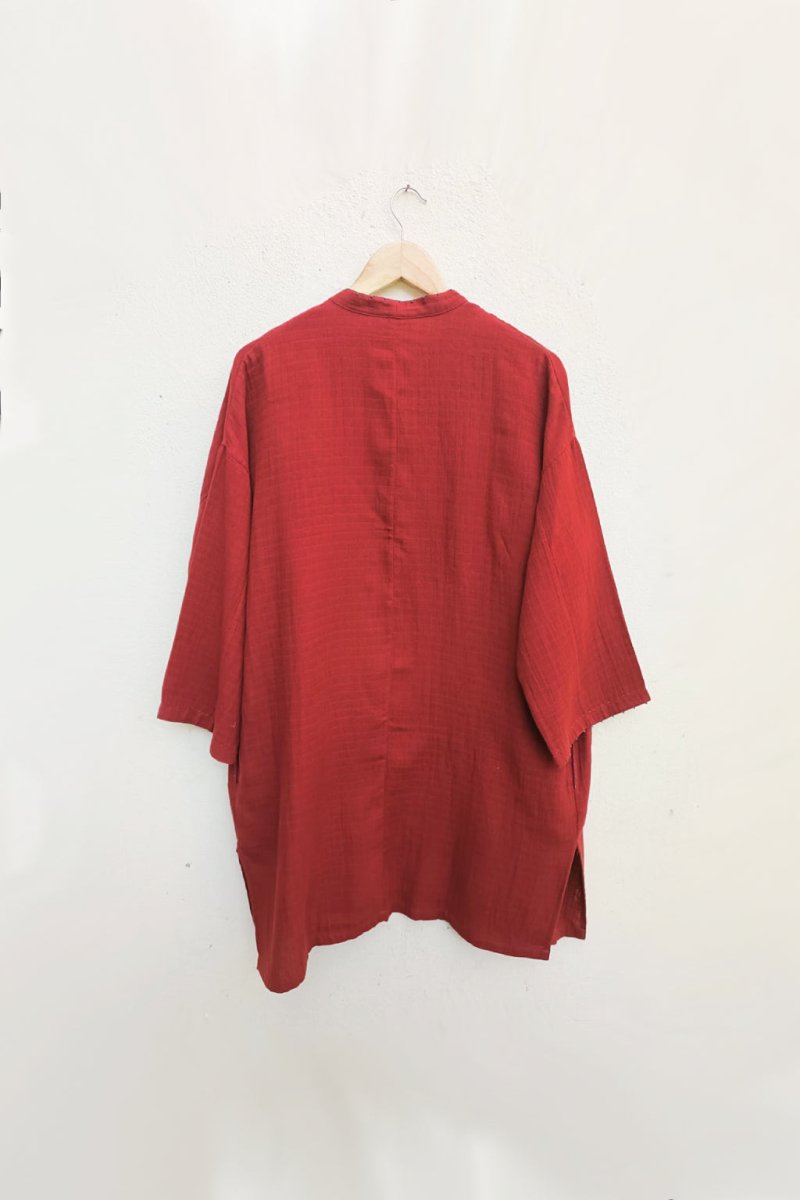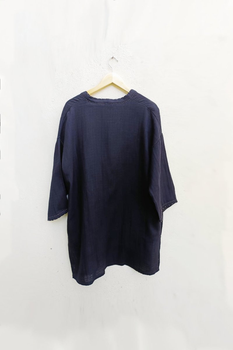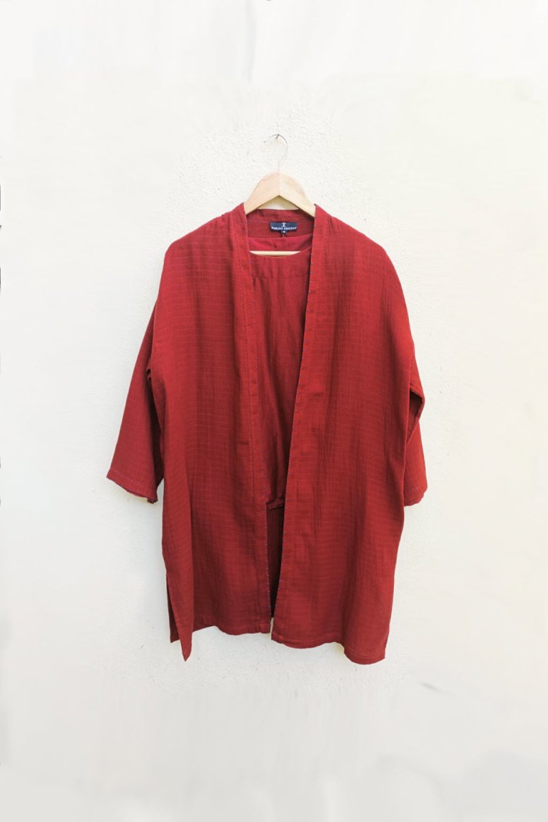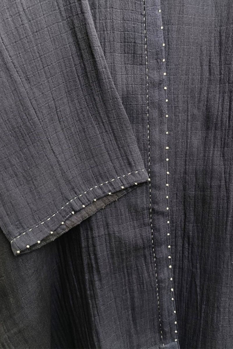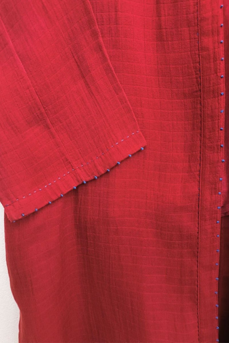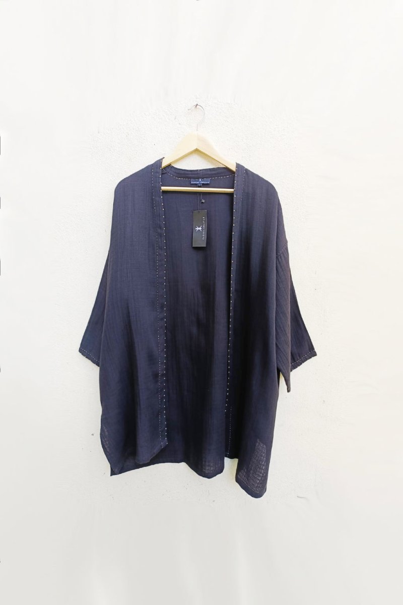 This Vanya cape made up of double gauze fabric has contrast thread detailing with a 3/4th sleeve.