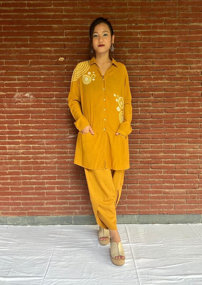 This shirt-style tunic showcases an elegant blend of tie-dye stitch techniques. It features small and large patterns along with circular and half-circular designs that lend a refined, artistic touch. The tunic includes uniquely designed front pockets and is paired with distinctive pants with a tulip-shaped bottom opening, adding a stylish twist to the overall look.